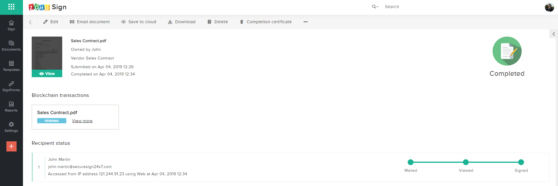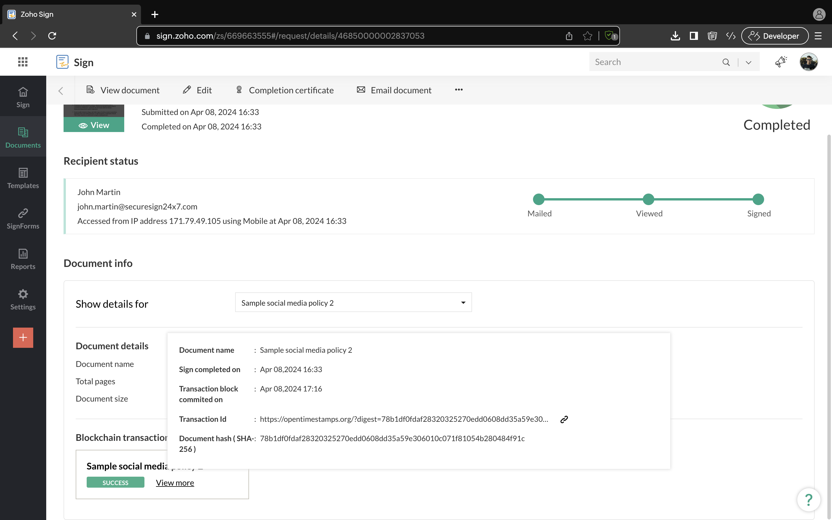 - For documents with successfully completion of all signing activity, the status of the associated Ethereum blockchain transaction can be seen in the document details page.