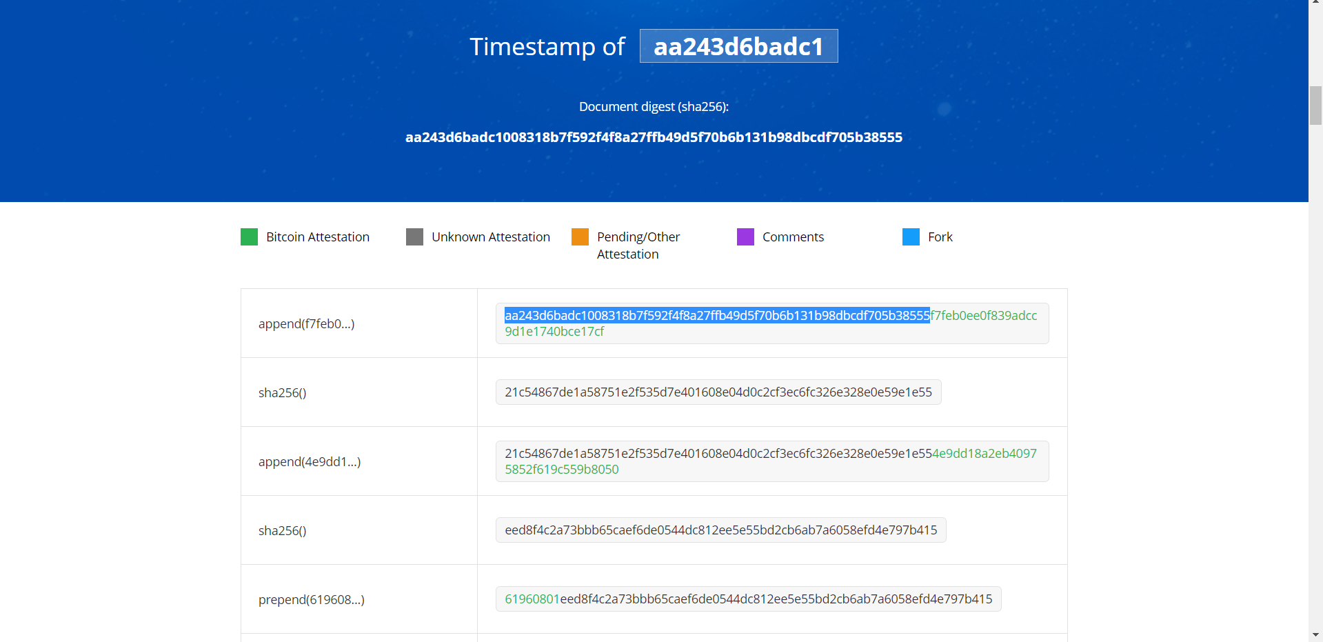 - For further verification, click the link icon in the transaction details box. This will take you to the website of the OpenTimestamps service, where you can view details such as the Bitcoin block ID where the aggregated document hashes were recorded.