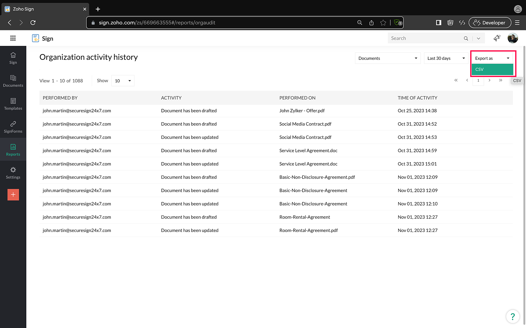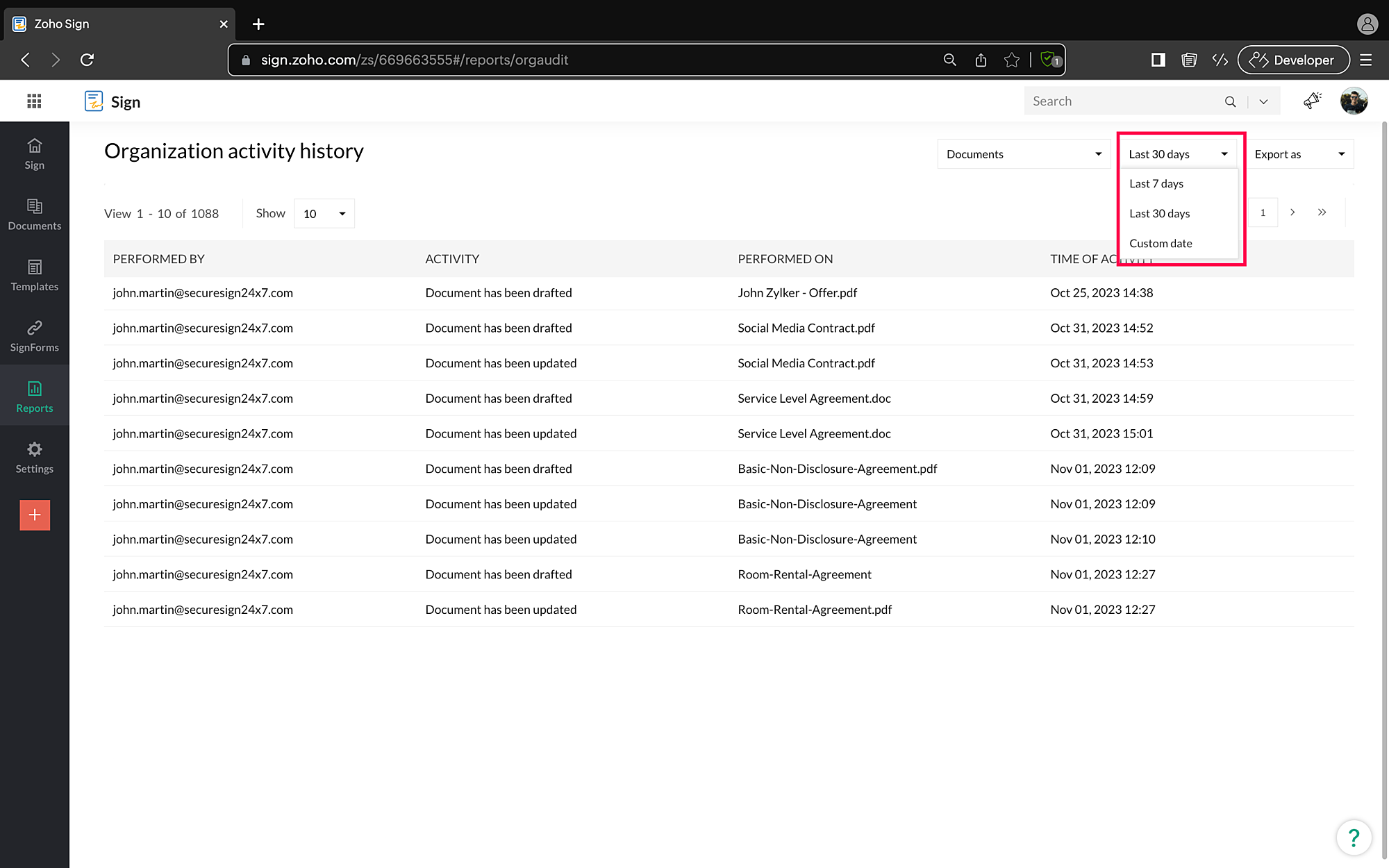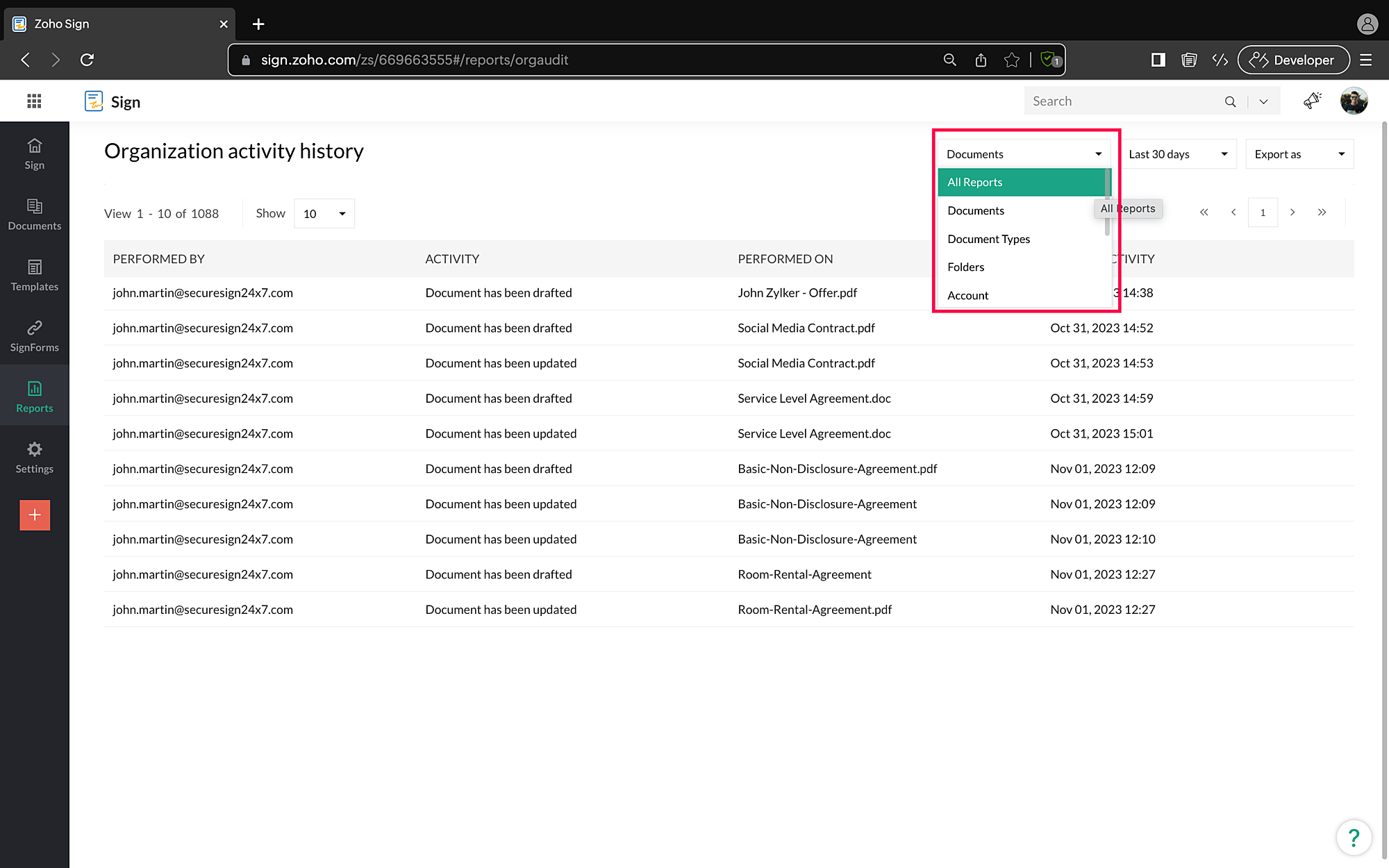 Documents | Document Added Document Deleted Document Drafted Document Updated Document Submitted Document Shredded Document Deleted Document Recalled Document Link Emailed Document Link Emailed for Signing Host Document Link SMSed Document Signing Started Document Inperson Signing Started Document Signing Success Document Inperson Signing Success Document Approved Document Signed Offline Document Approved Offline Document Signing Failure Document Inperson Signing Failure Document Completed Inperson Signing Session Completed Document Retrieved Document SMS Link Accessed Document Viewed Document Viewed From Host Document Archived Document Rejected Document Rejected By Inperson Document Forwarded Document Forwarded By Inperson Document Document Emailed Document Document Emailed To Host Document Downloaded Document Downloaded By Host Document Reminded Document Reminded For Inperson Signing Document Signing Skipped Document Signing Skipped By Inperson Document Access Success Document Access Failure Document Inperson Access Failure Document Restored Document Expired Document Extended Recipient Reassigned Recipient Signing Permission Revoked Recipient Signing Permission Granted Document Ownership Changed Document Agreed to Terms of Signing Document Audit Download Document Field Data Download Document Email Reminders Unsubscribed Document Manually Signed by Owner Document Manually Signed by Signer Manual Signing Approved By Owner Document USB Signing Initiated by Signer Document USB Signing Completed Document USB Signing Failed Document Cloud Signing Initiated by Signer Document Cloud Signing Completed Document Cloud Signing Failed Document Agreed to Terms of Cloud Signing Authentication via EU eID initiated Authentication via EU eID failed Authenticated via EU eID Signature Field is Authorised |