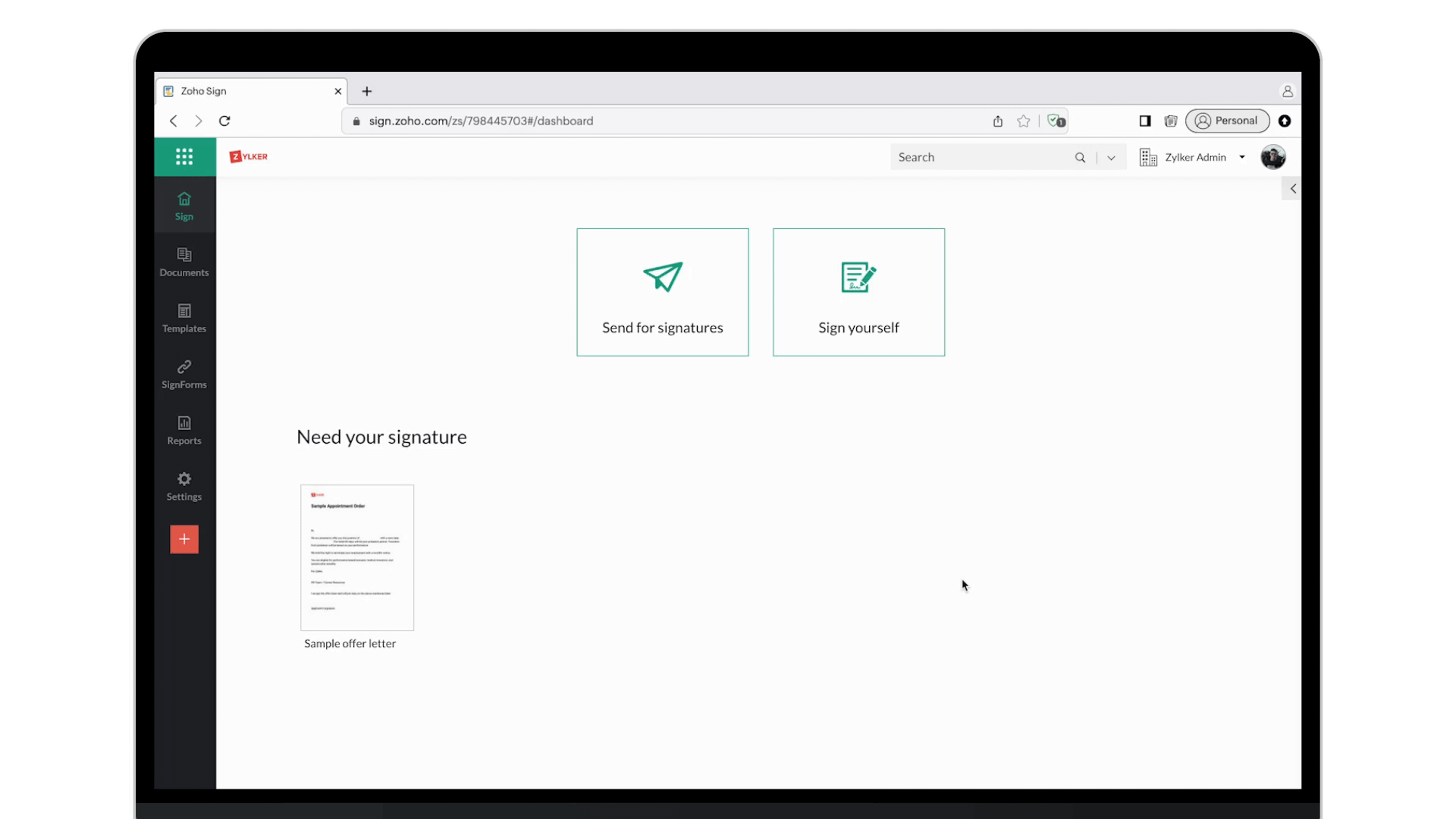 - From your Zoho Sign dashboard, go to Settings.