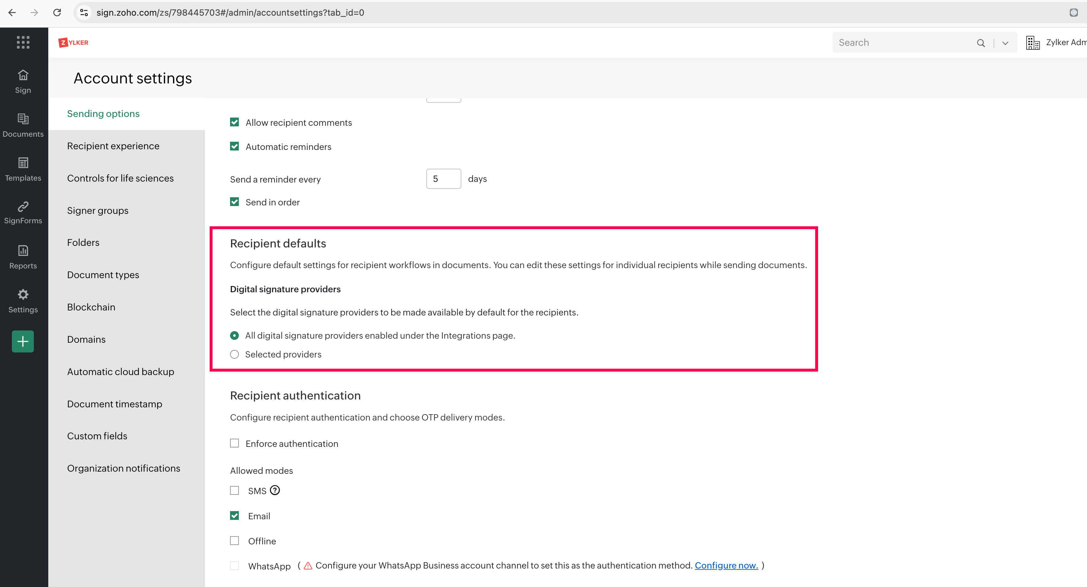 Administrators can configure default digital signature providers for recipient workflows in document. To do so: