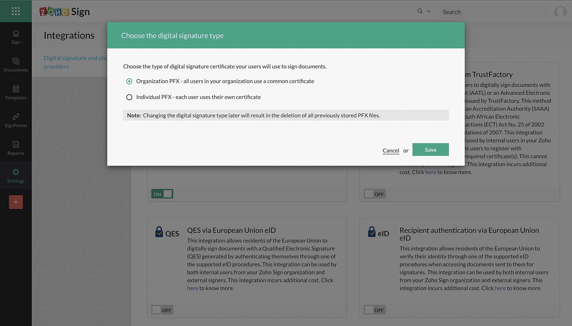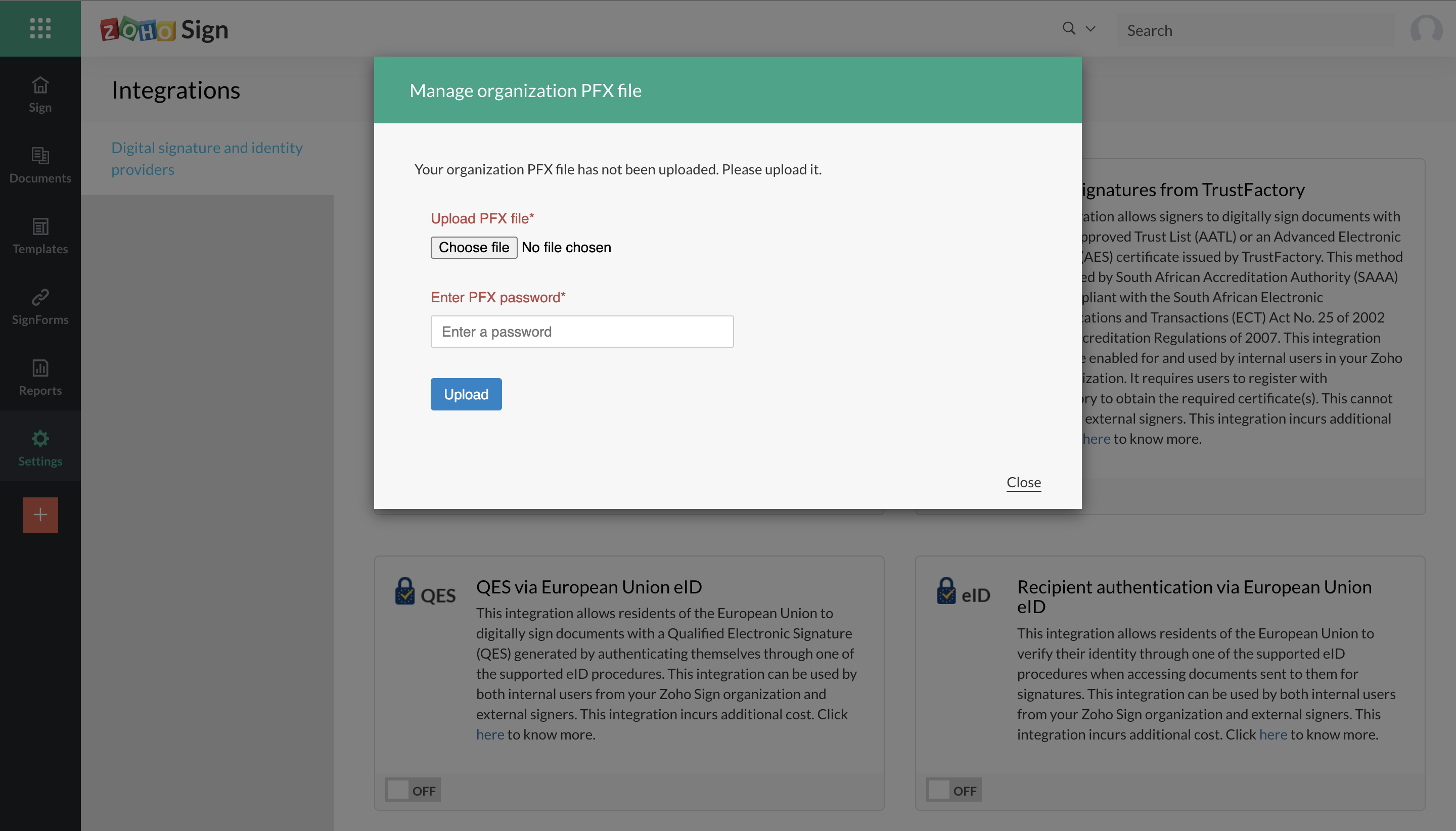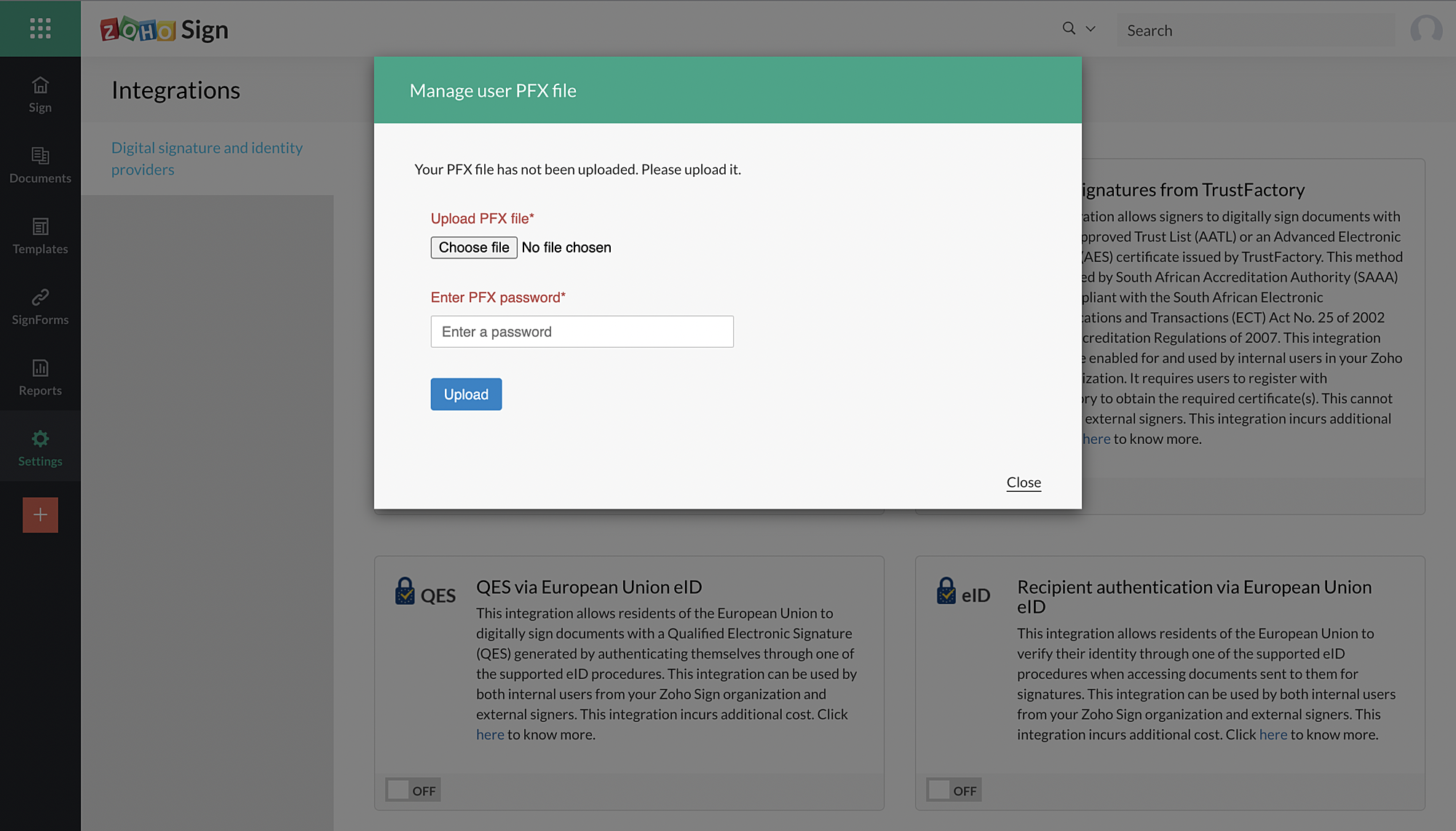 This action can only be performed by administrators. Follow the below steps to enable PFX signing in your Zoho Sign setup.