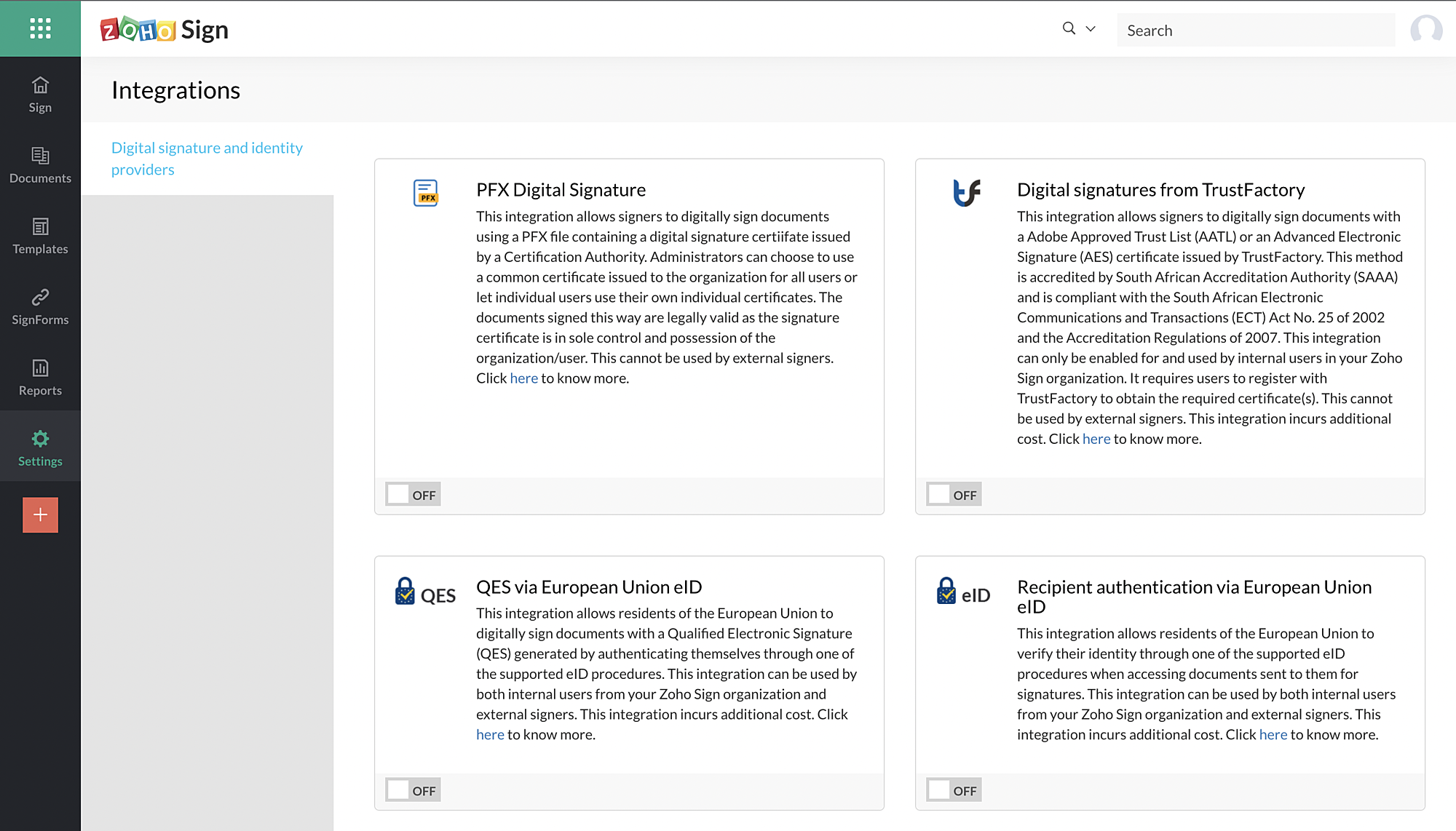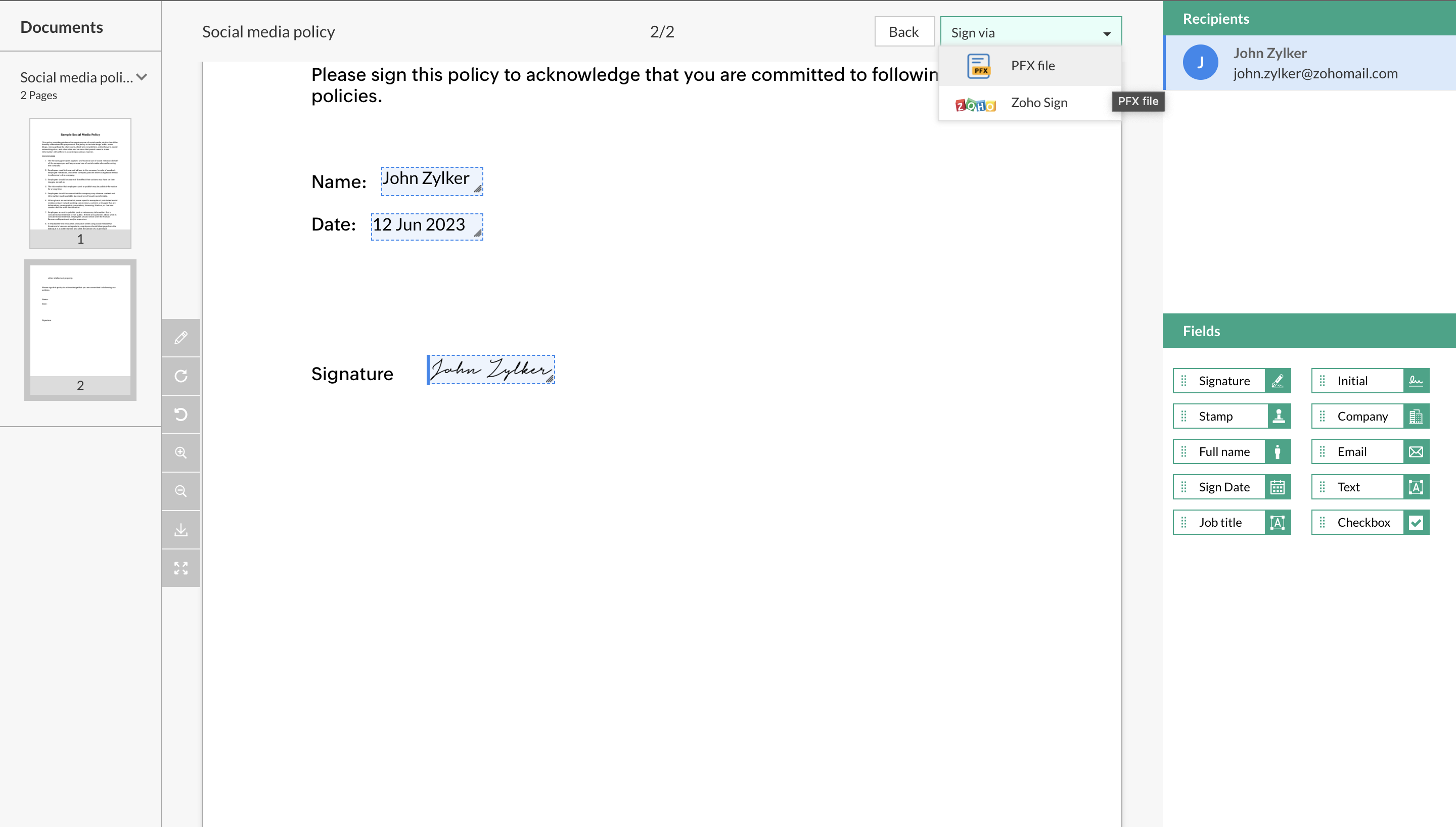 Zoho Sign now offers digital certificate-based signatures in PFX format to help businesses in regulated industries sign documents with highest level of compliance. This also ensures document authentication and integrity.