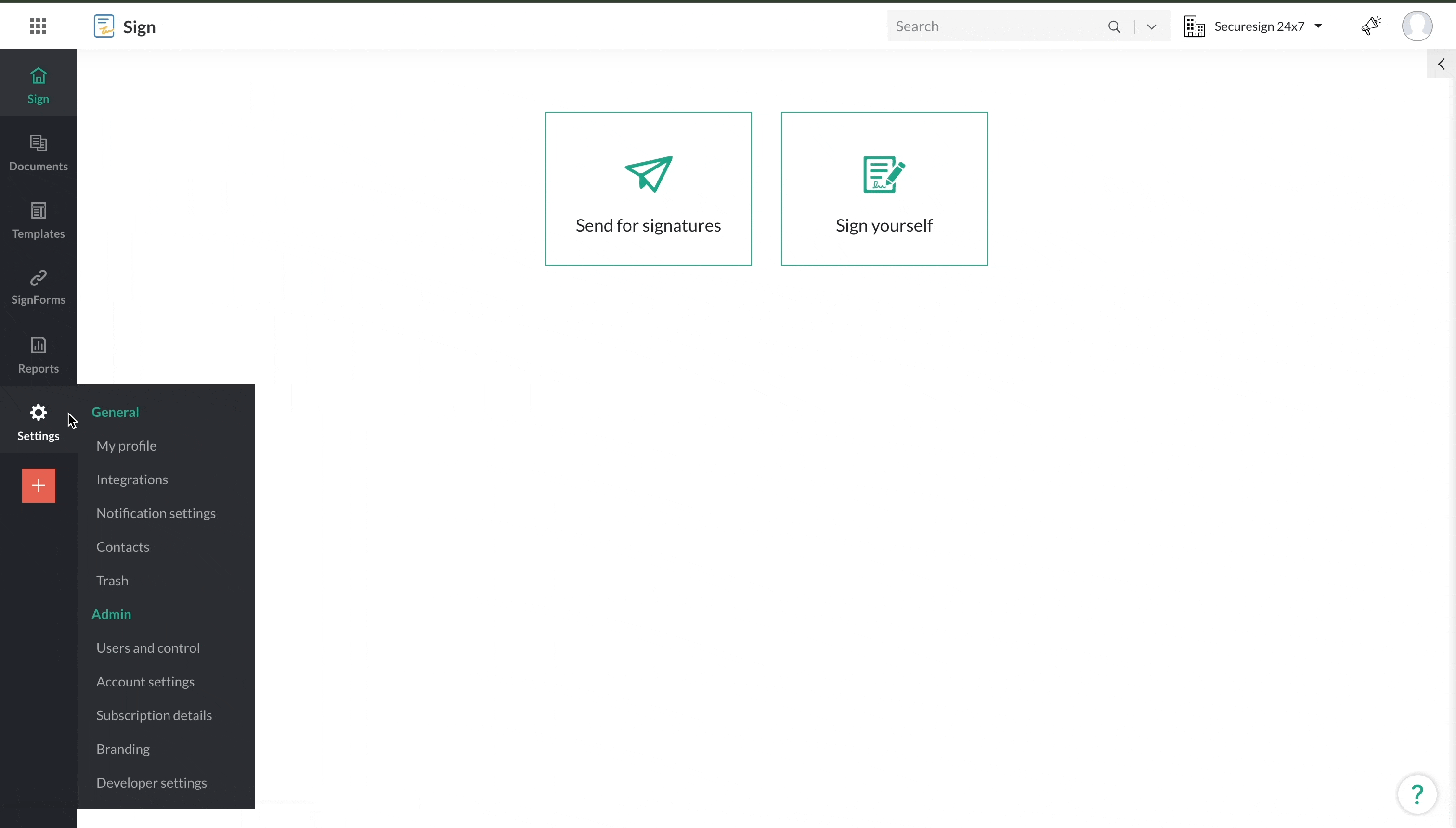 1. From your Zoho Sign dashboard, hover on Settings and click Integrations.