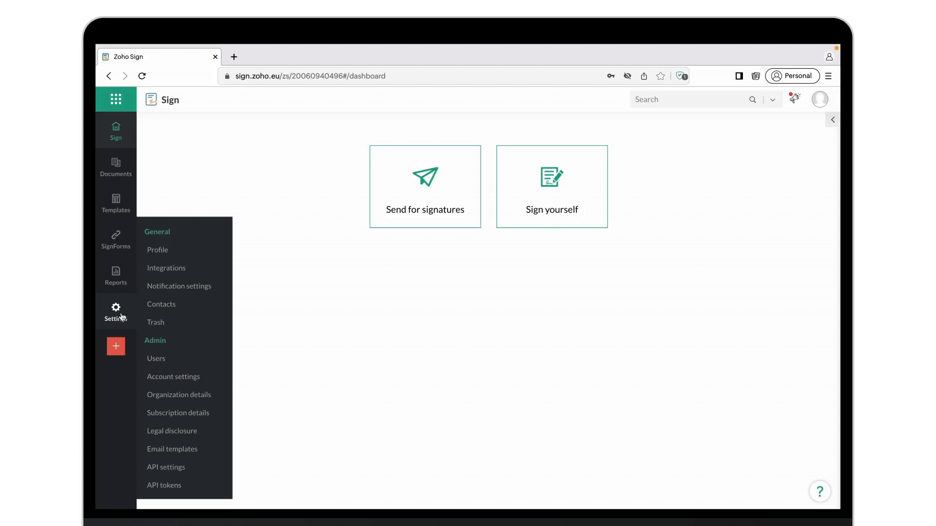 1. From your Zoho Sign dashboard, hover over the Settings tab and select Integrations.