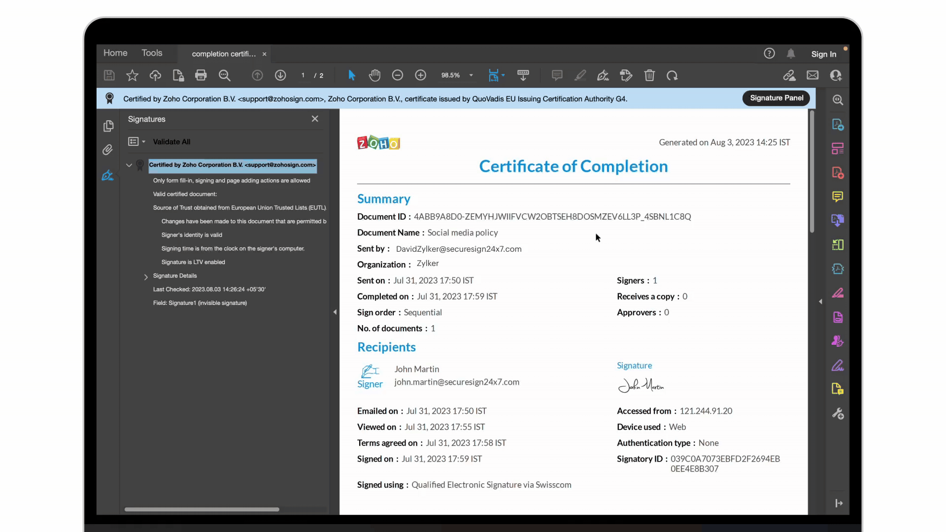 With Zoho Sign's integration with Swisscom, a leading qualified trust service provider (QTSP) for Switzerland, you can digitally sign documents with qualified electronic signatures (QES).