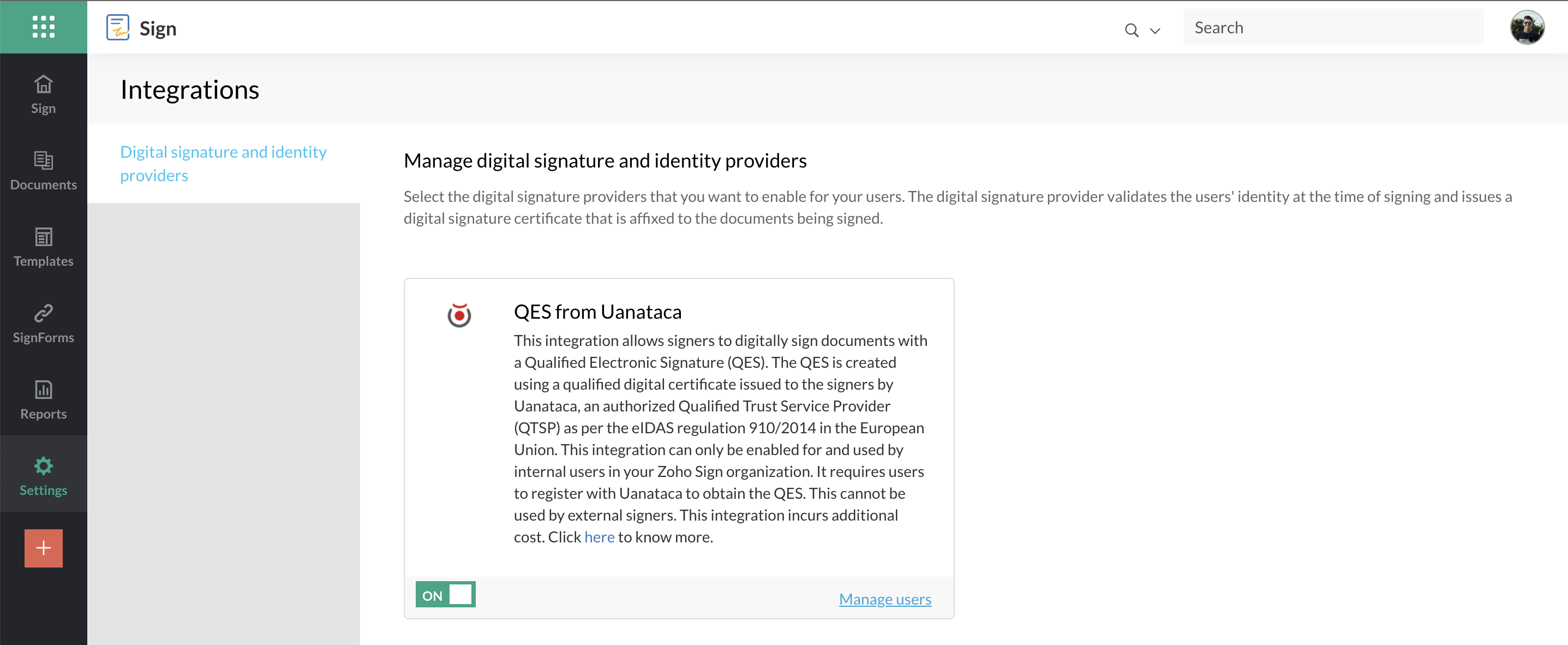 Senders can now enforce their signers to sign the business documents only with Uanataca sent from Zoho Sign.