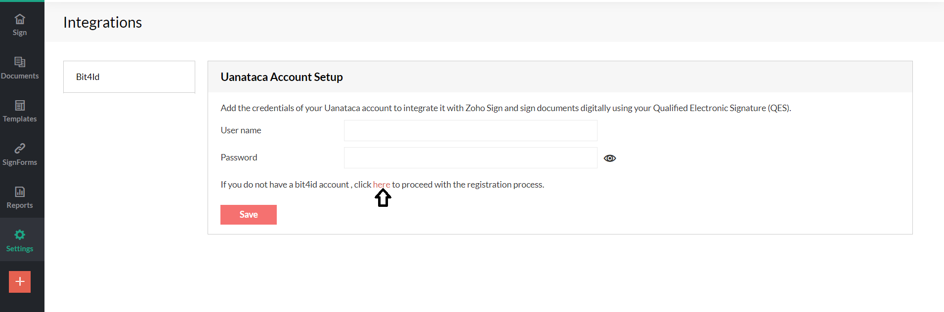 3. Enter the credentials to integrate Uanataca with Zoho Sign to digitally sign the documents using your Qualified Electronic Signature (QES).