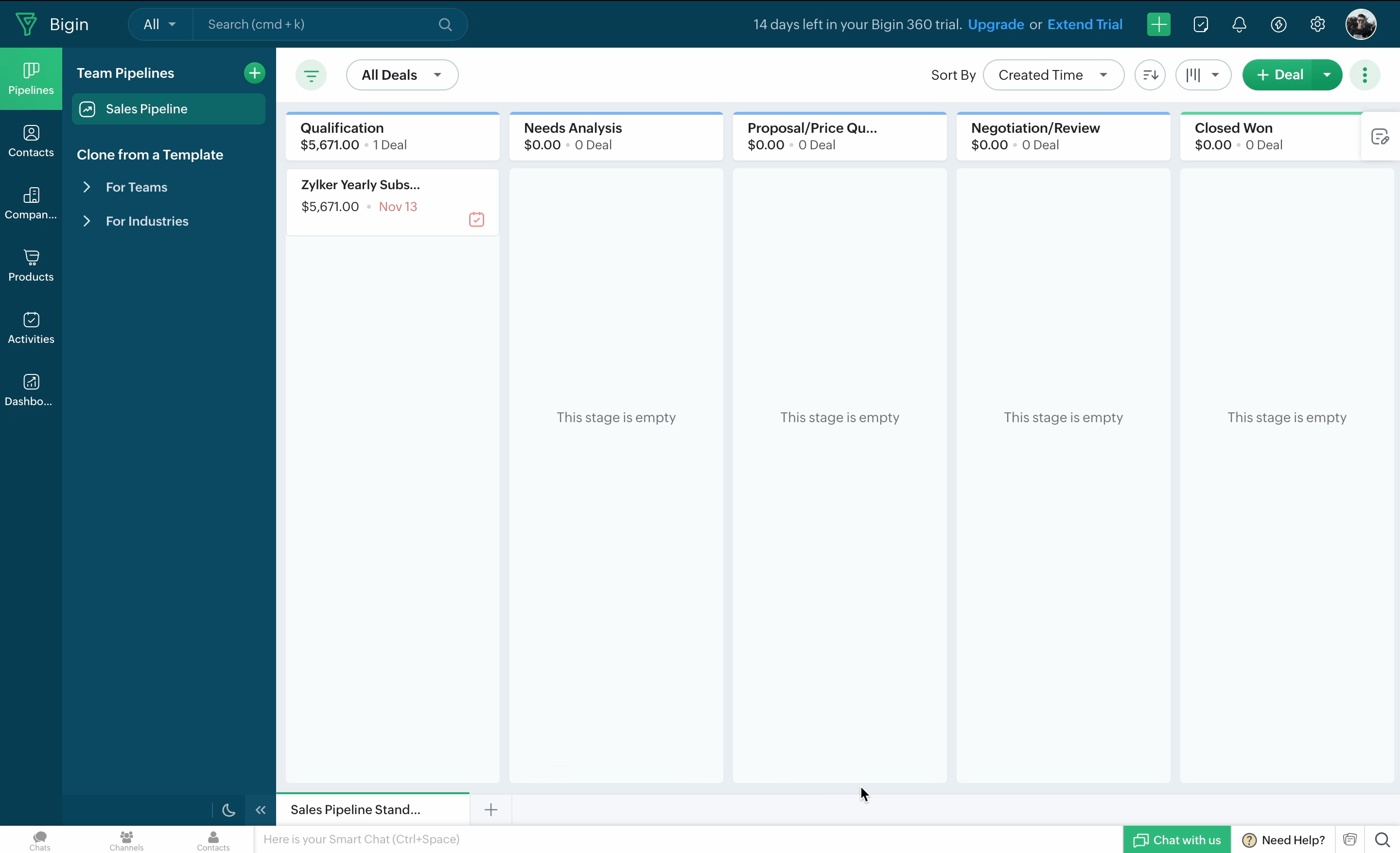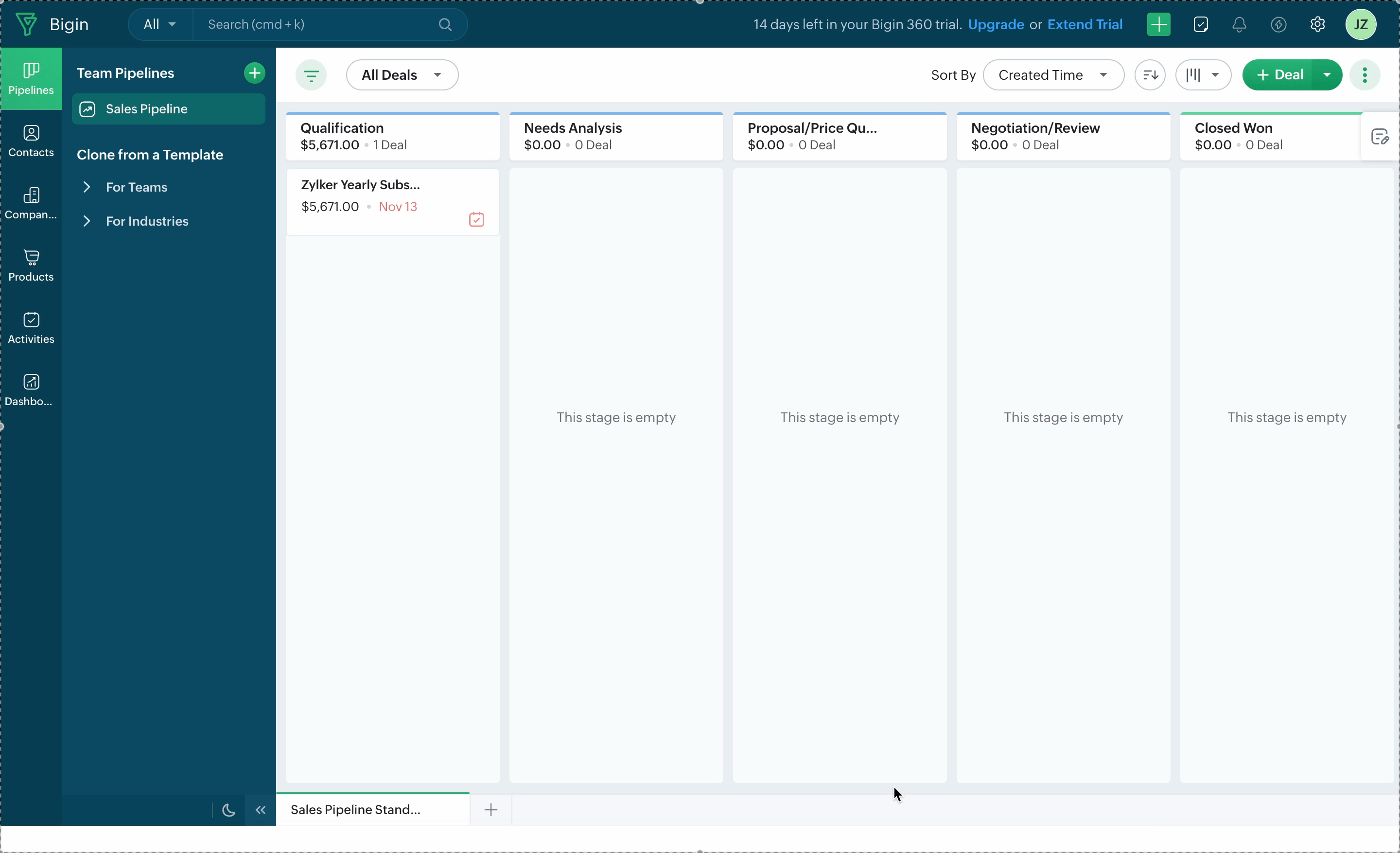 Upon successful installation of the Zoho Sign extension, the details pages of Pipelines, Contacts, and Companies will have the Zoho Sign button. This button can be used to send documents, Bigin attachments, and Zoho Sign templates for signature directly from your Bigin dashboard.
