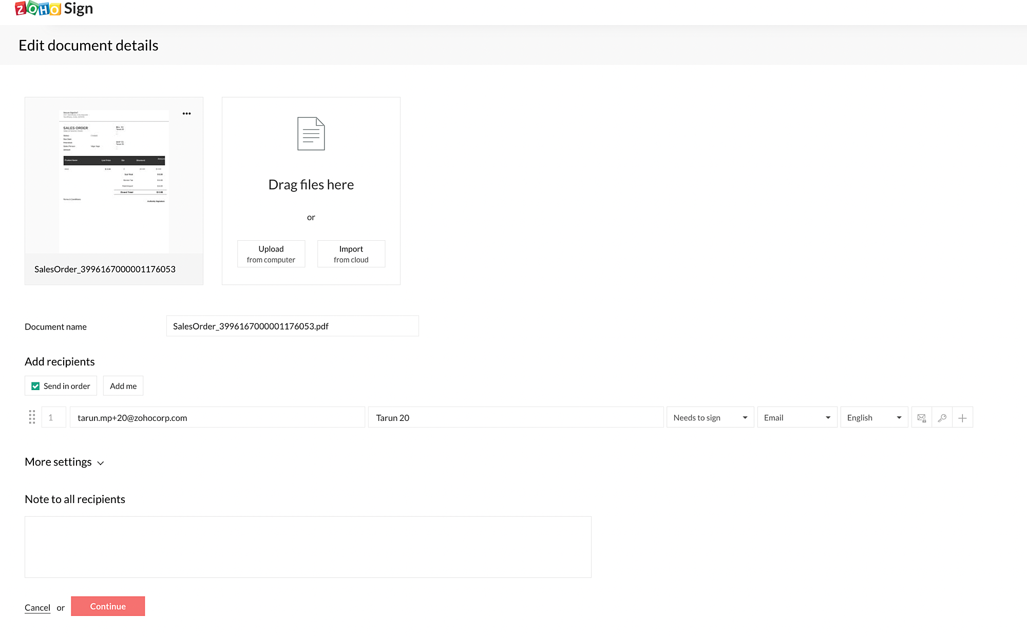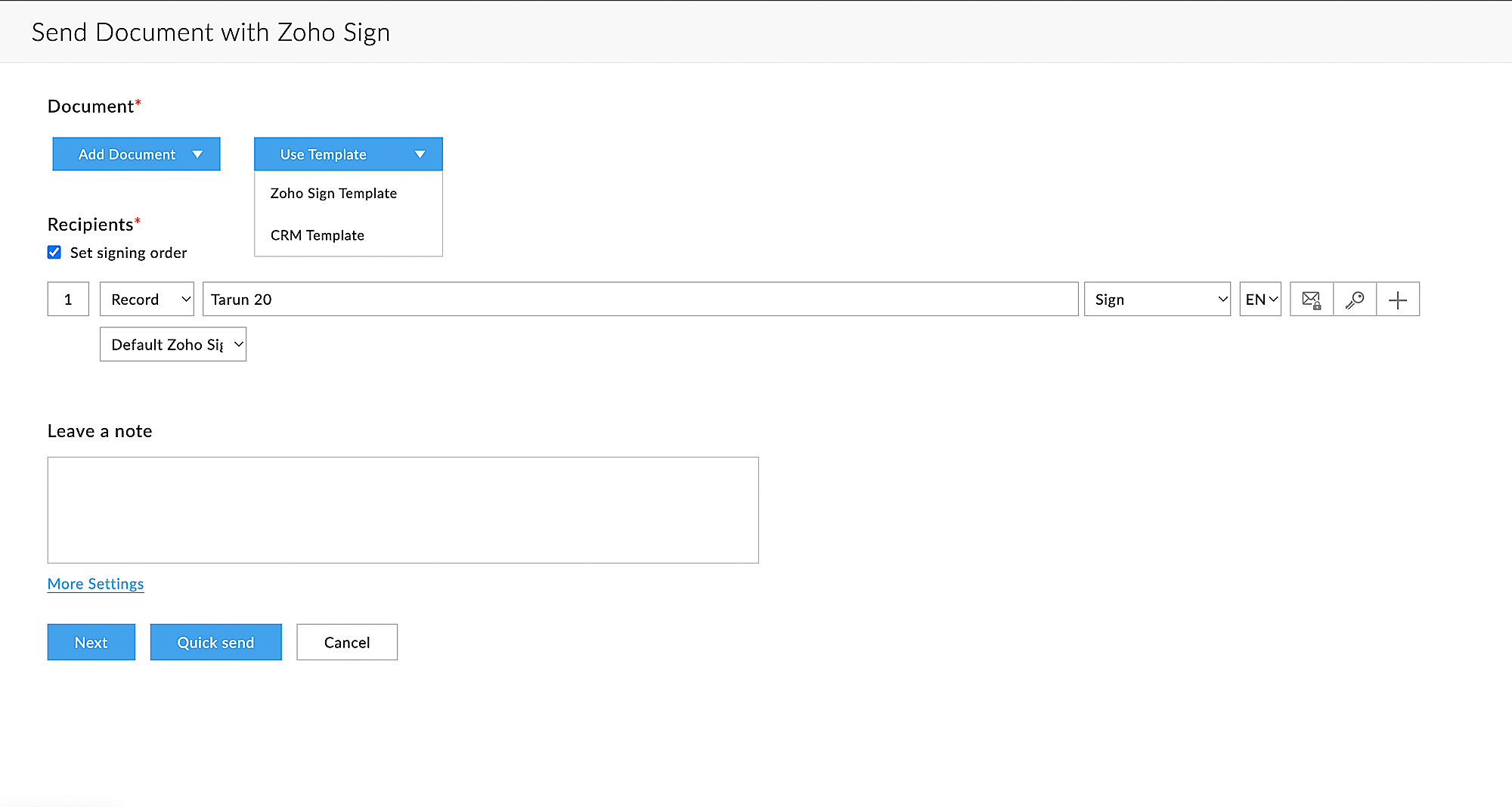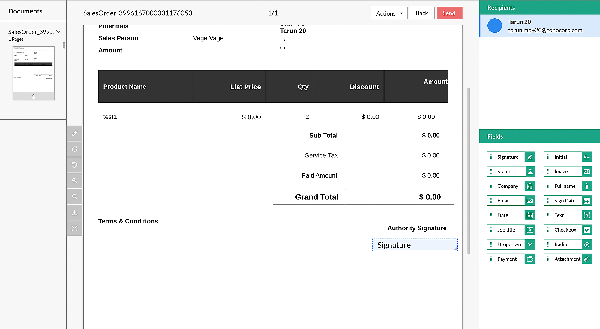 7. Click Send with Zoho Sign.