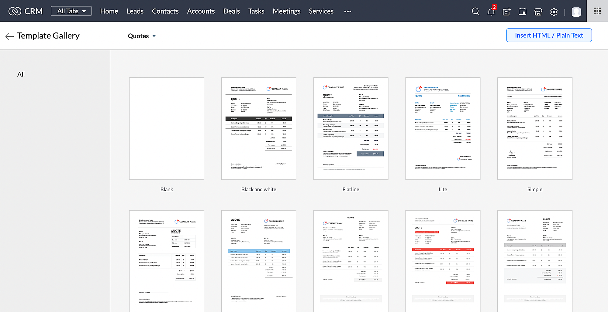 Zoho CRM provides inventory templates that help you send customized quotes, purchase orders, sales orders, and more. As part of the customization, you can use the drag-and-drop function to add fields, add a company logo, and even attach a signature available as a merge field in the user's section.