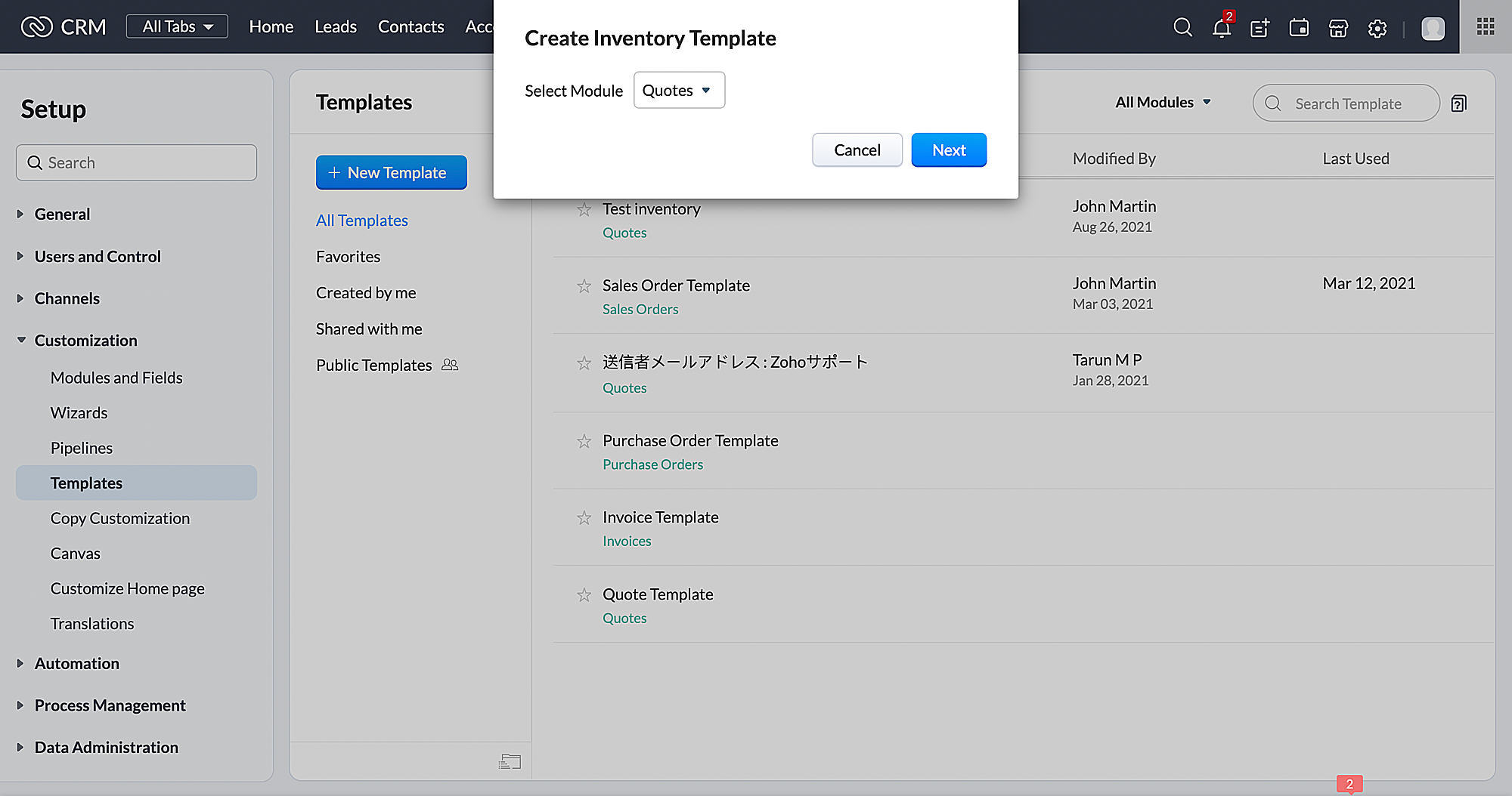 Sending inventory templates in Zoho CRM