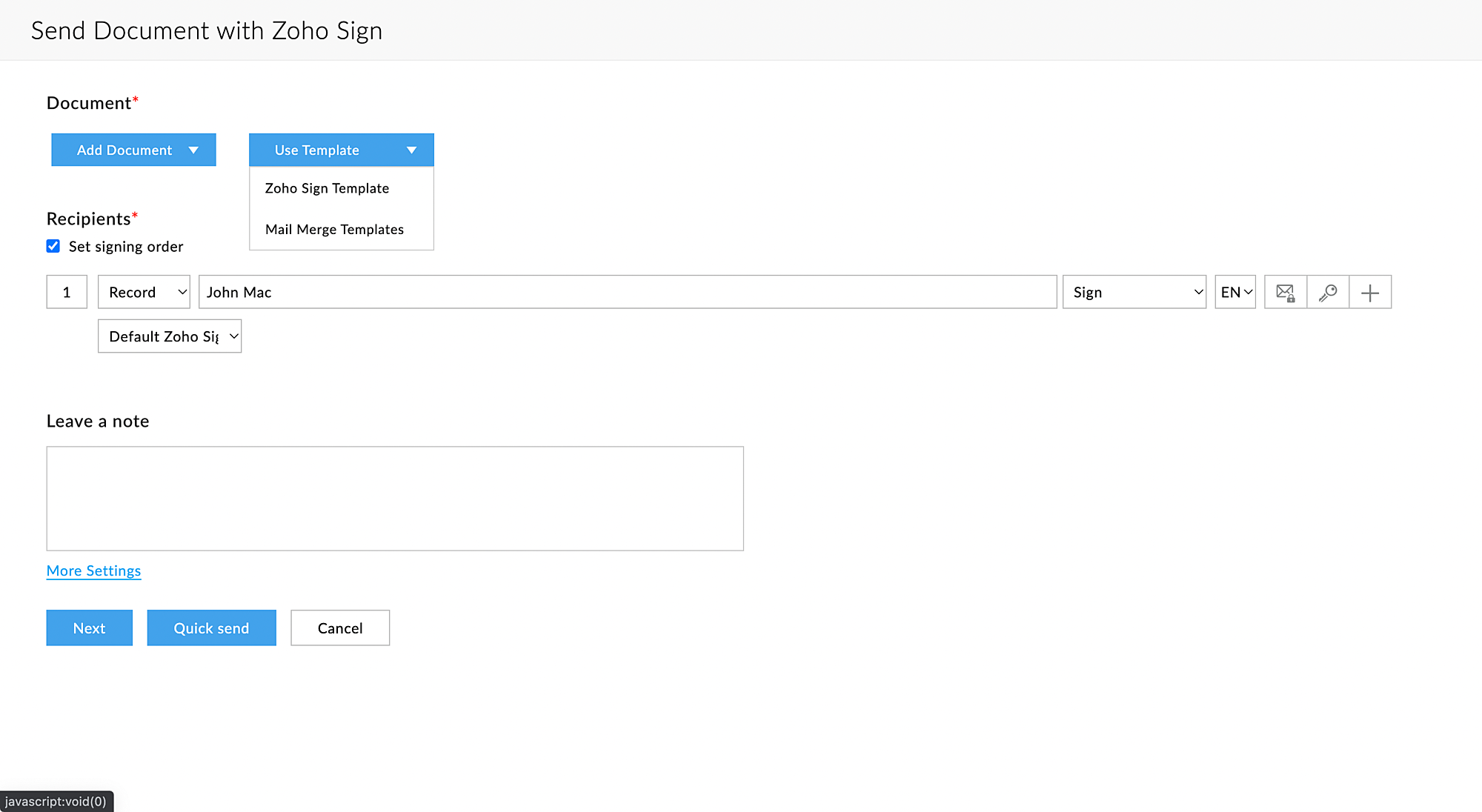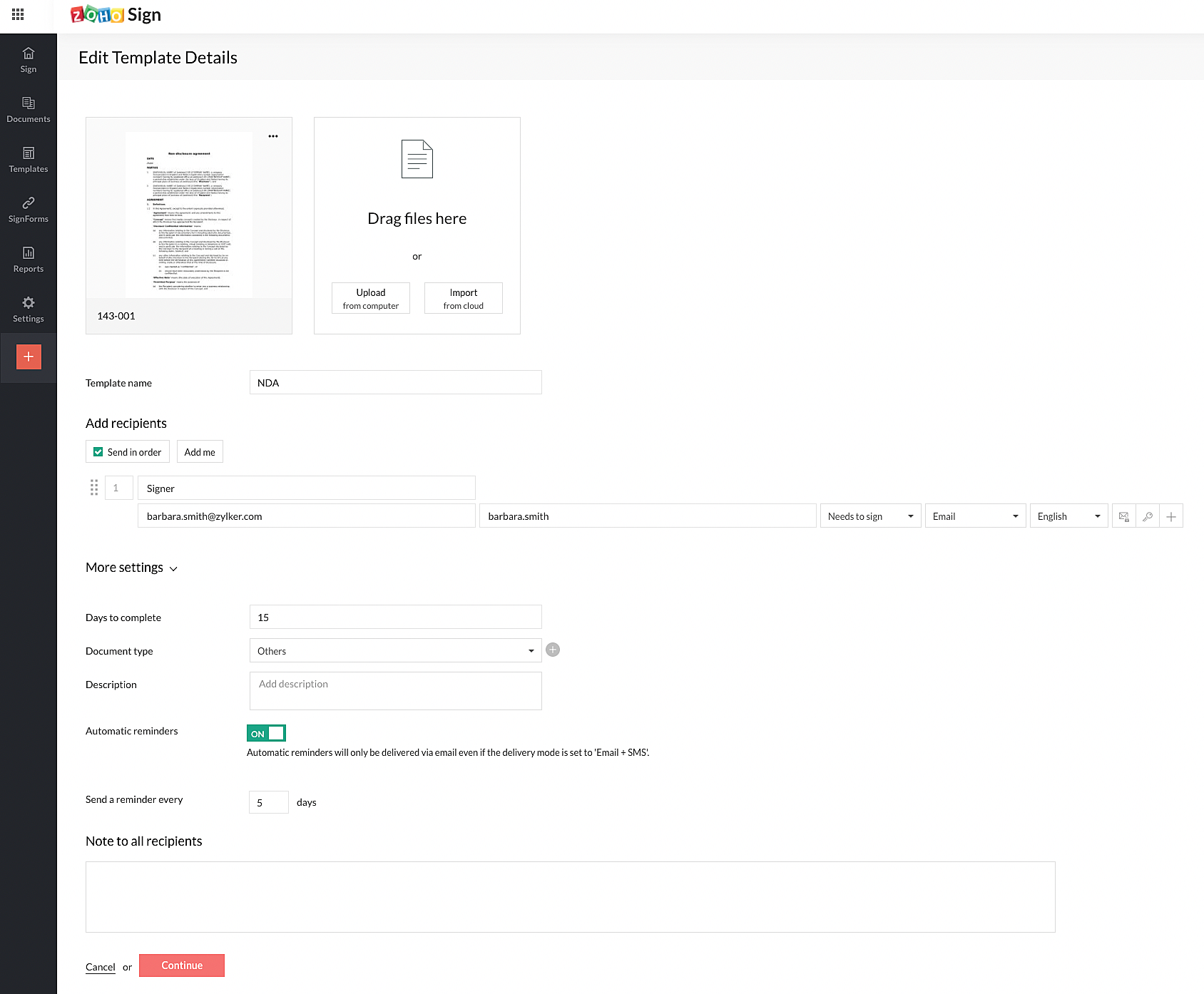 We often use one common format for a particular type of document. For example, in every company, there will be one NDA document to be signed by all new employees and vendors. For scenarios like this, you can integrate Zoho CRM and Zoho Sign and use the templates feature in Zoho Sign to upload the NDA document once, add necessary fields, create an NDA template once, and save a lot of time spent drafting and sending signature requests for the same type of document again.