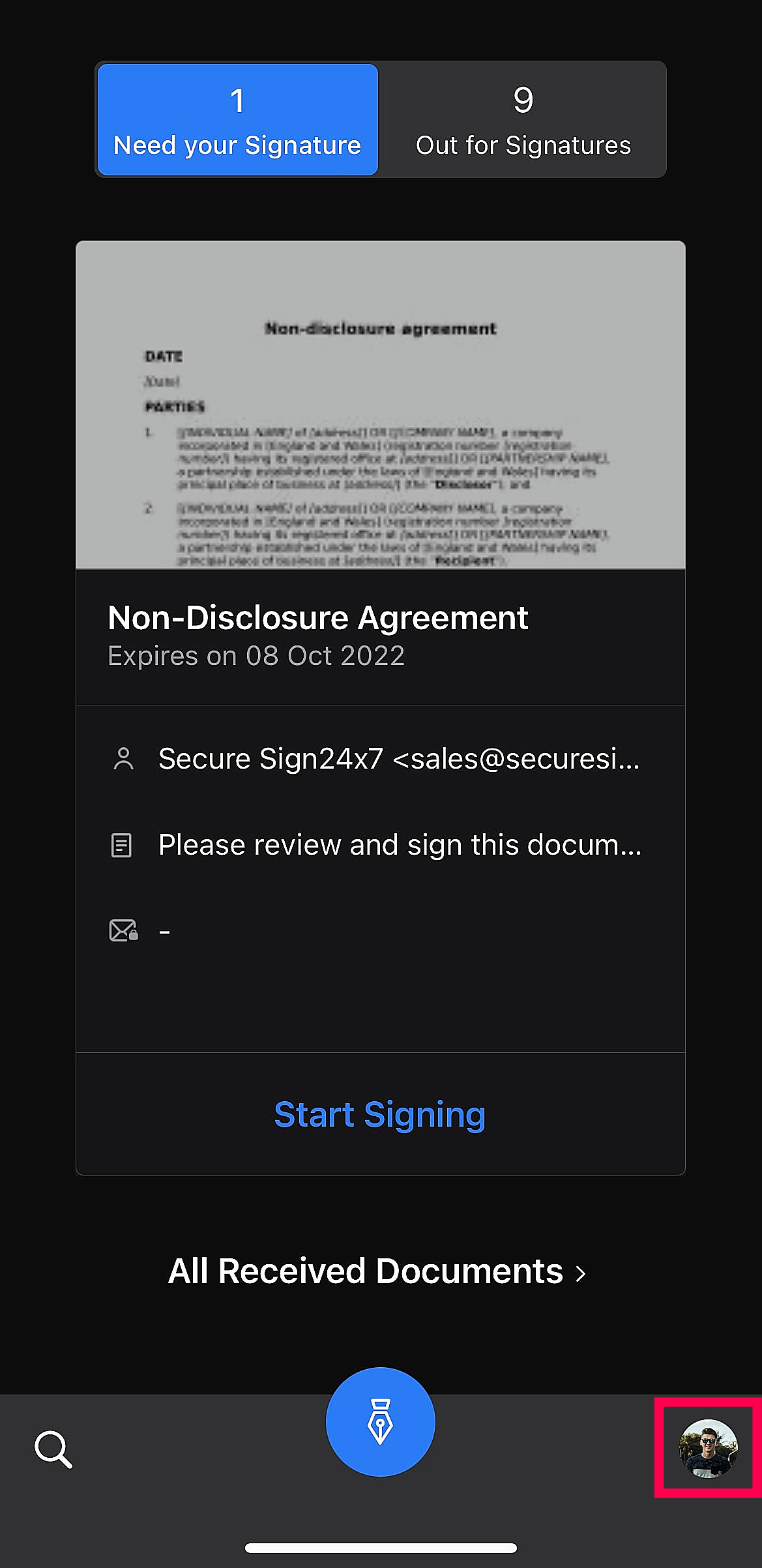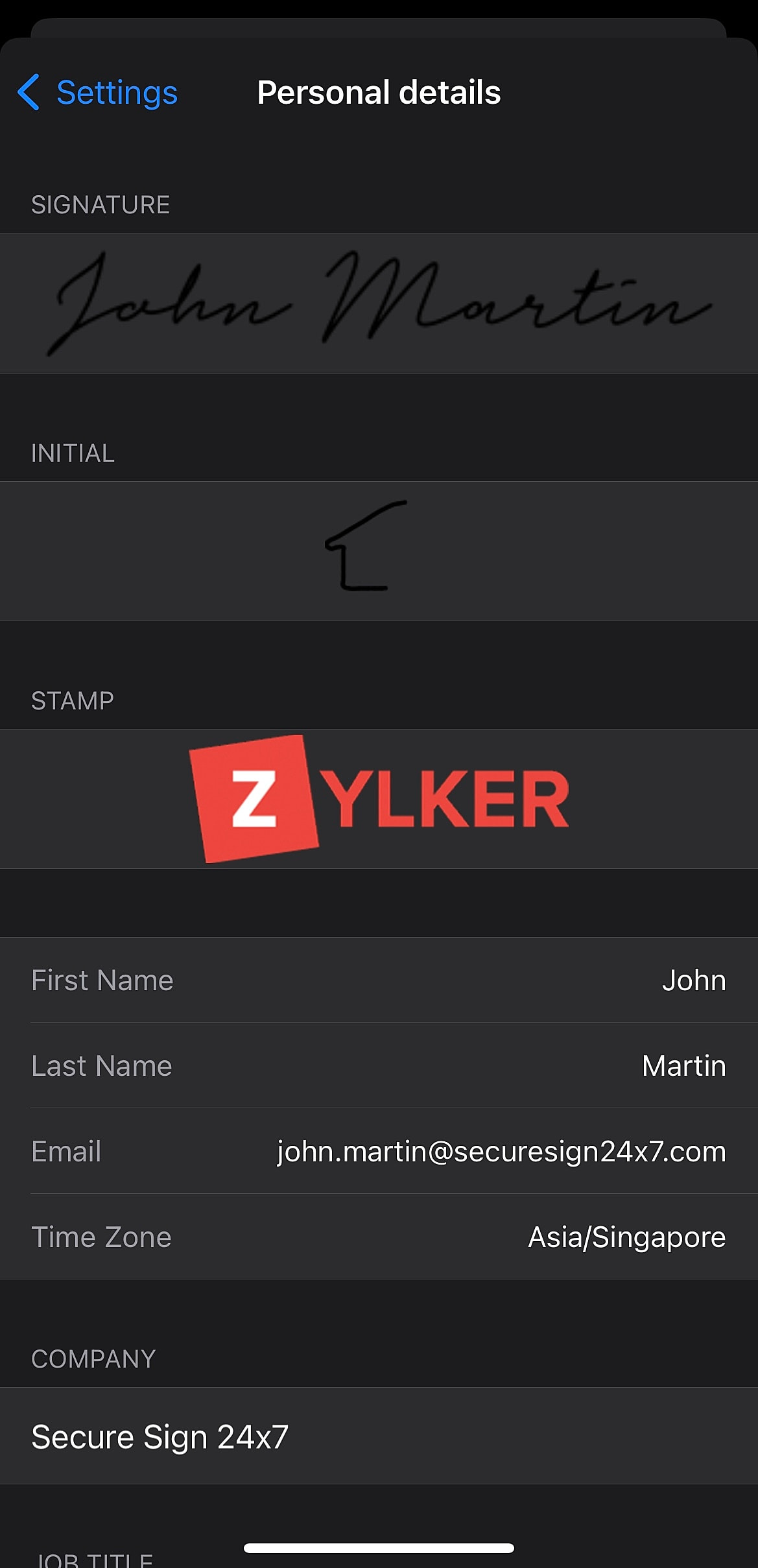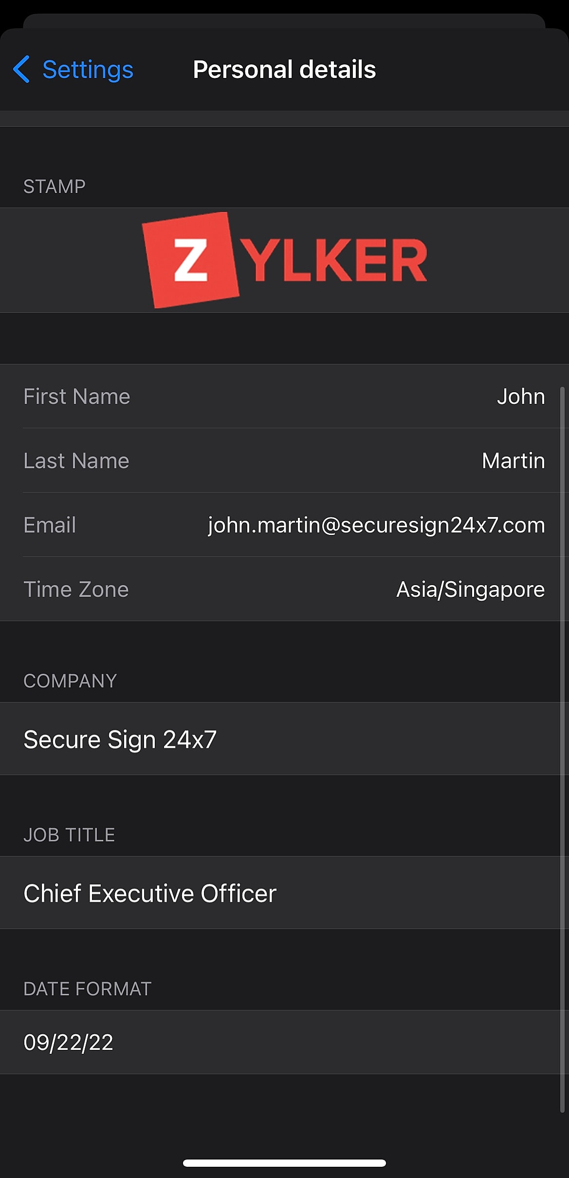 - Tap the Account tab to set up your profile. You can set your signature, initial, stamp, name, email address, time zone, company, job title, and preferred date format here.