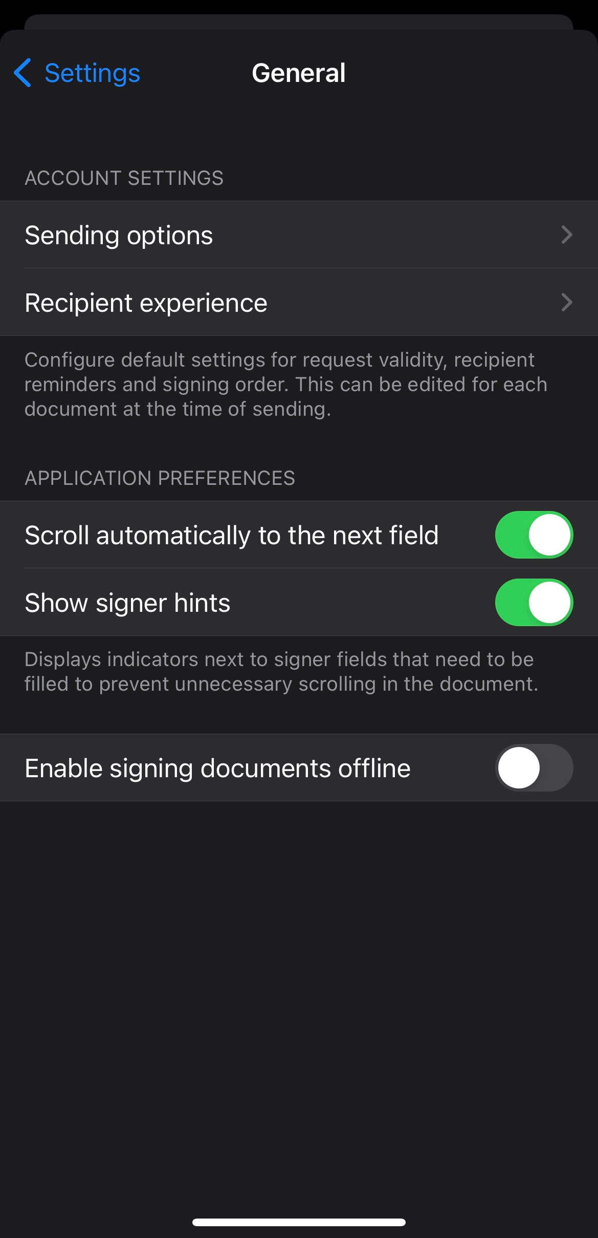 Under the Application Preferences option, you can find the 'scroll automatically to the next field' and 'show signer hints' options, which when enabled displays indicators next to signer fields that need to be filled to prevent unnecessary scrolling in the document. By enabling the enable signing documents offline option, you can allow the signer to sign the document offline without an internet connection.