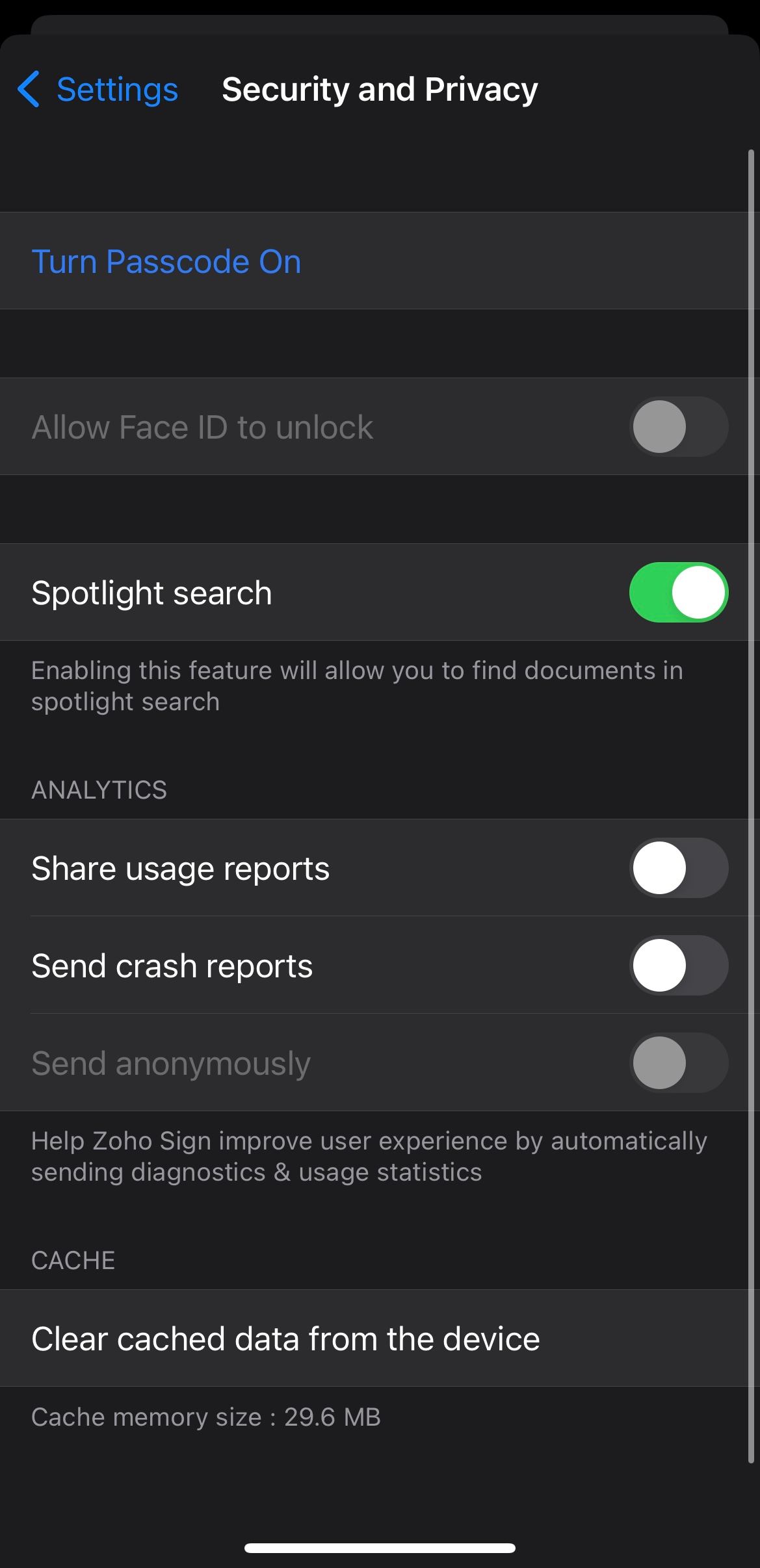 - Turn passcode on - Set a passcode that can be used to unlock the Zoho Sign app.