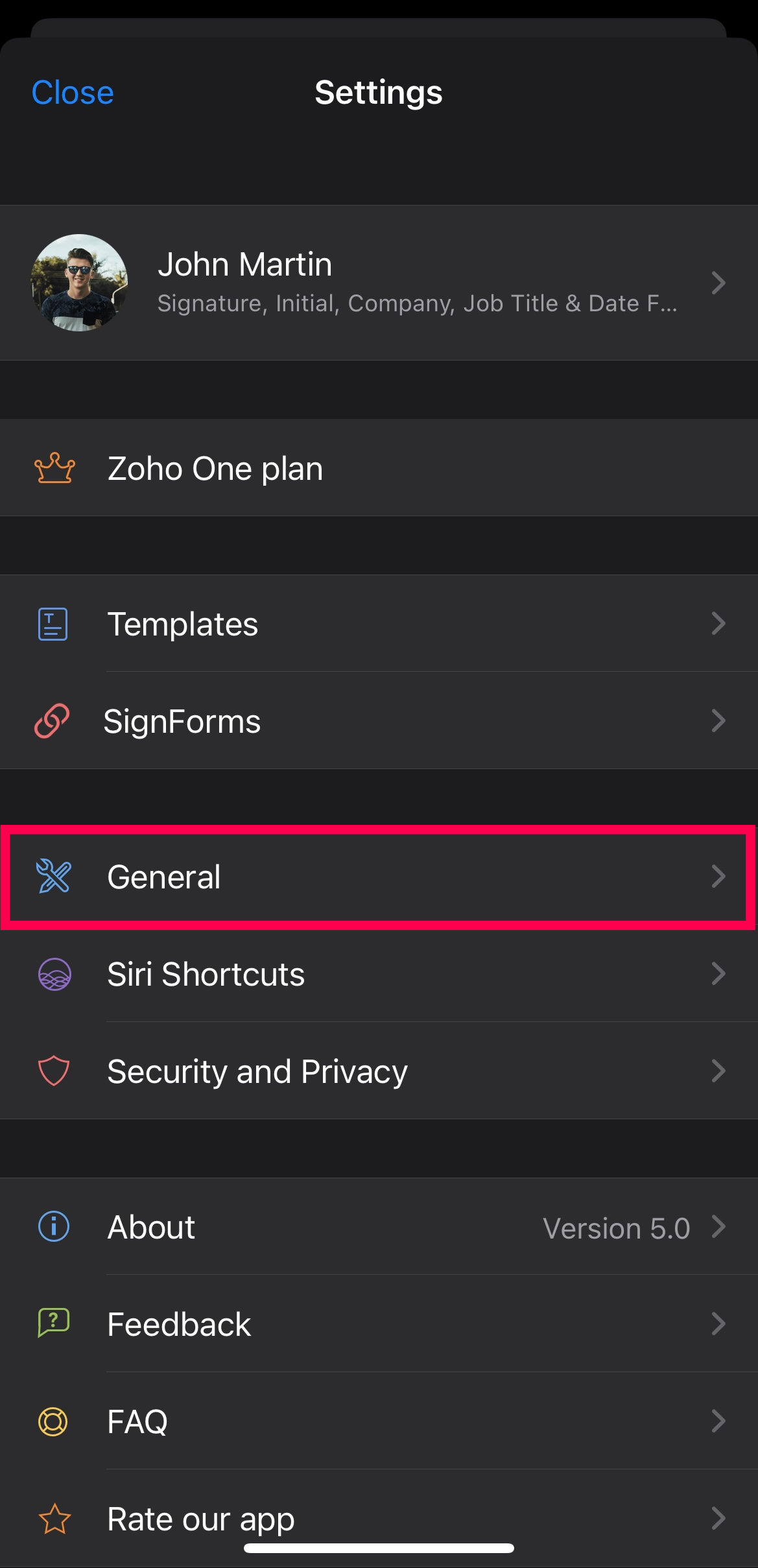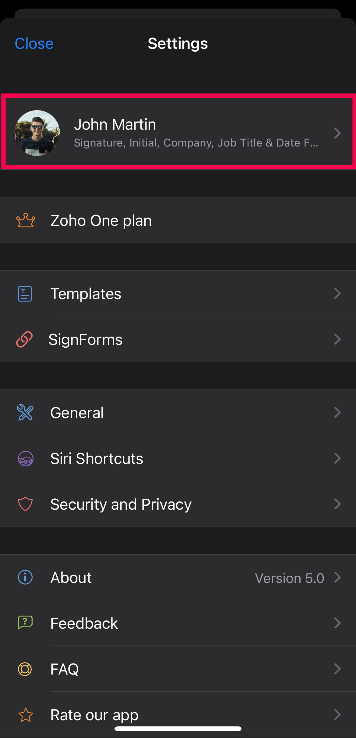The Sign Out option is available in the Settings screen, which you can use to sign out of your Zoho Sign account on your device.