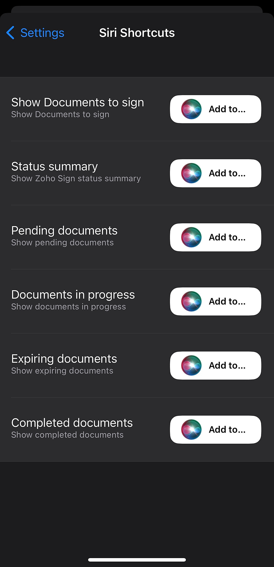 You can configure Siri shortcuts for the following actions by tapping on the Add to Siri button next to them: