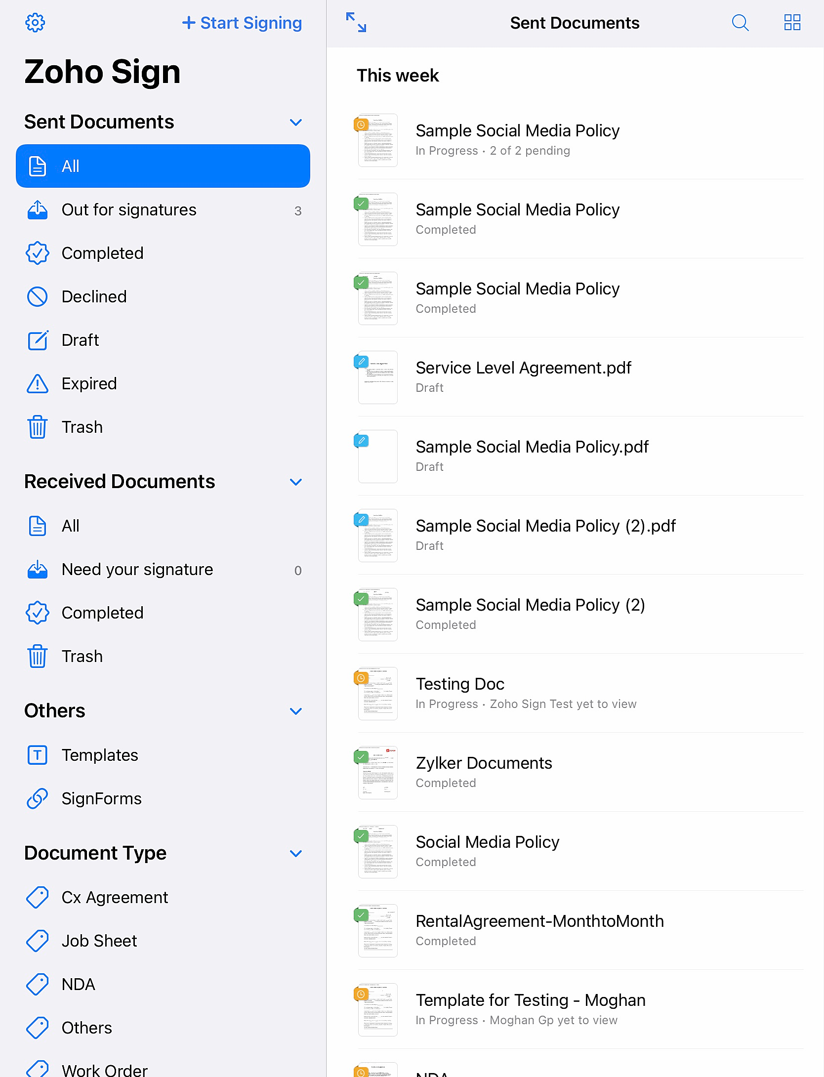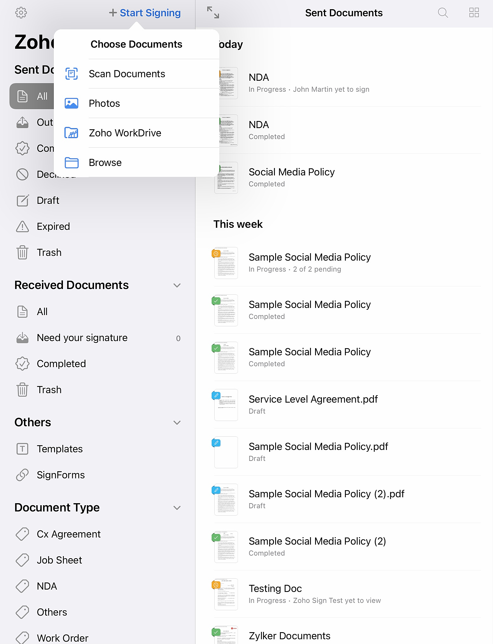 Available in all data centers. Administrators and form owners can send a document for e-signature in any forms where the e-signature feature is supported. Documents can be sent out from Zoho People in three methods: File upload field Mail merge ...