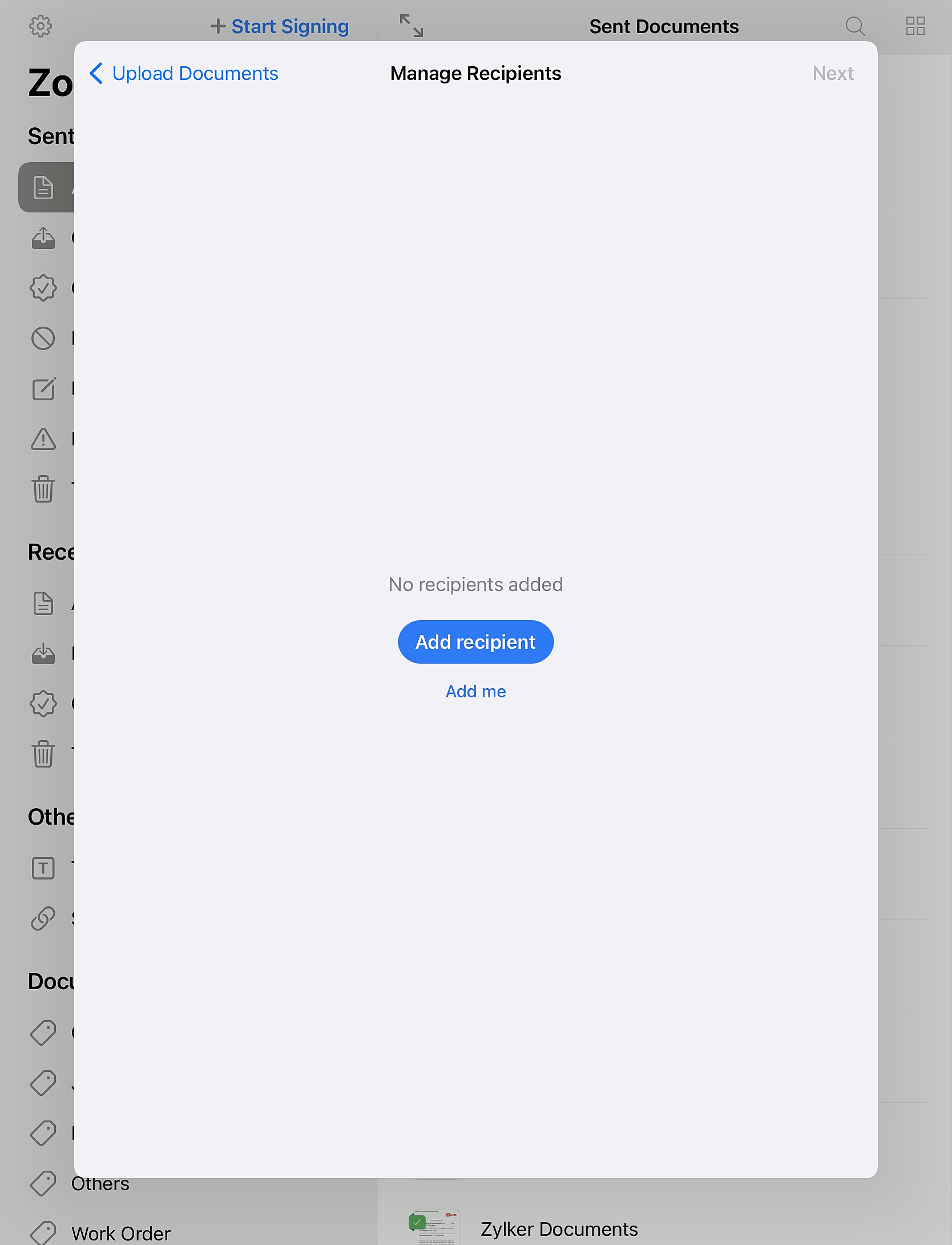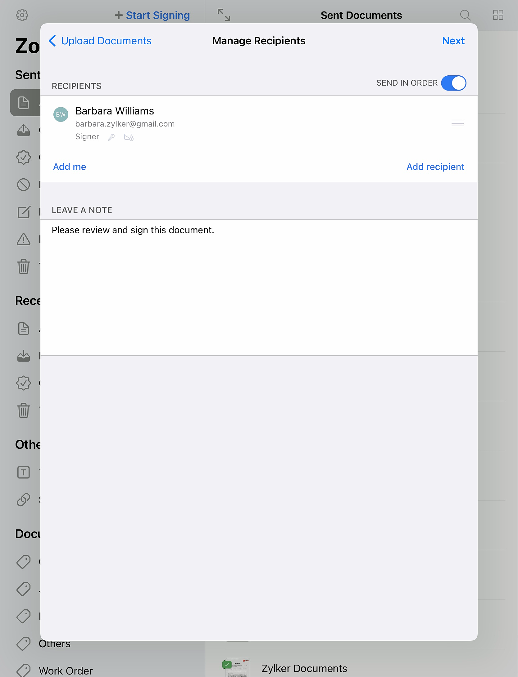You can upload documents and send them to one or more recipients to request their signatures, using the Send for Signatures section in Zoho Sign. Log in to your Zoho sign account and click Send for signatures on your dashboard. Alternatively, click ...