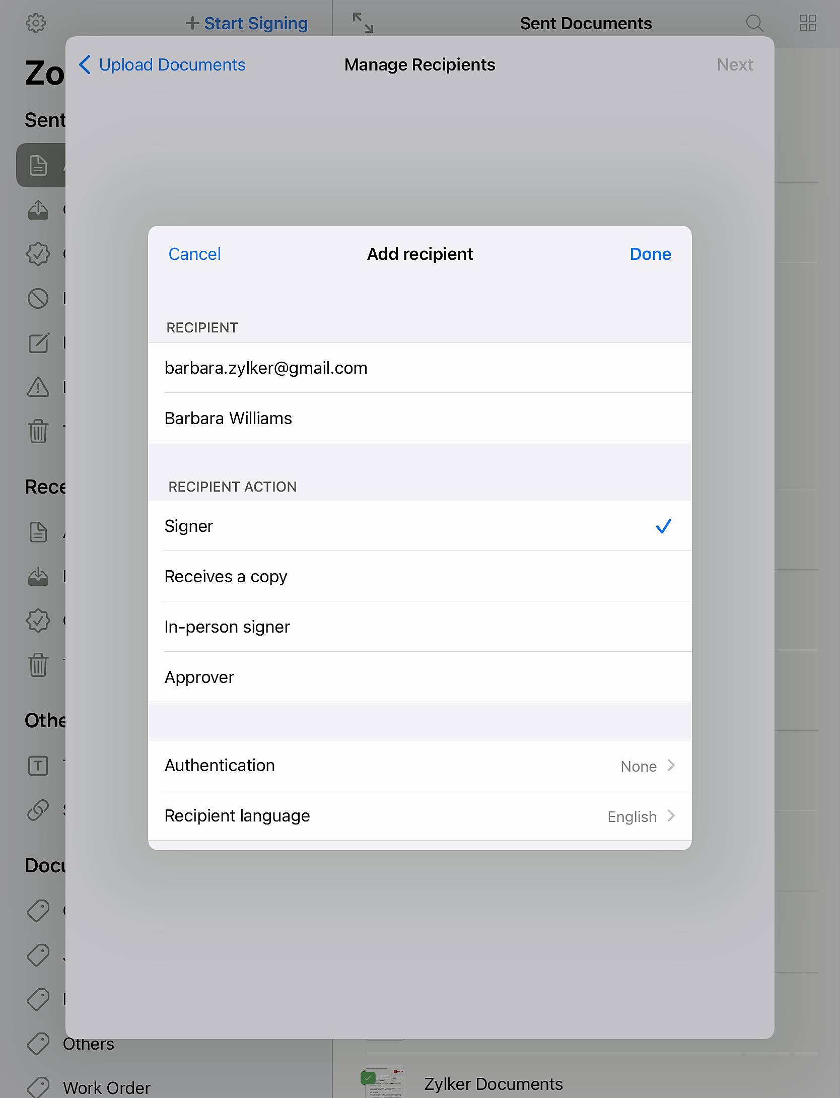 5. In the Add Recipient window enter the recipient details such as email address, name, recipient action, authentication type, and select your preferred recipient language, a private note to your recipient if you want, and tap Done.