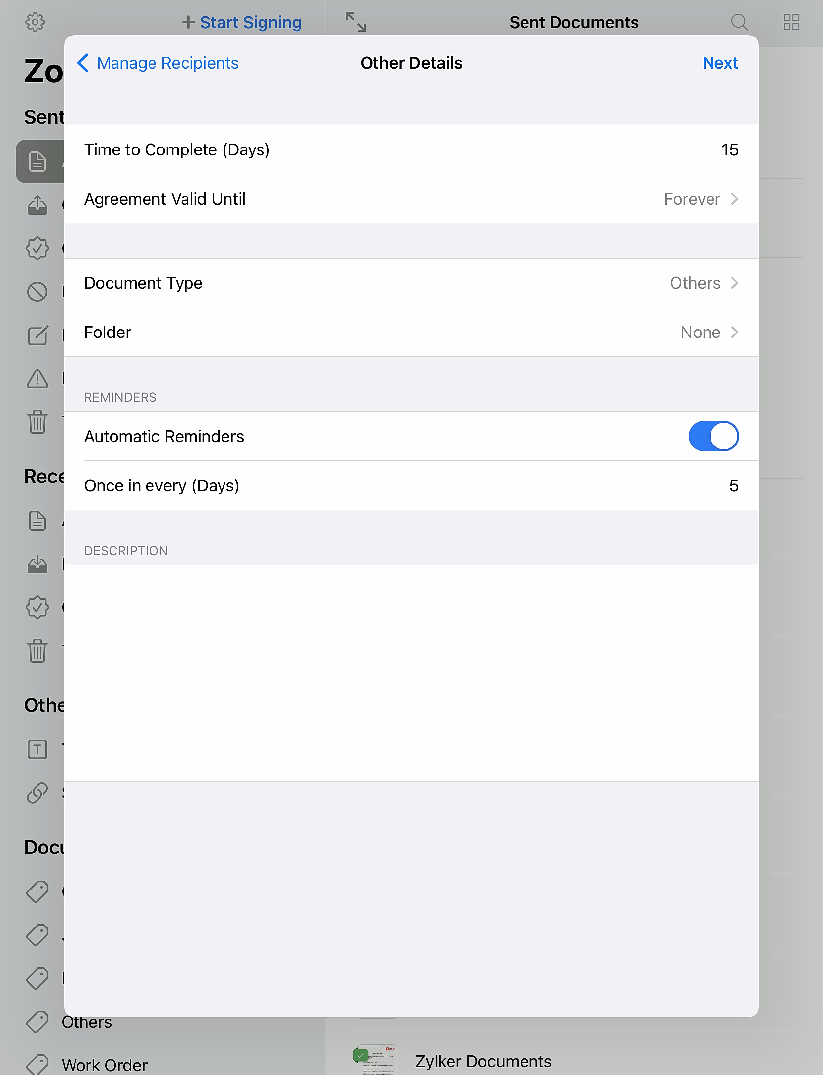 10. In the Other Details window, you can set document validity period, agreement validity, document type, folder, automatic reminder interval, and add a description. Tap Next once you are done.