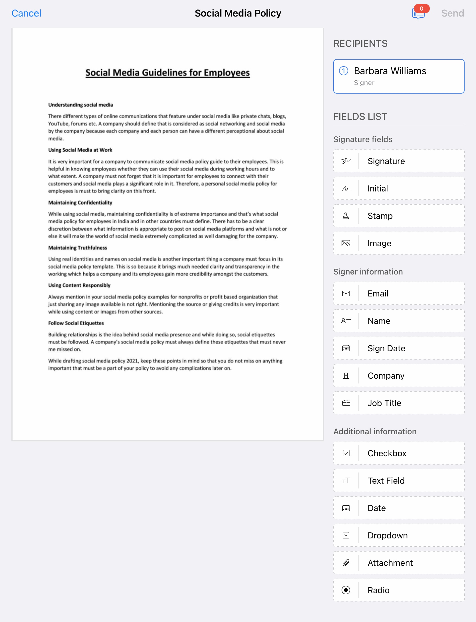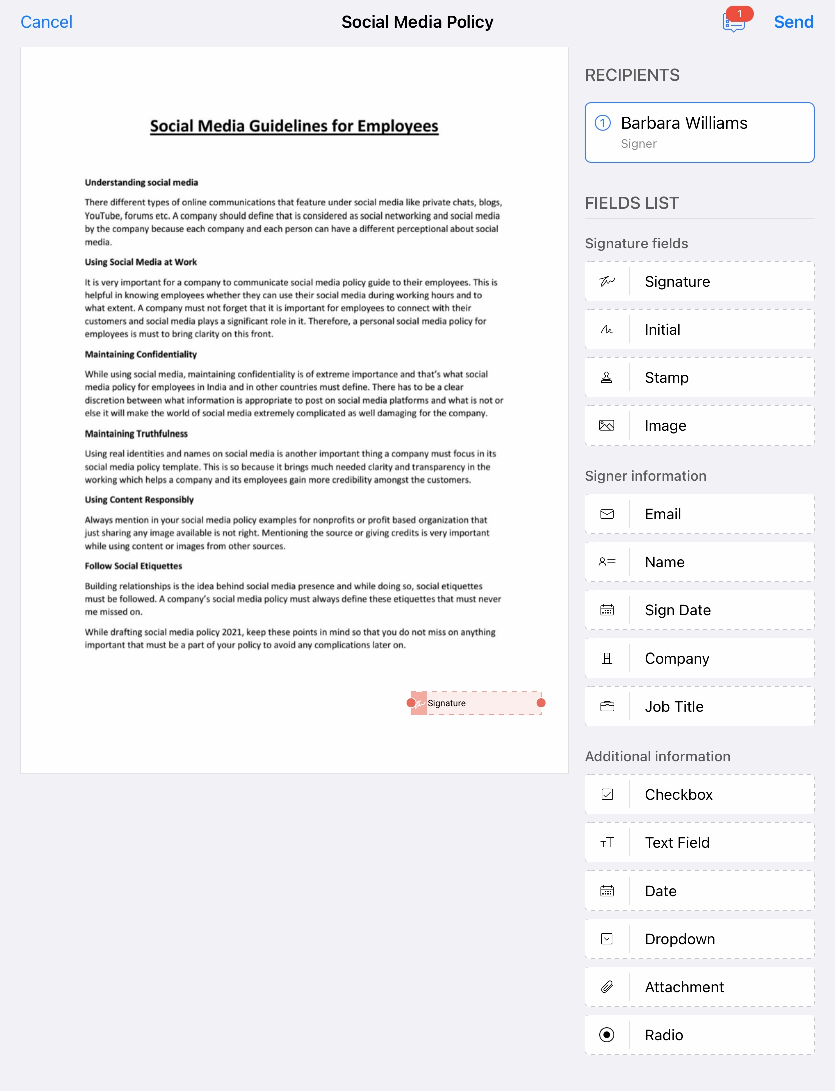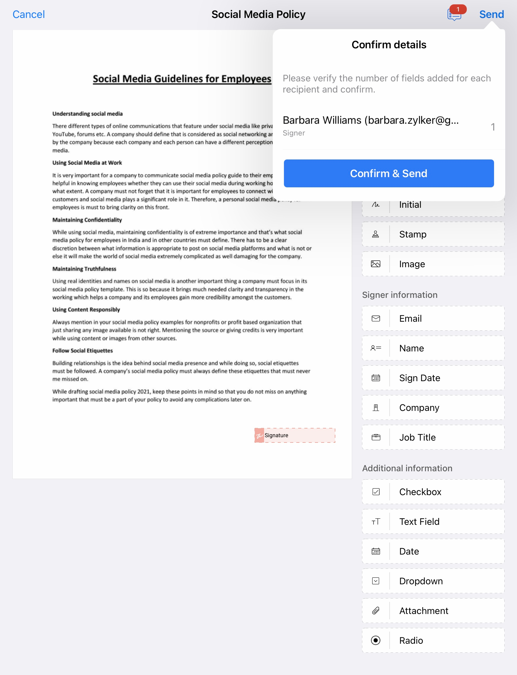 11. On the document viewer screen, you can add fields like signature, initial, stamp, name, sign date, and more by dragging and dropping the required fields on your document.