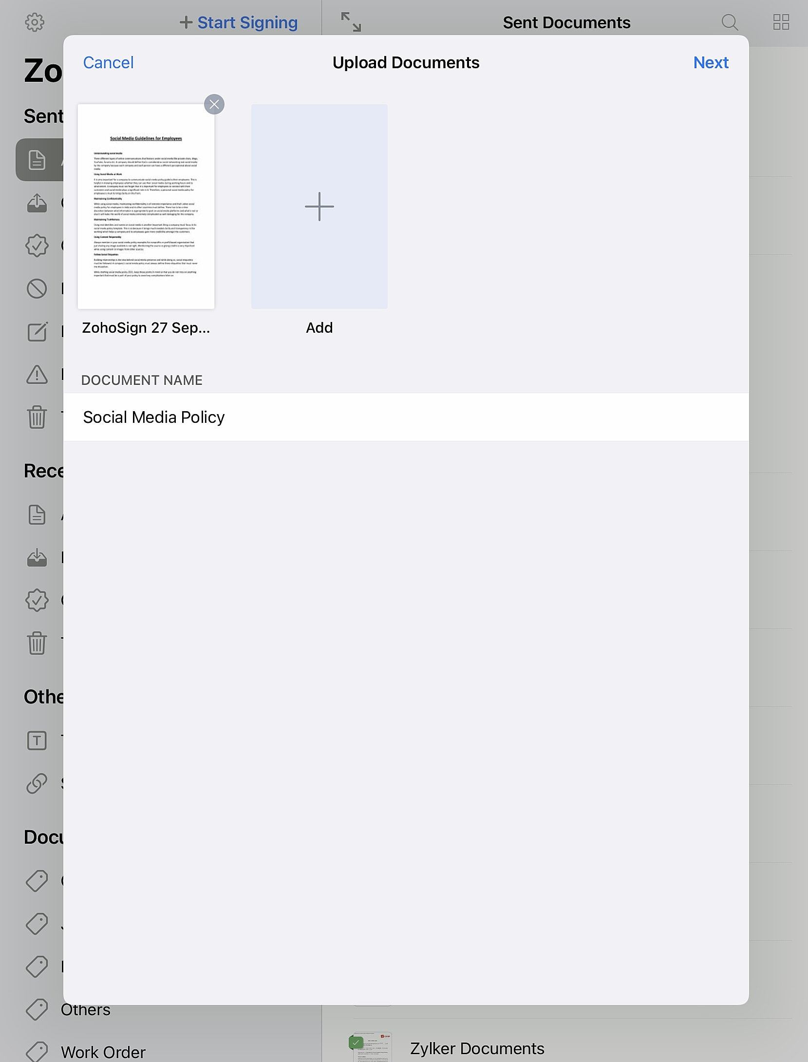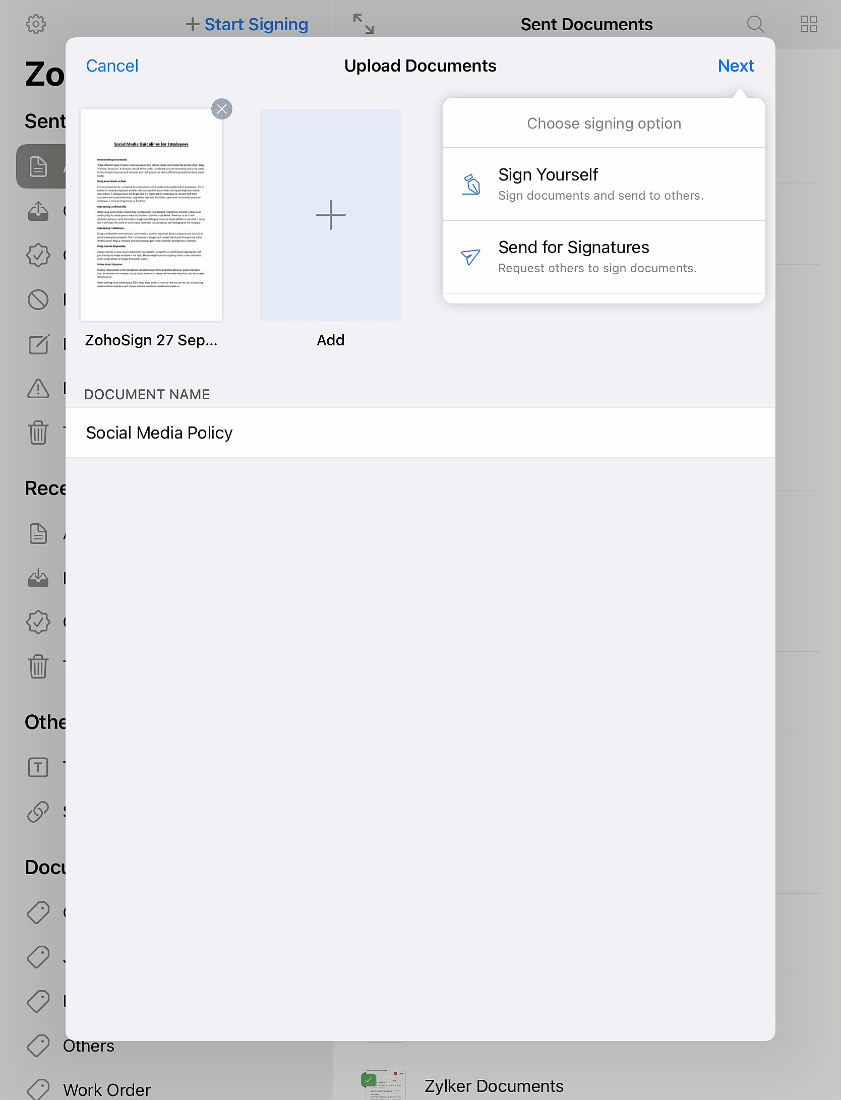 2. Upload your document by either scanning the document, or uploading it from your photo gallery, from Zoho WorkDrive, or from your internal storage.