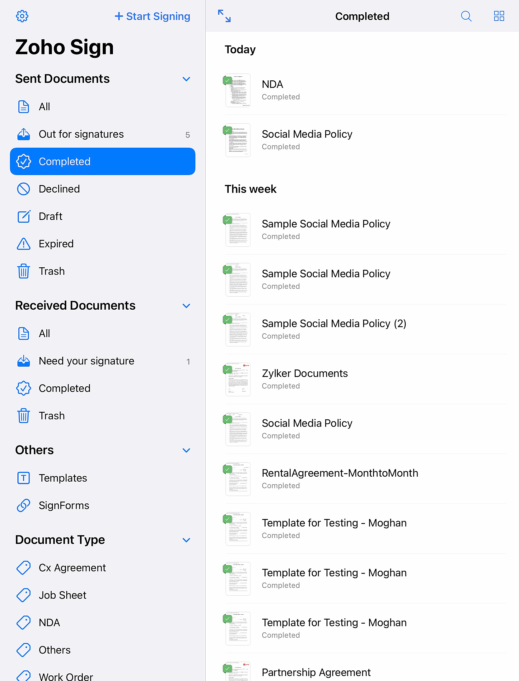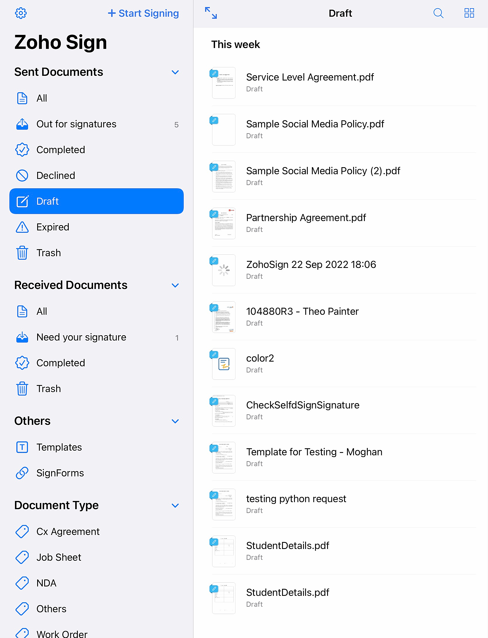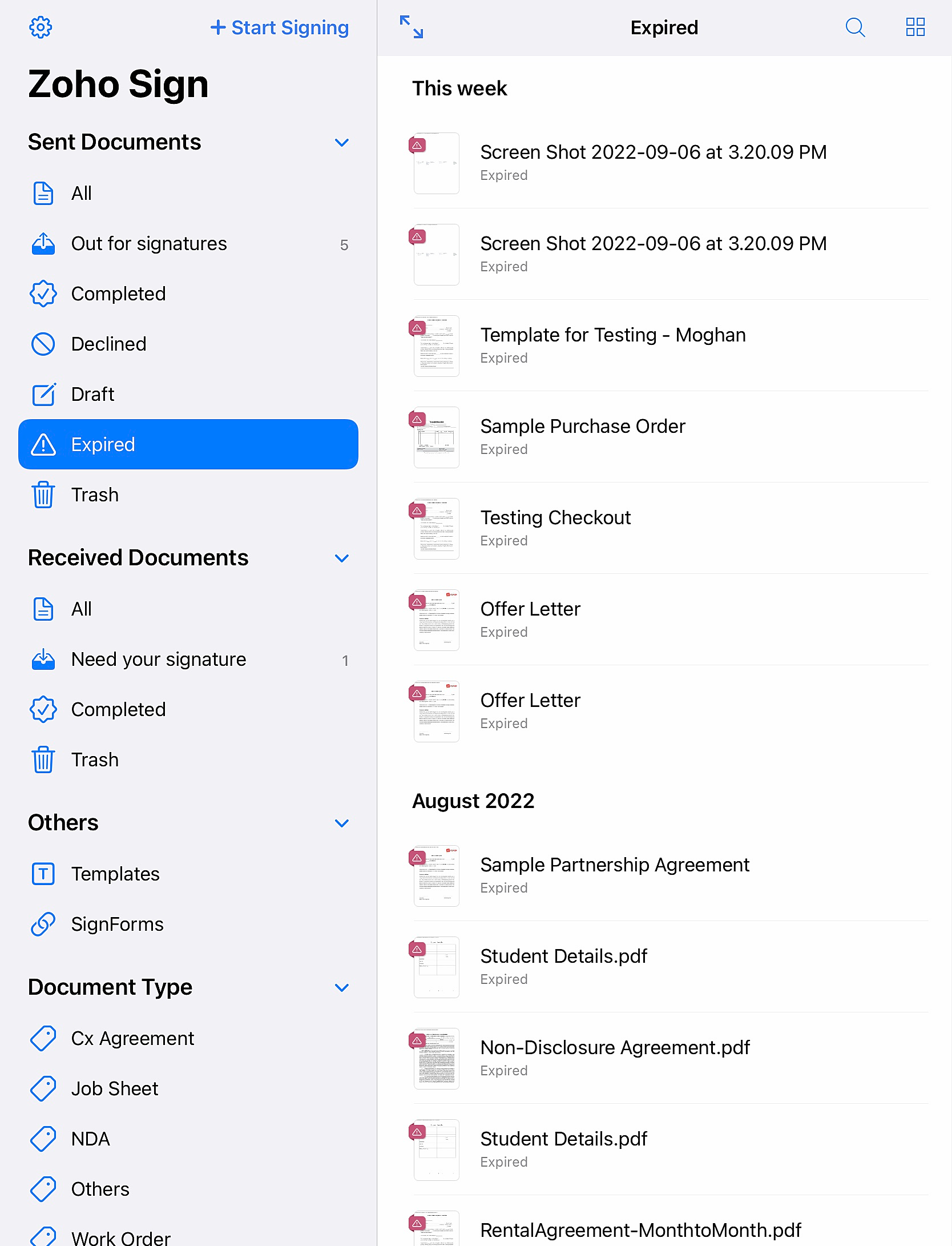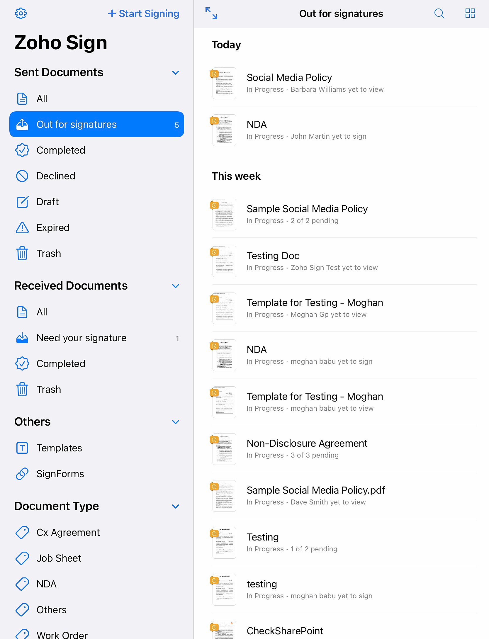 On the homepage of the Zoho Sign iOS app, you can toggle between Need your Signature and Out for Signatures. Switch to Need your Signatures to access the documents that require you to sign, or to Out for Signatures if you want to track the documents ...