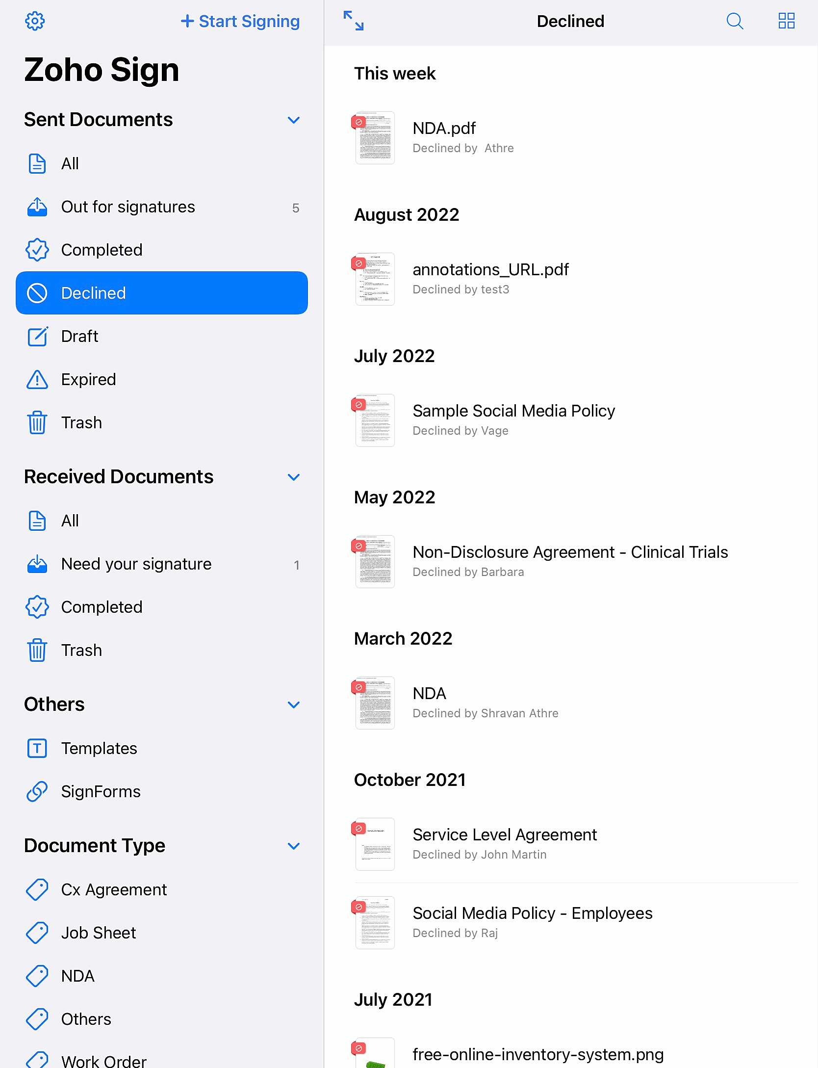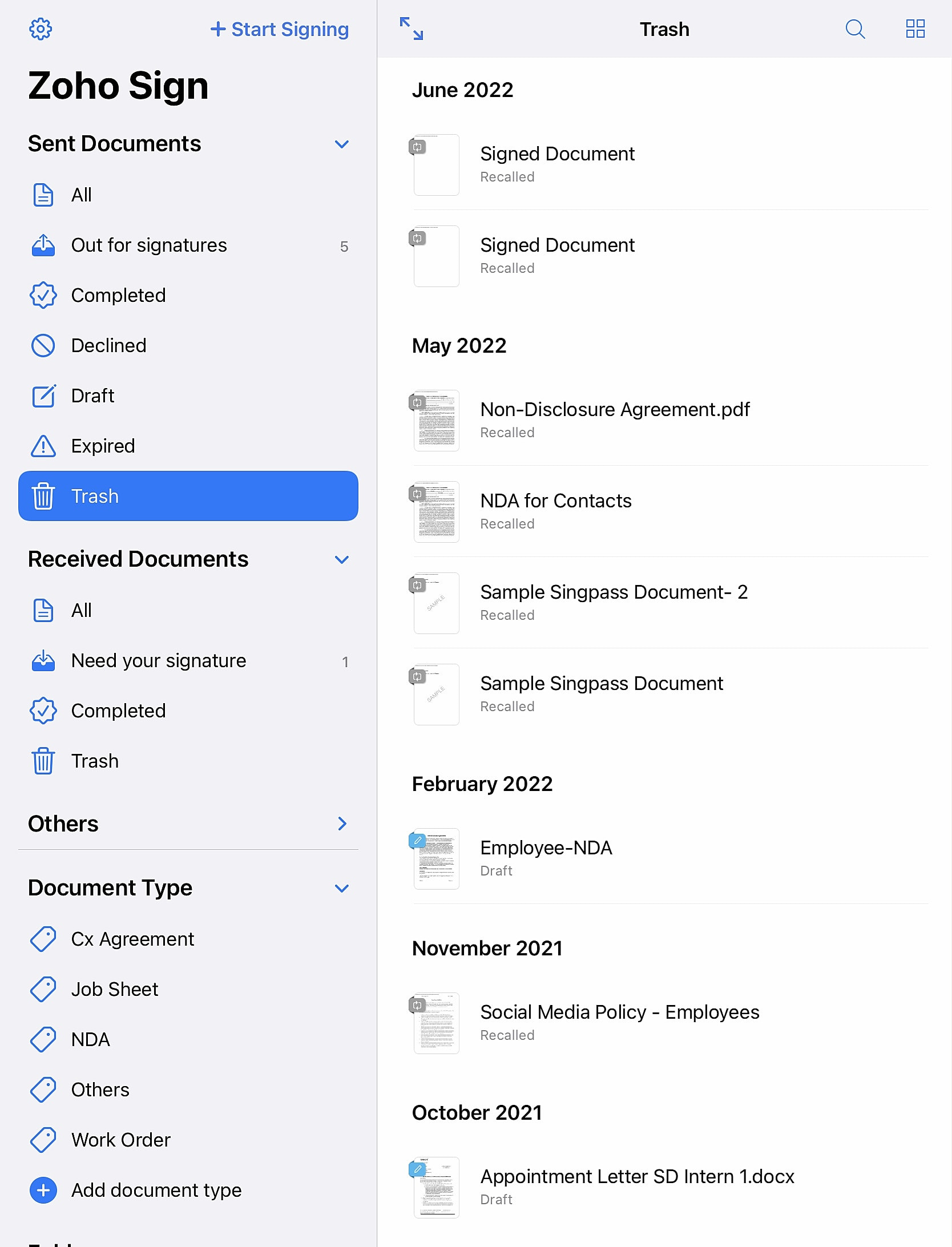 All the documents you have sent out for signatures can be accessed from the Sent Documents menu. In the Sent Documents menu, documents are categorized as All, Out for signatures, Completed, Declined, Draft, Expired, and Trash.