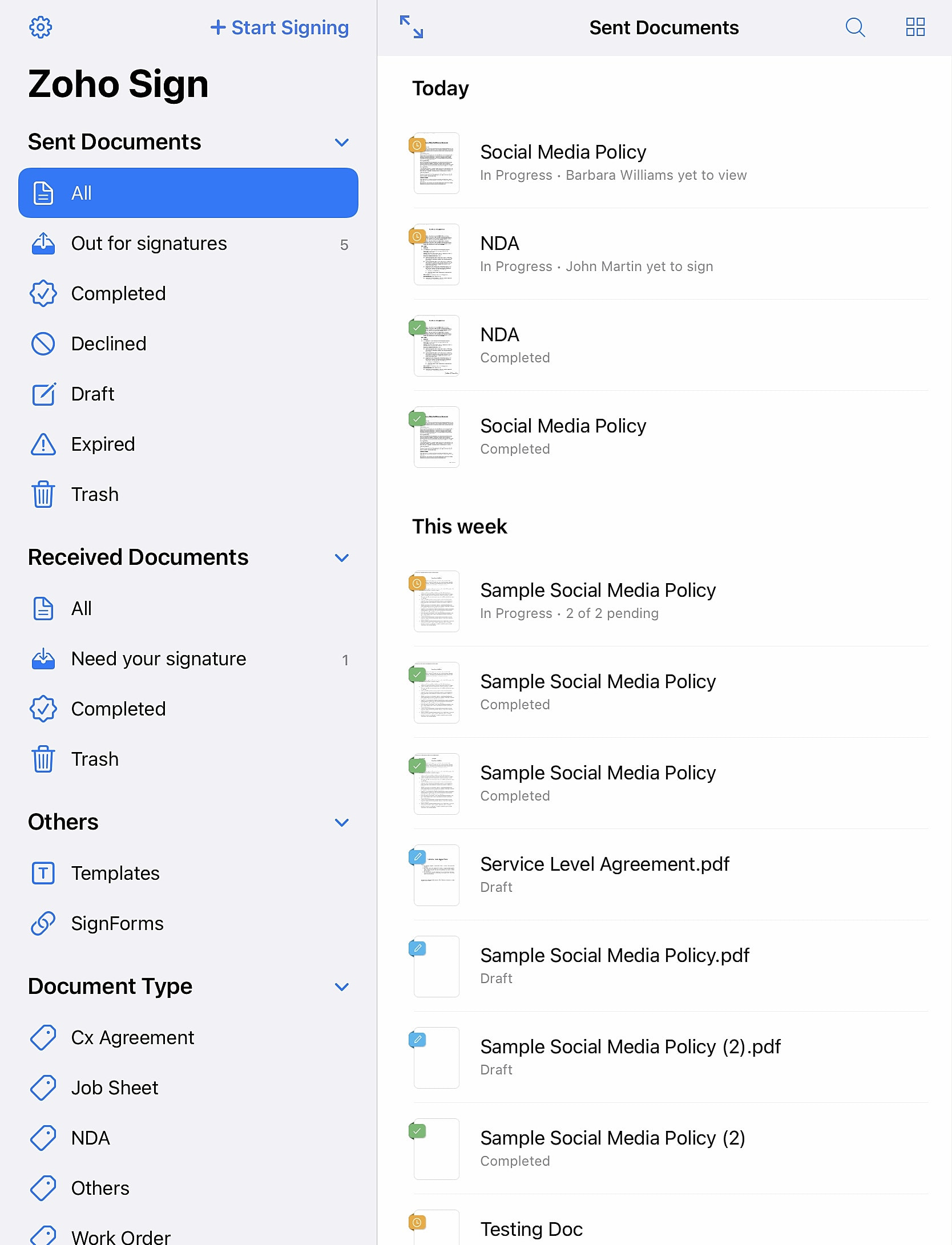 Track the documents you send or receive via Zoho Sign. Tracking sent documents : To view the list of sent documents, tap on the menu icon at the bottom-left corner of your home page and navigate to sent documents. To check the status of the document, ...
