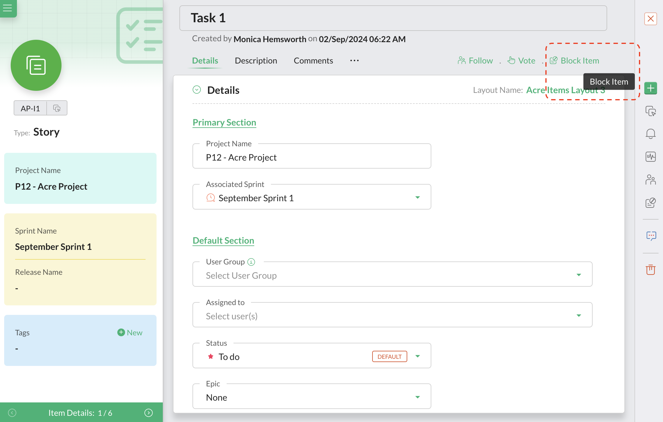 Block item capability in Zoho Sprints allows you to restrain all actions pertaining to a particular item. You can indefinitely halt or temporarily shelf an item. If a user blocks an item, none of the users can perform any action (except adding comments) in the item until the item is unblocked. This enables items to be put on hold or frozen until they are fit to be processed. You can unblock the item when required.