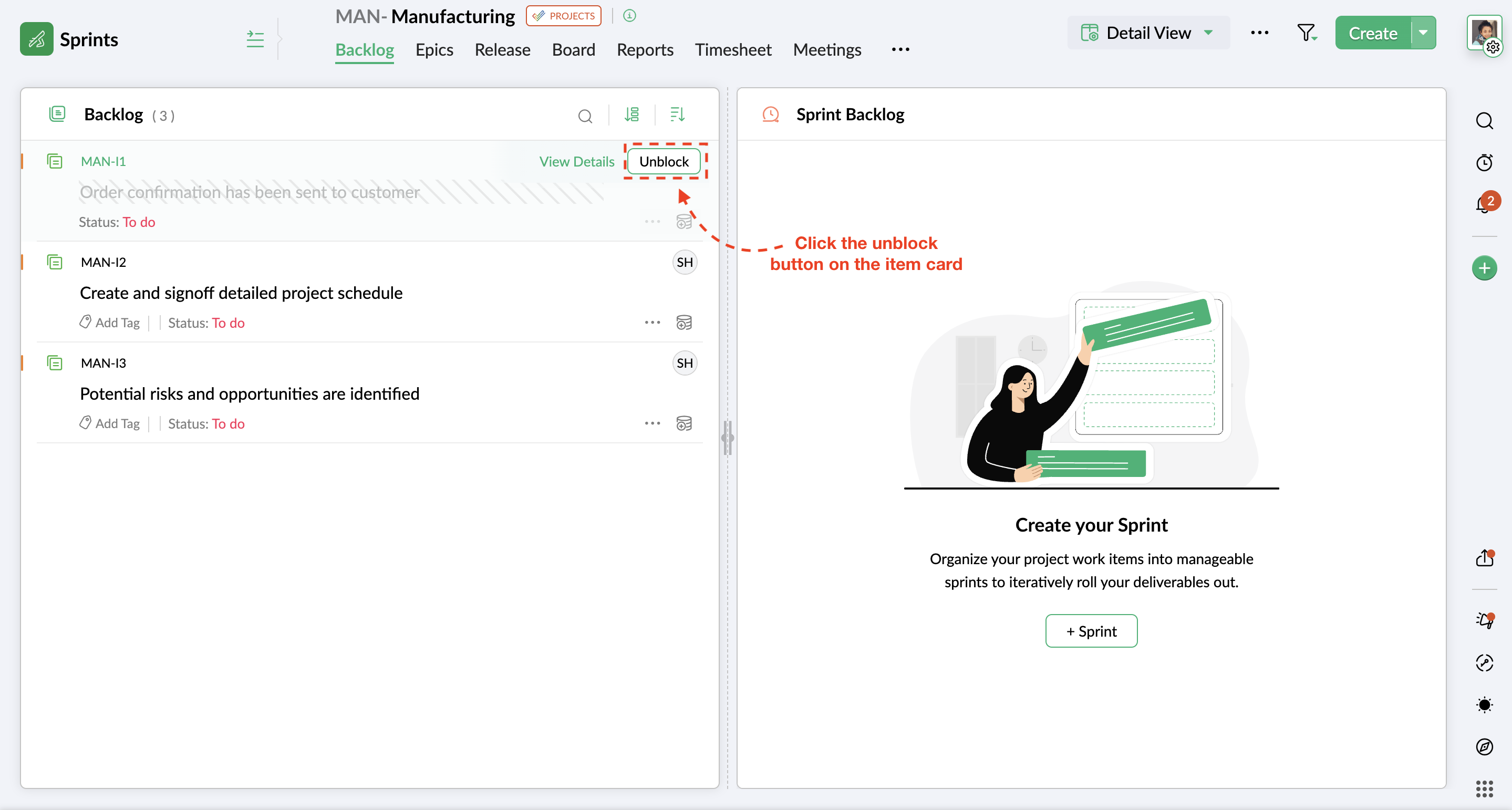 Once blocked, the item will be disabled in the backlog or the board as well. The blocked item in the backlog cannot be moved to a sprint, and the blocked item on the sprint board cannot be moved across statuses or closed.