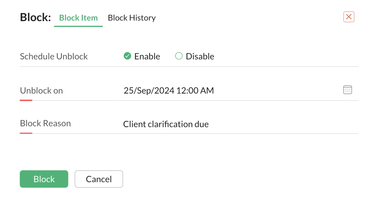 This feature comes with the provision to block an item up to a particular time. You can schedule the time at which the item must be unblocked automatically.