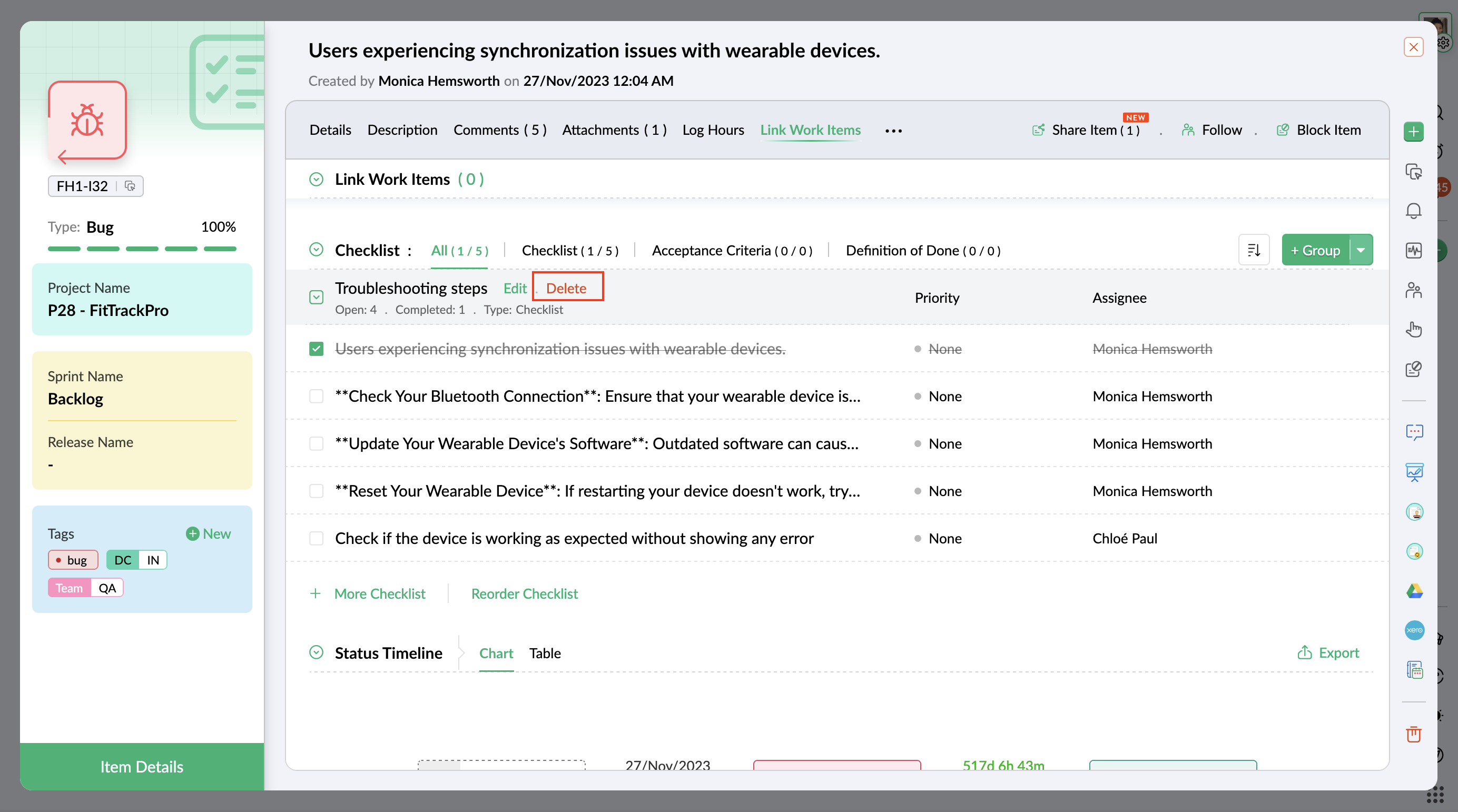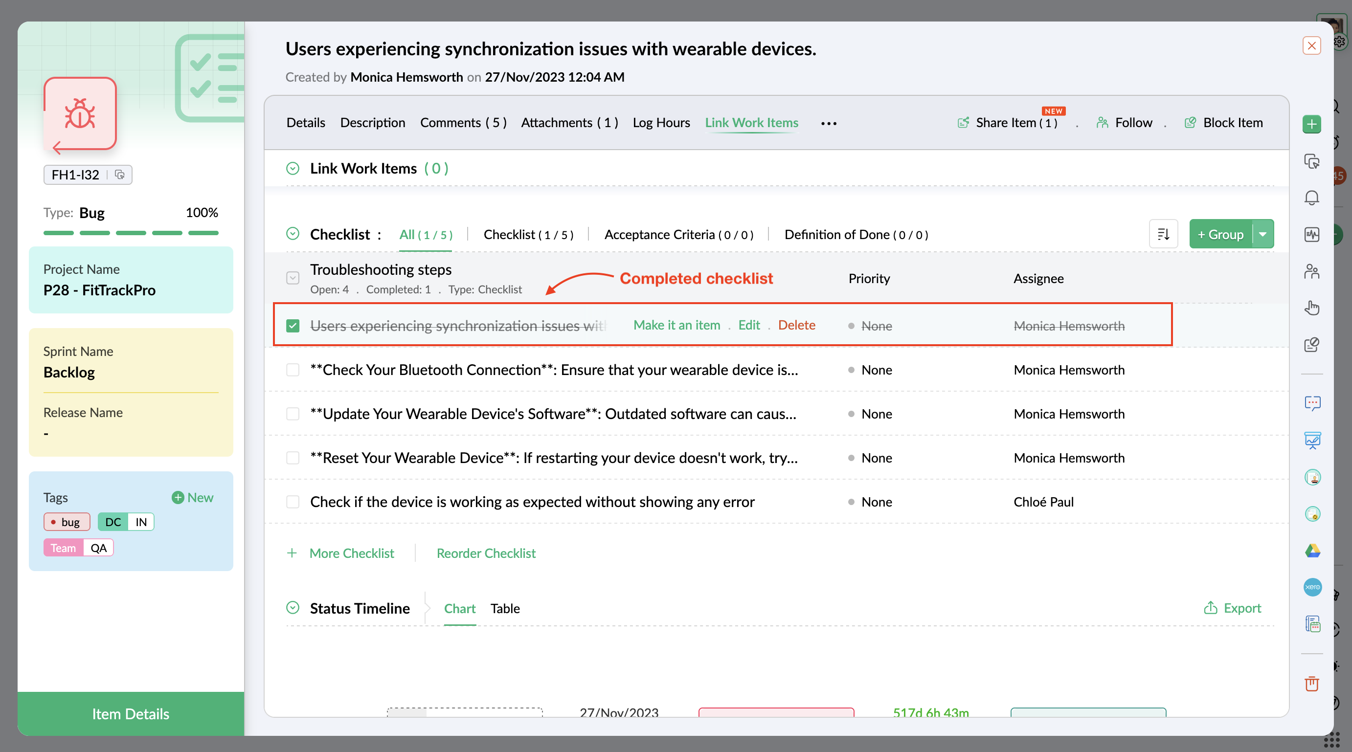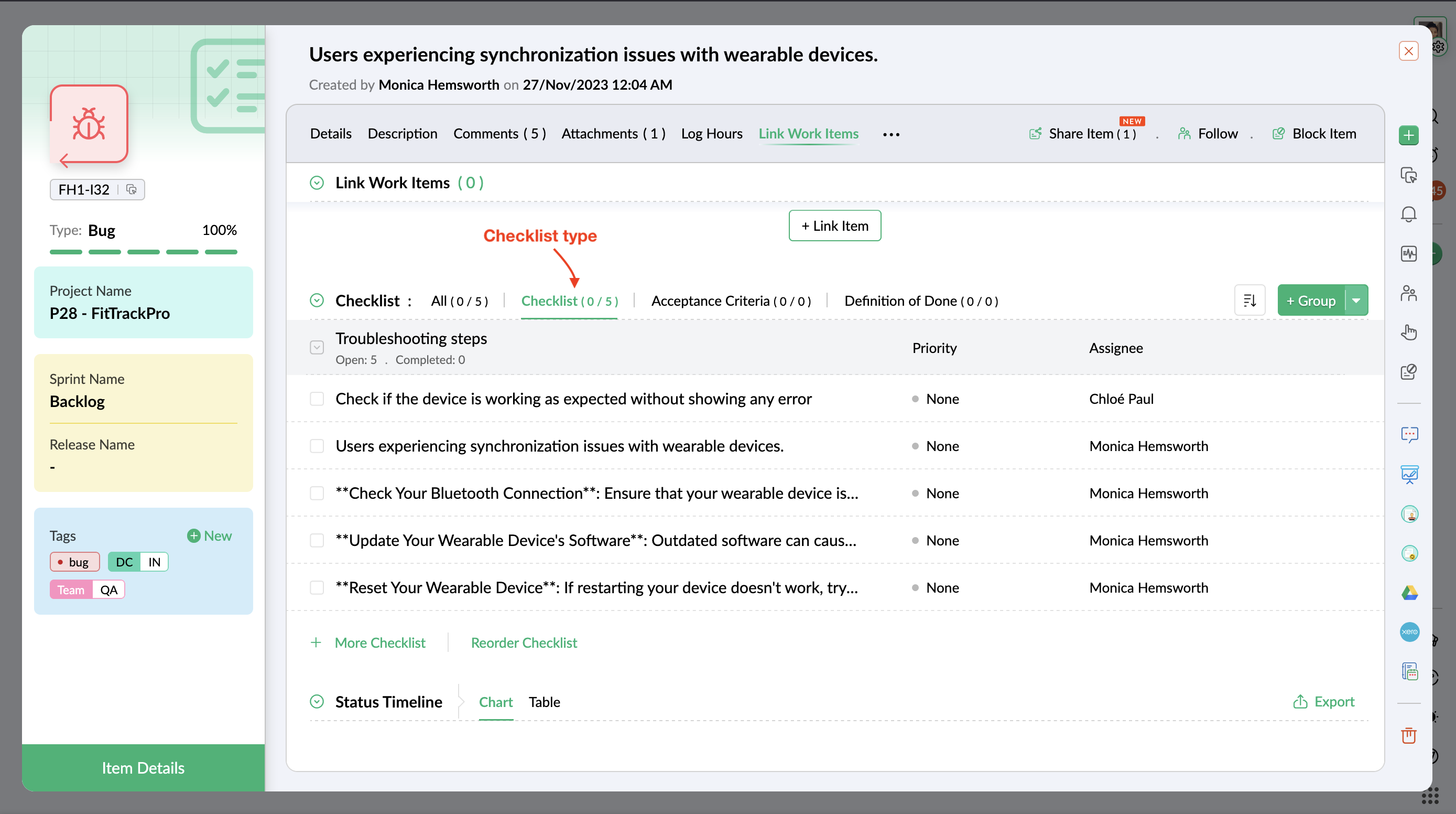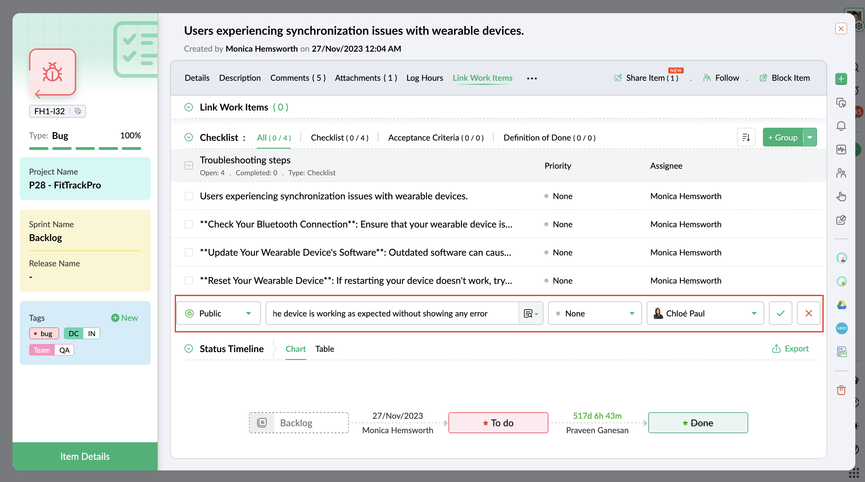 - Enter required details and click the Create button. The checklist item is also added as a work item.
