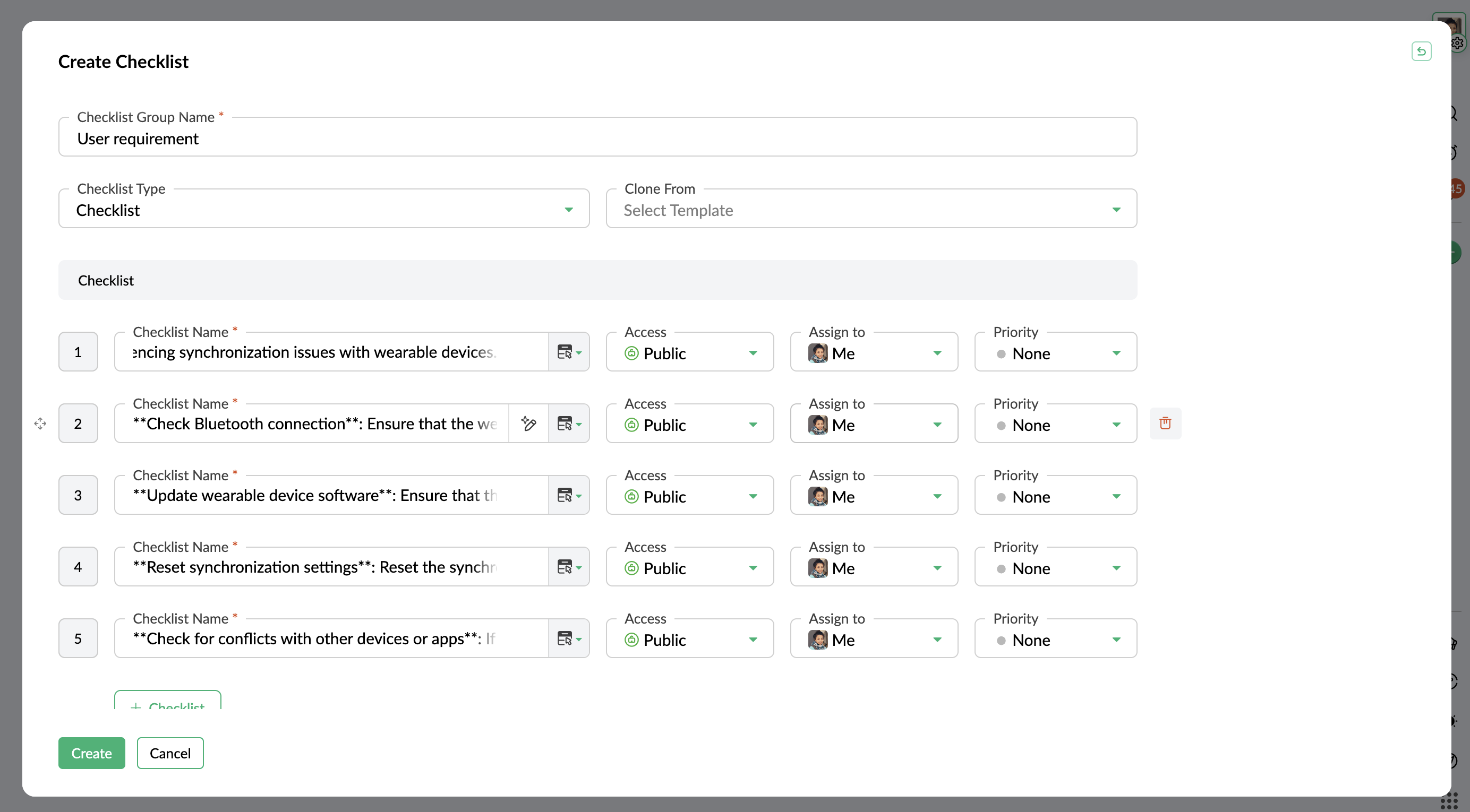 - Enter the checklist details such as Name, Access, Assign to, Priority.