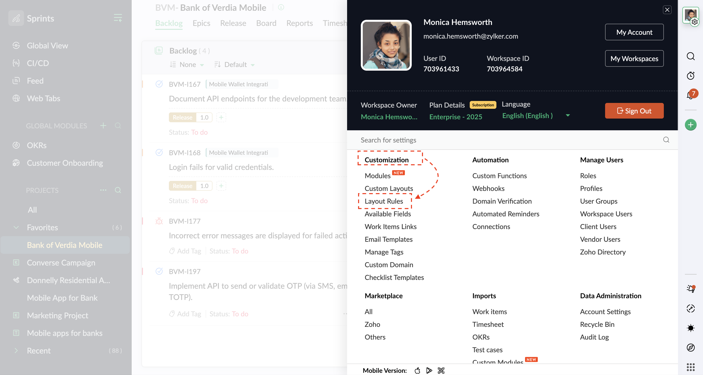 The layout rule is associated with a layout. When the respective layout is associated with a project, the layout rule will be applied to the project and to all the work items added to it.
