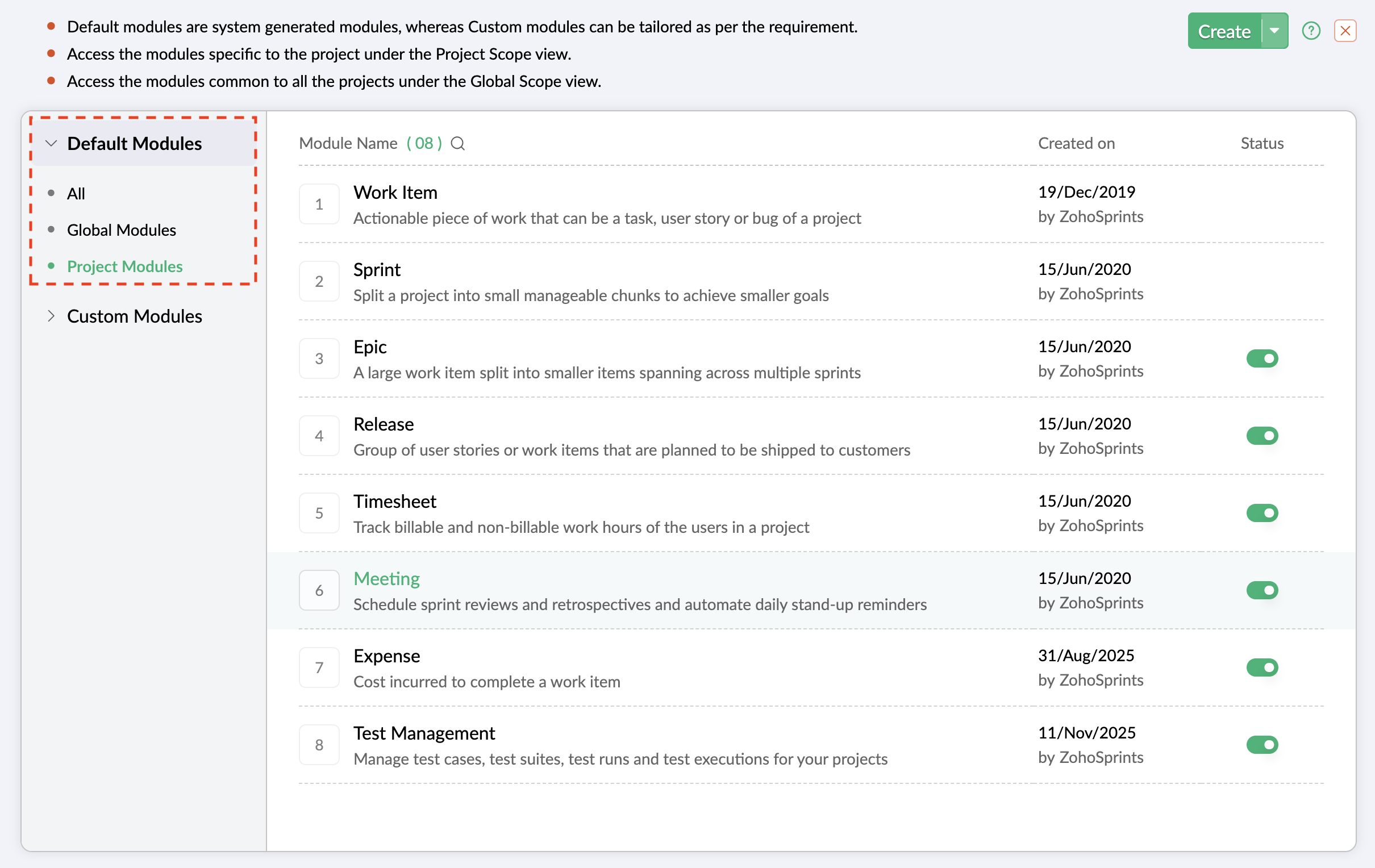 Default modules are pre-defined standard components provided by Zoho Sprints. Default modules are further classified into Global and Project Modules.