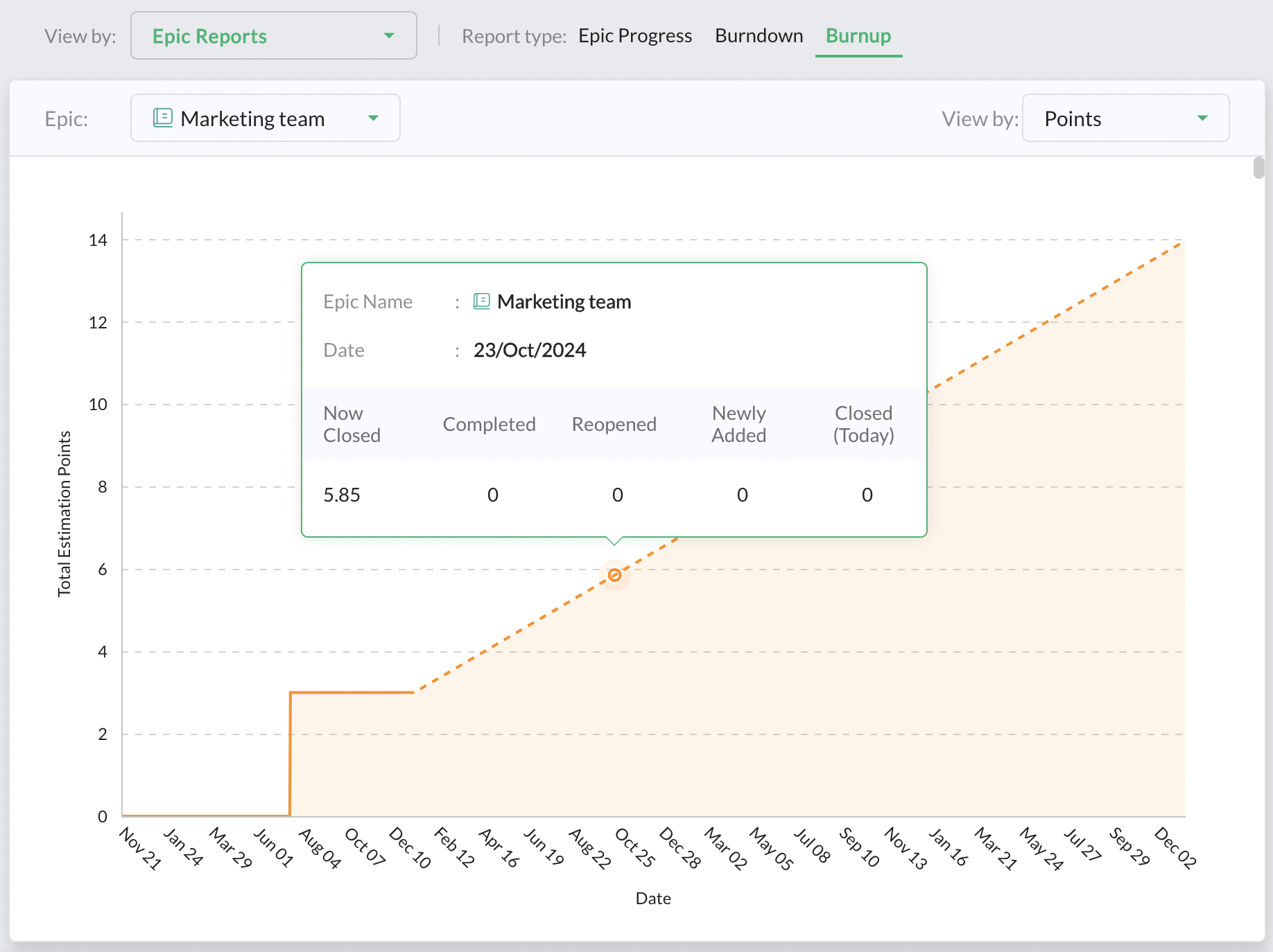 Epic burnup report will show the number of work items or points that are completed on a daily basis. Using this report you can track the progress of your epic and get to know the predicted end date of your epic.