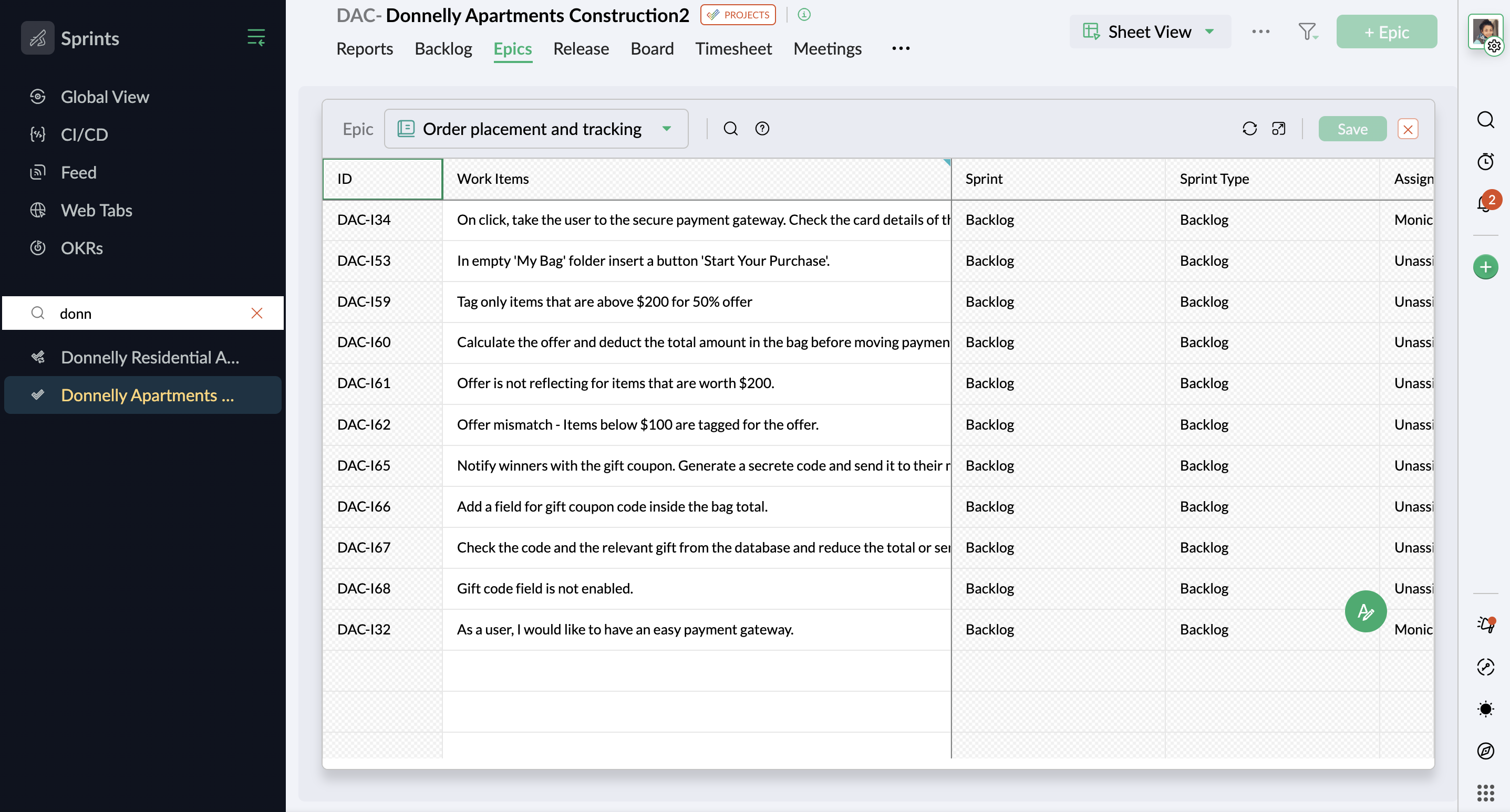 Zoho Sprints comes with the capability to list the work items that are in the backlog, board, epic, release and users in the form of a spreadsheet. You can view your epic work items on a sheet. Click here to learn more about sheet view and its behavior.