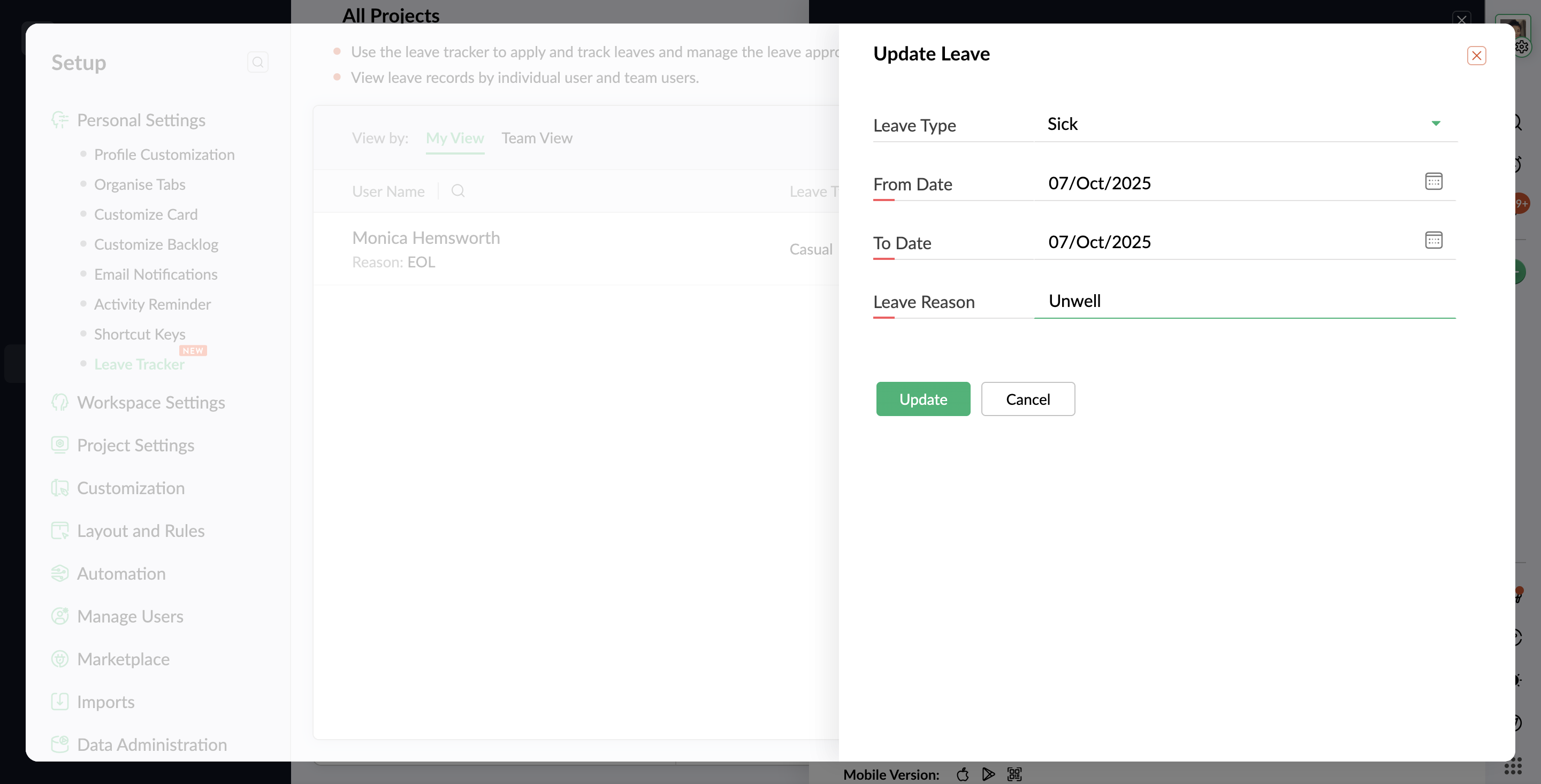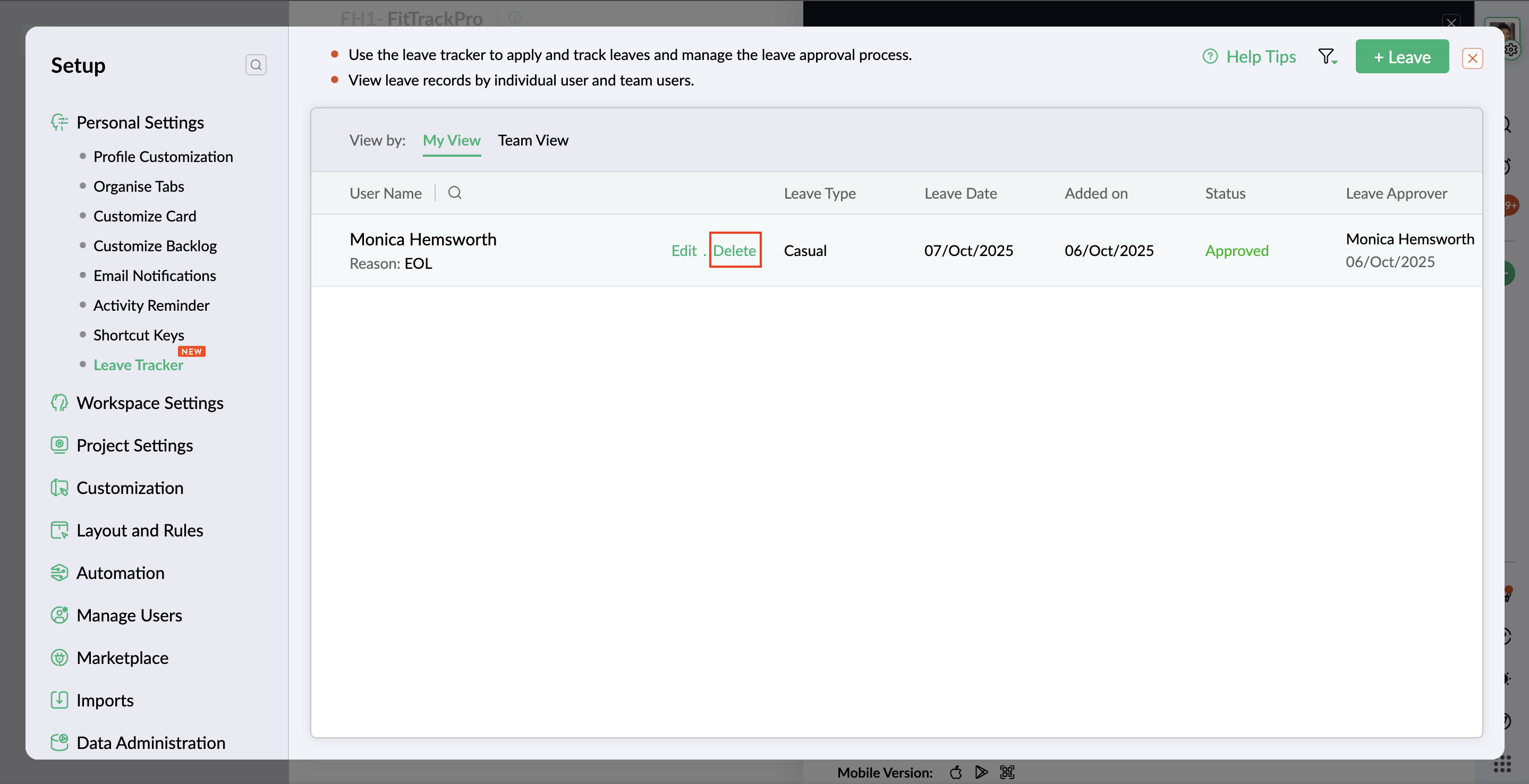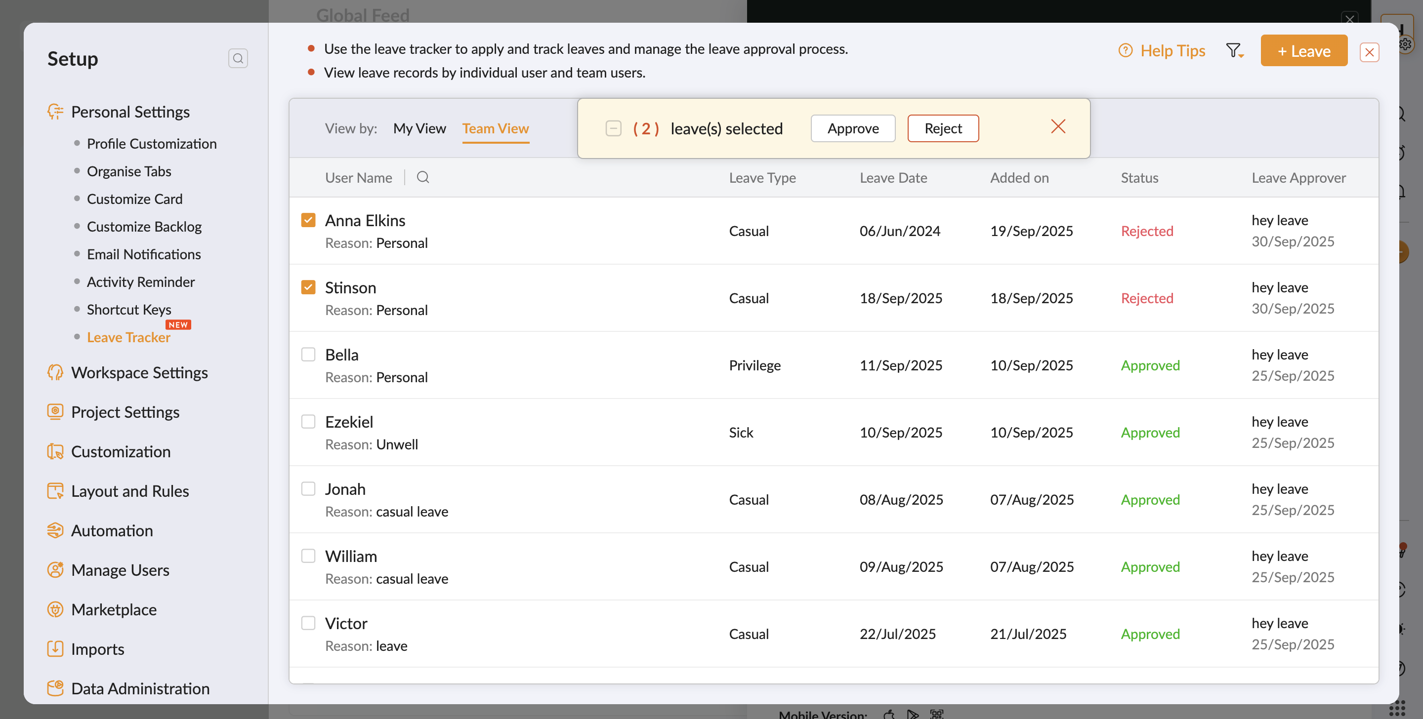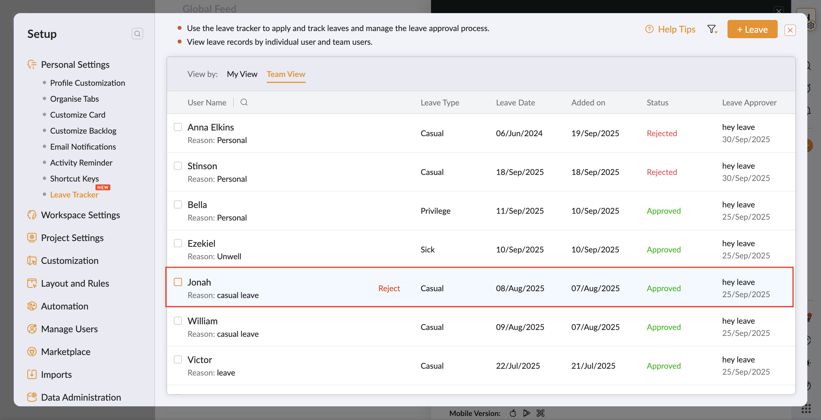 Workspace Owners and other users with the 'Manage Leave Tracker' permission can view the leave list of other users or team members. They can approve or reject their leave requests.