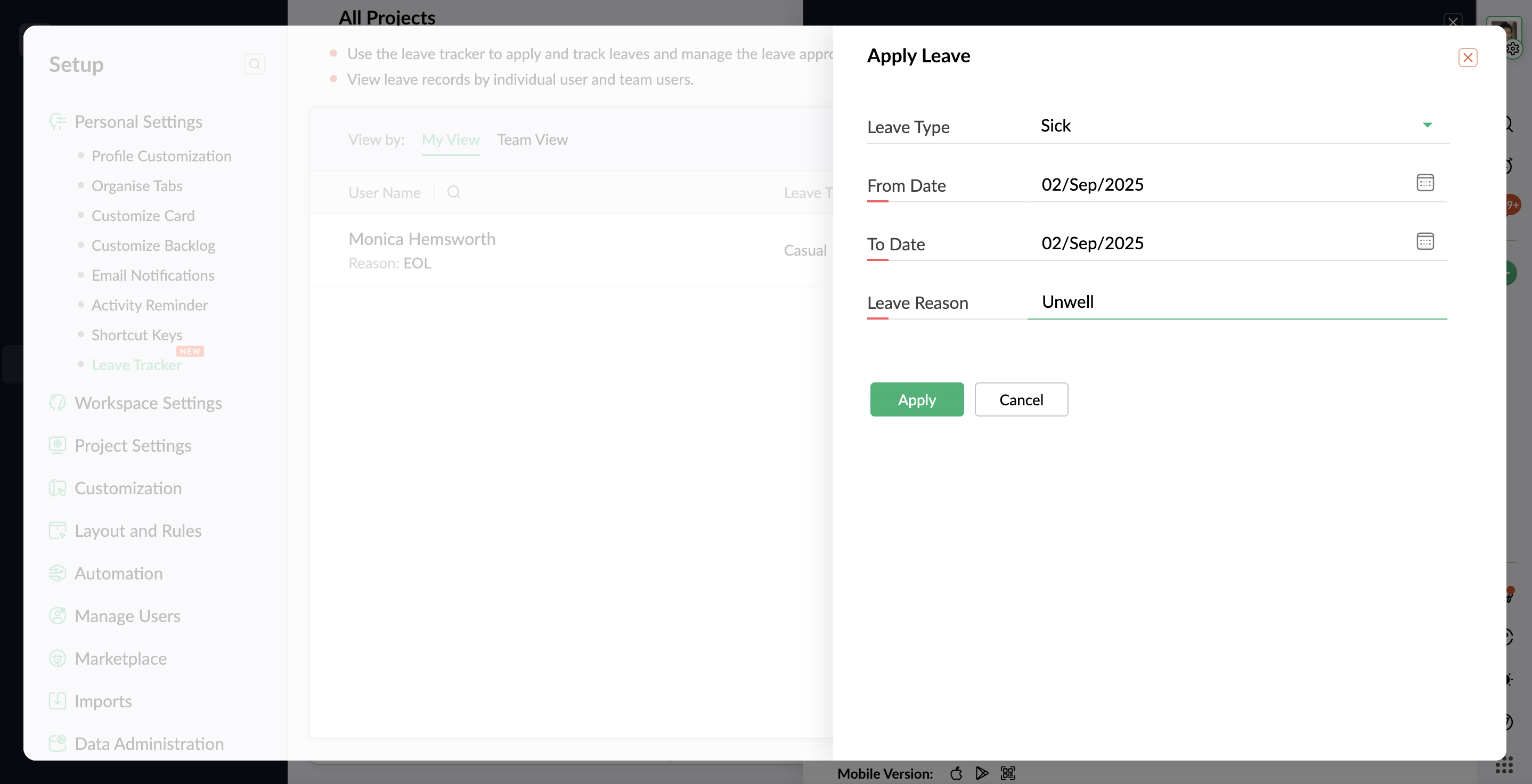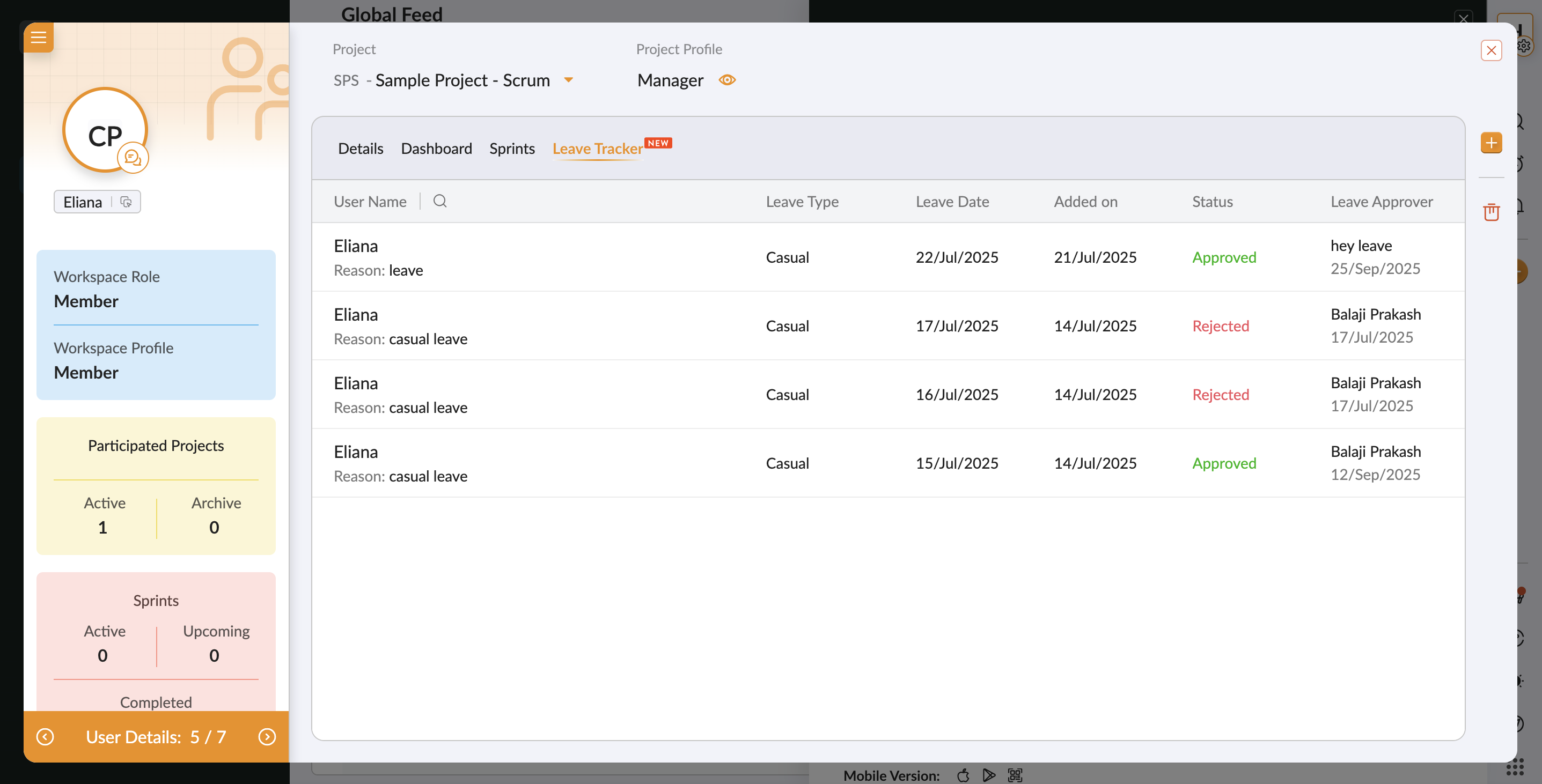 In Zoho Sprints, users can apply for leave and get them approved or rejected by the workspace owner or admin user. Users can view the number of leave days they’ve taken and how many remain directly from the Leave Tracker section.