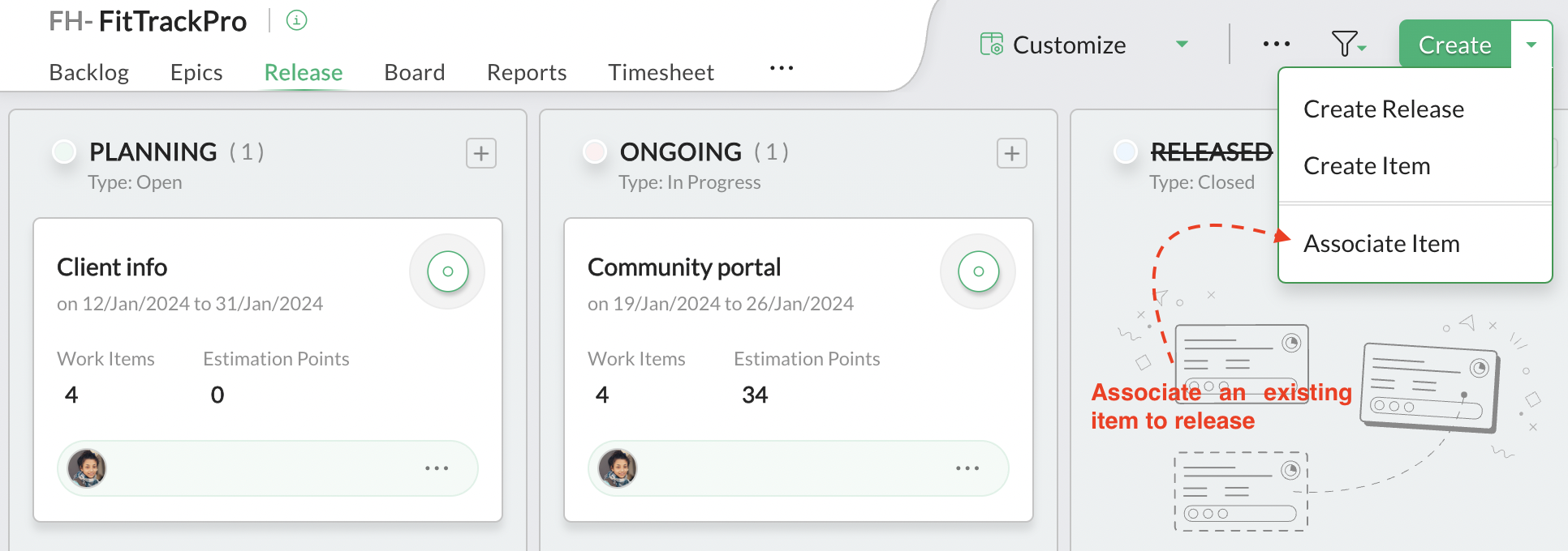 3. Associating work items allows you to select existing work items from your active, completed, or upcoming sprints or your backlog and add it to the release.