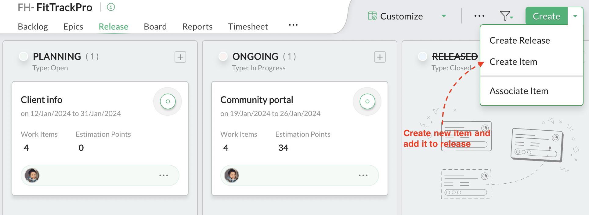 2. Adding a work item to a release allows you to create a new work item from within the release module.