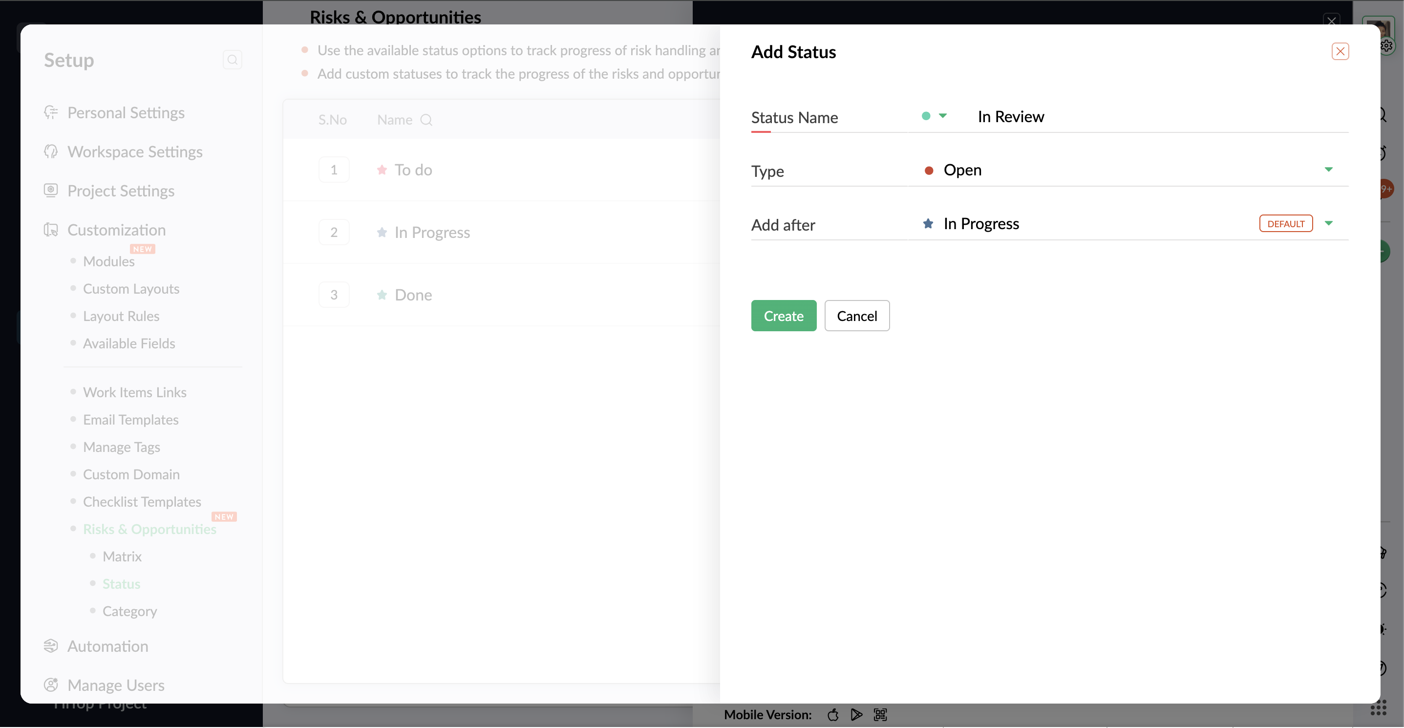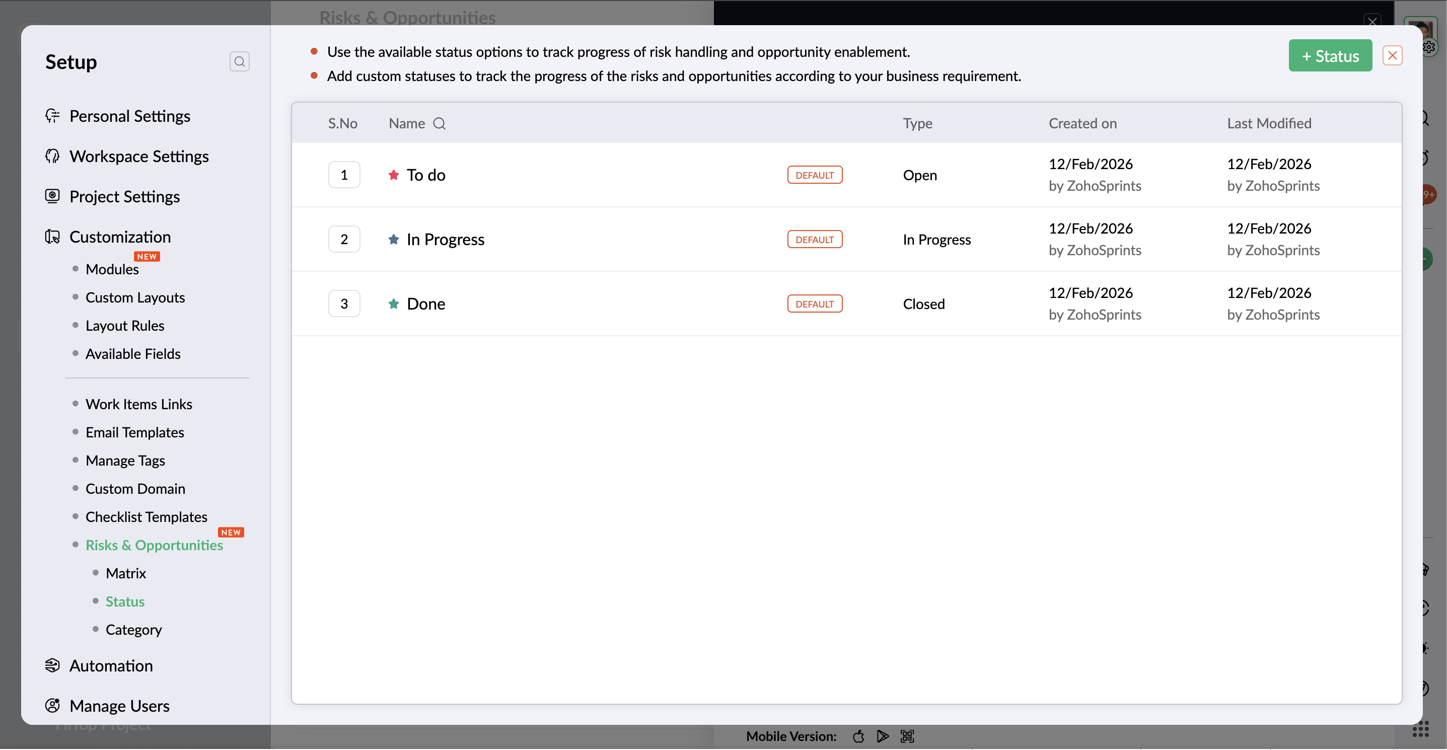 - If there are risks and opportunities associated to the status you are deleting, you need to move them to a different status before proceeding.