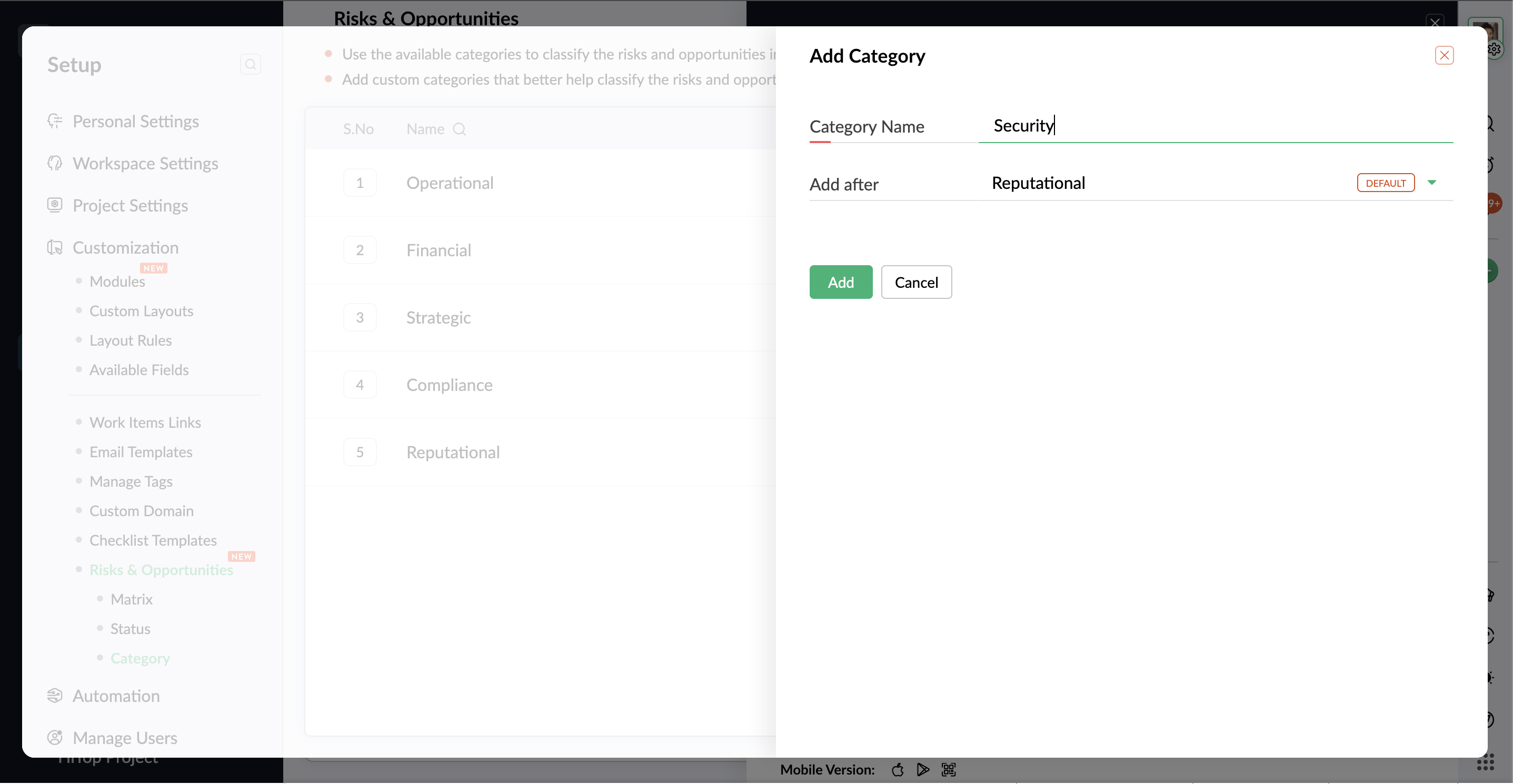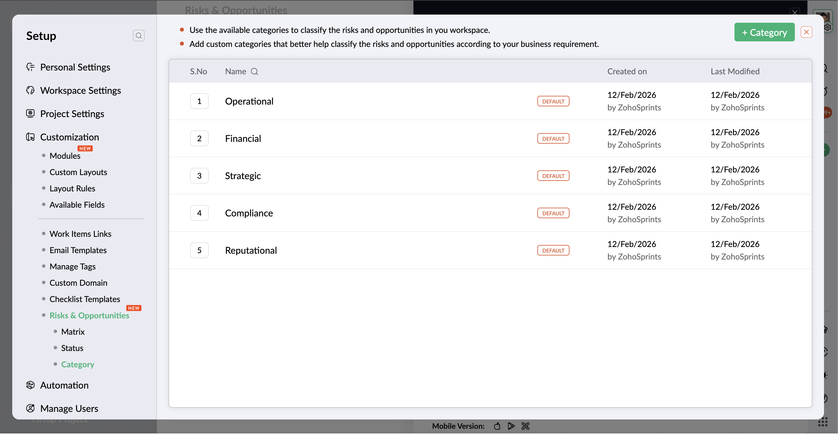 The default categories include: Operational, Financial, Strategic, Compliance, and Reputational. You can edit to customize these catergories to suit your org level requirement better. However, the default categories cannot be deleted.