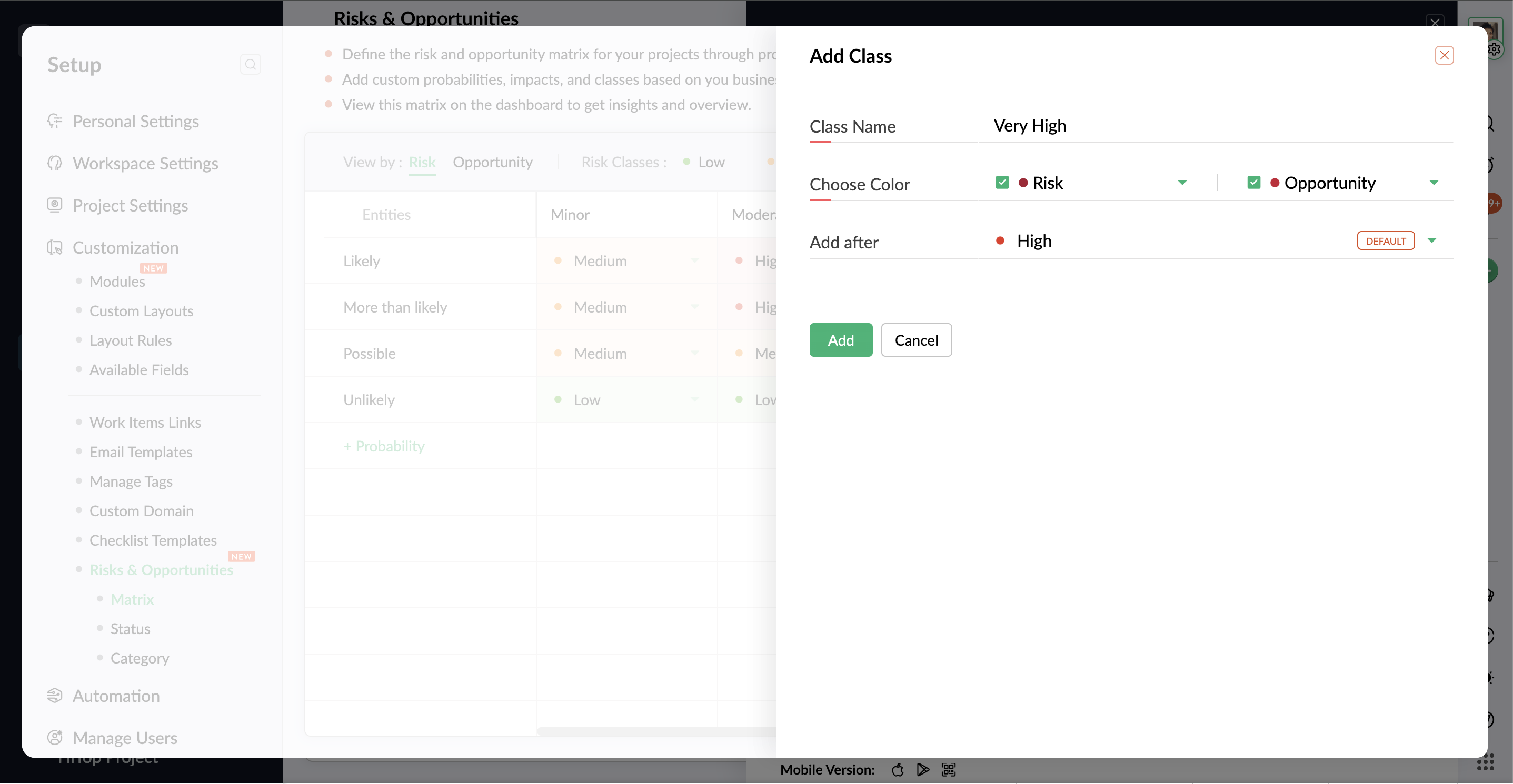 - Select both Risk and Opportunity to add the class to both matrices.