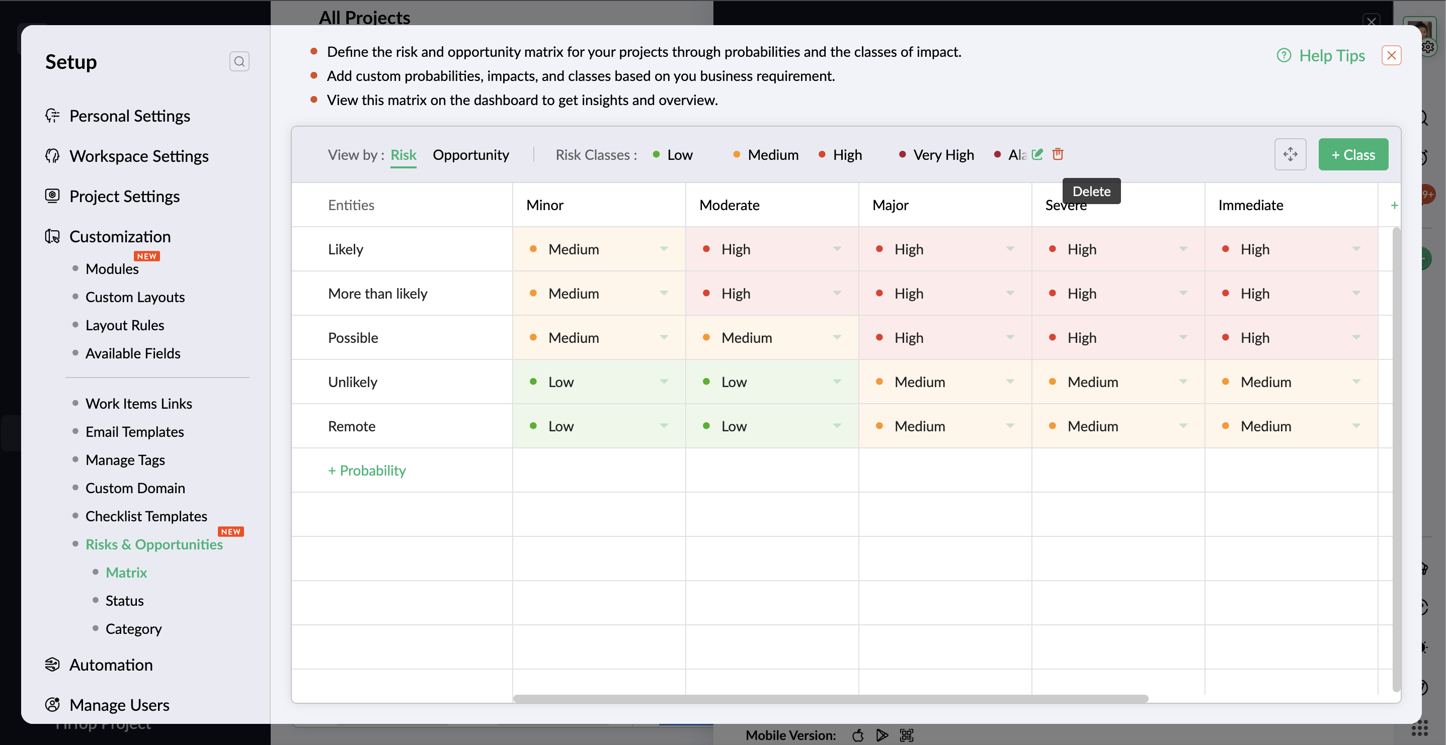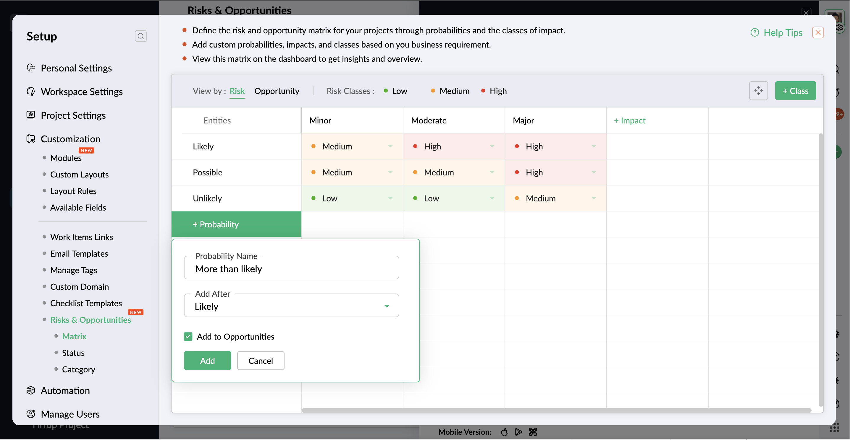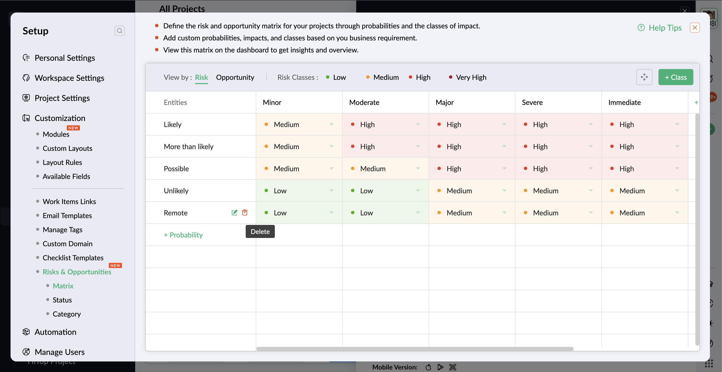 - If the probability is available in both risk and opportunity matrix, click the Remove button to delete the probability only from the risk matrix. The same applies to removing the probability from the opportunity matrix.