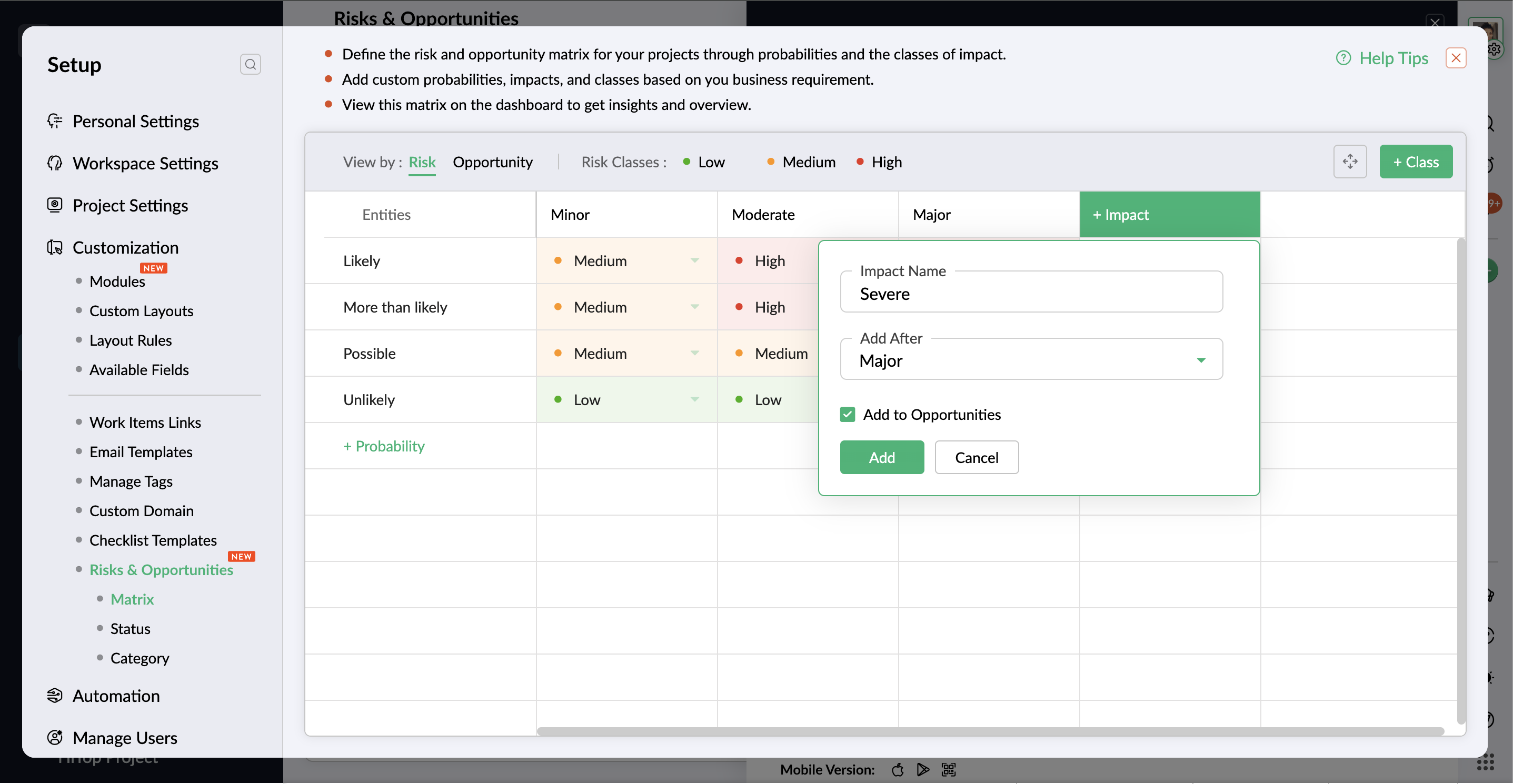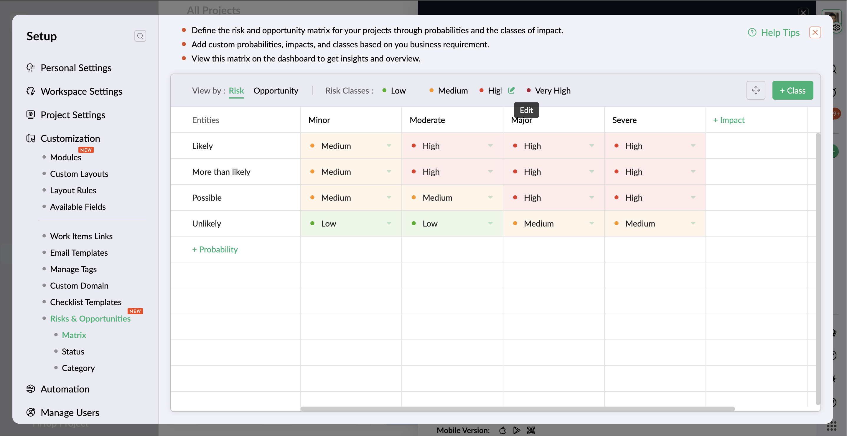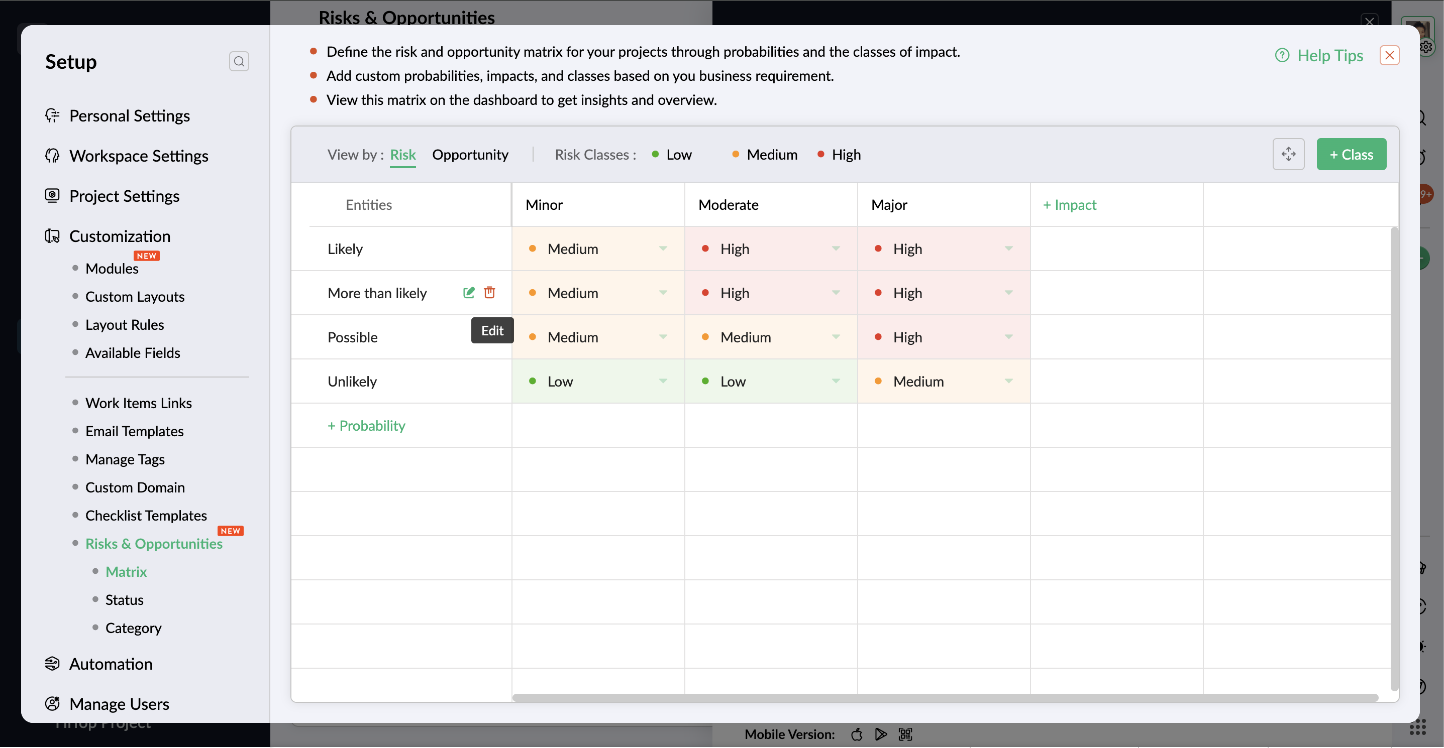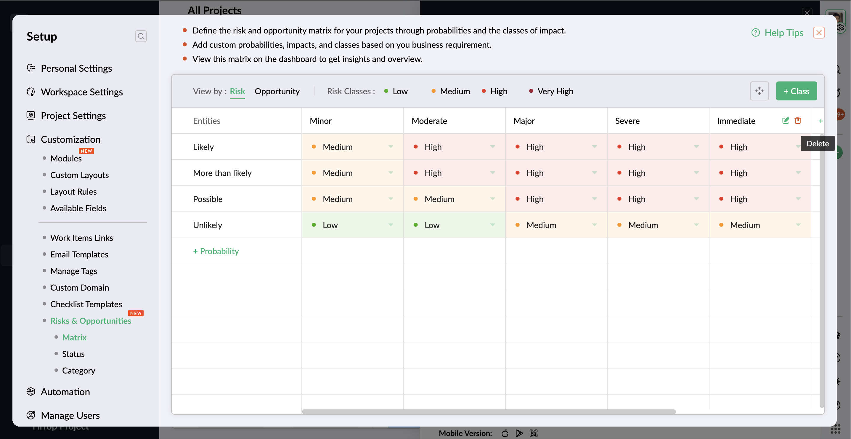 - If the probability is available in both risk and opportunity matrix, click the Remove button to delete the probability only from the risk matrix. The same applies to removing the probability from the opportunity matrix.