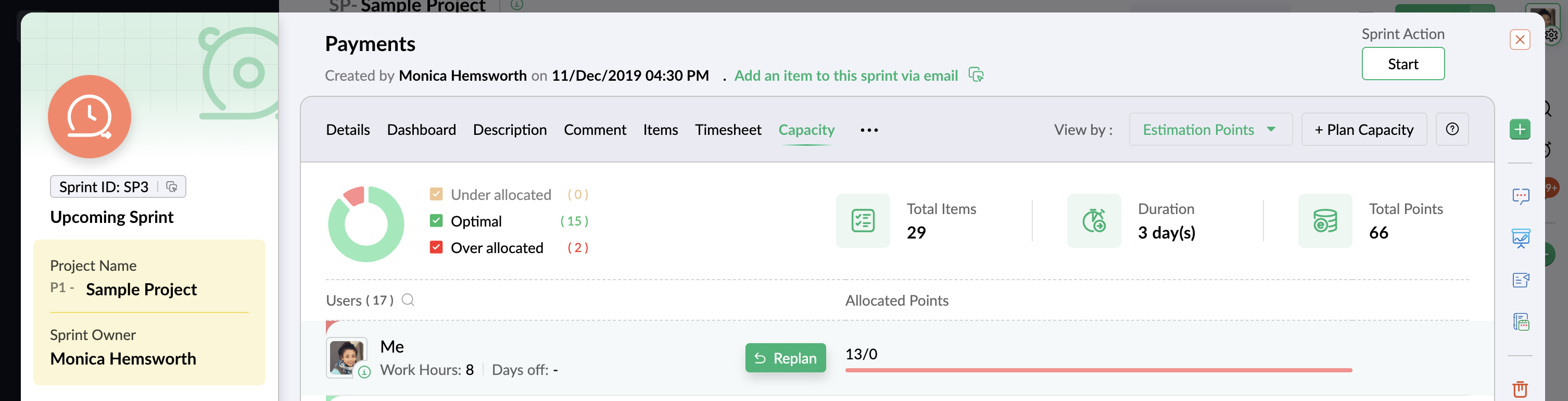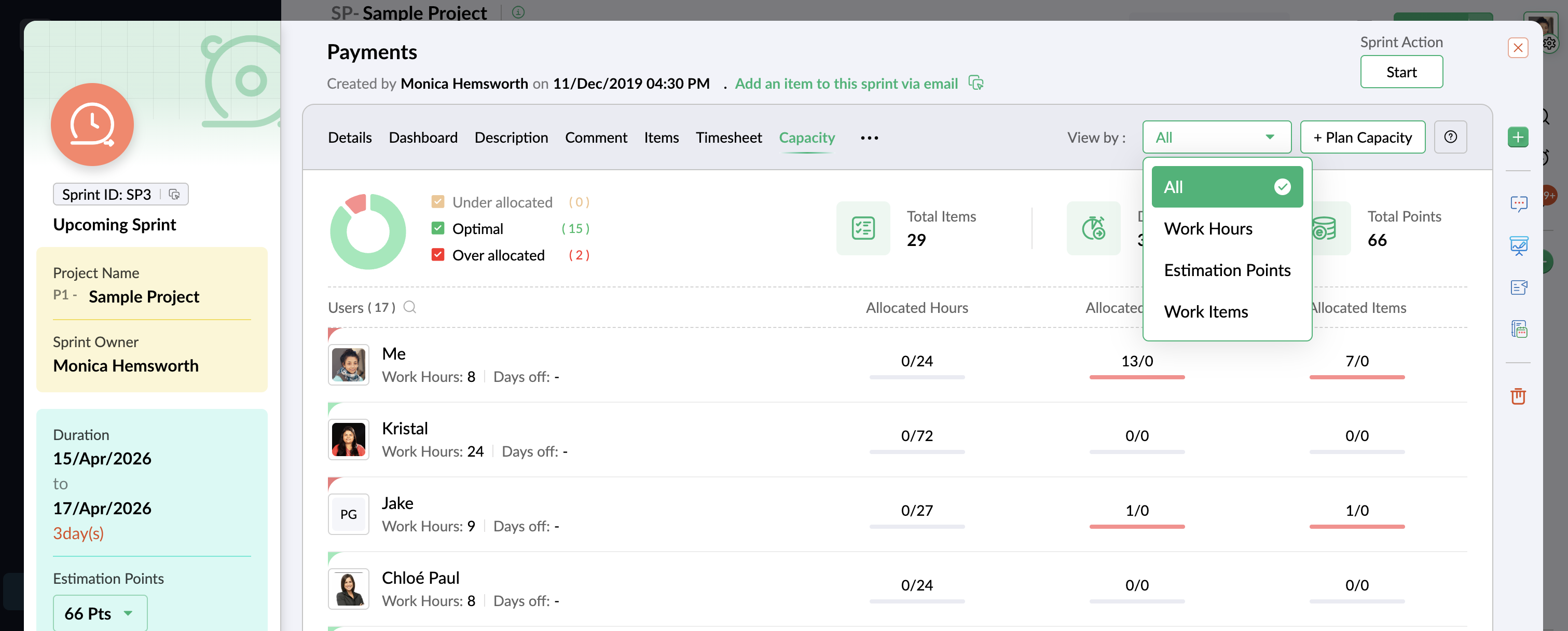 Sprint managers often spend significant time assigning users with work items. Sometimes, a user might be over allocated with work items while another user may not be assigned with any items. Verifying the users' existing work items and then assigning new items can be a time-consuming task. When users are under-allocated, their productivity may decrease. When users are over-allocated, their workload increases, leading to burnout and reduced work quality. To overcome this hurdle, Sprint managers can use the Capacity Planning feature. Assigning work based on user capacity helps maintain productivity, improves work quality, and ensures tasks are completed on time.